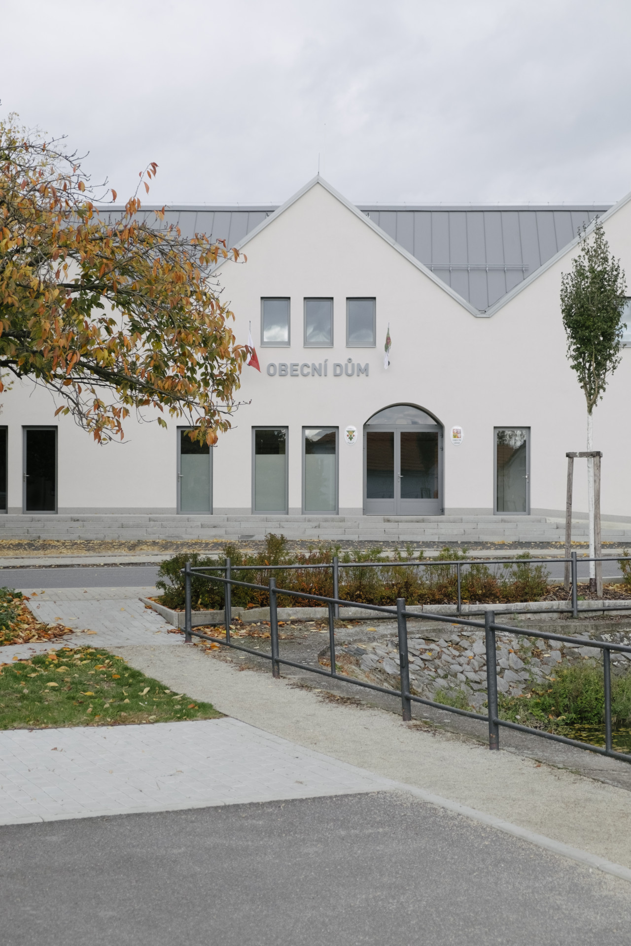 „Vysvětlovali jsme, že u obecního domu je potřeba, aby se otevíral směrem ven,“ říká architektka Markéta Zdebská. Hlavní průčelí se obrací směrem k vodní nádrži, která je hned přes cestu a dá se k ní posadit na lavičku. Z tohoto pohledu jsou patrné všechny hlavní rysy stavby, její dlouhá uliční fasáda se třemi štíty a obloukem, který zvýrazňuje hlavní vstup. Je tady taky nápis obecní dům a držáky na vlajky – to by měla mít ostatně každá budova s touto funkcí, je to otázka reprezentace.