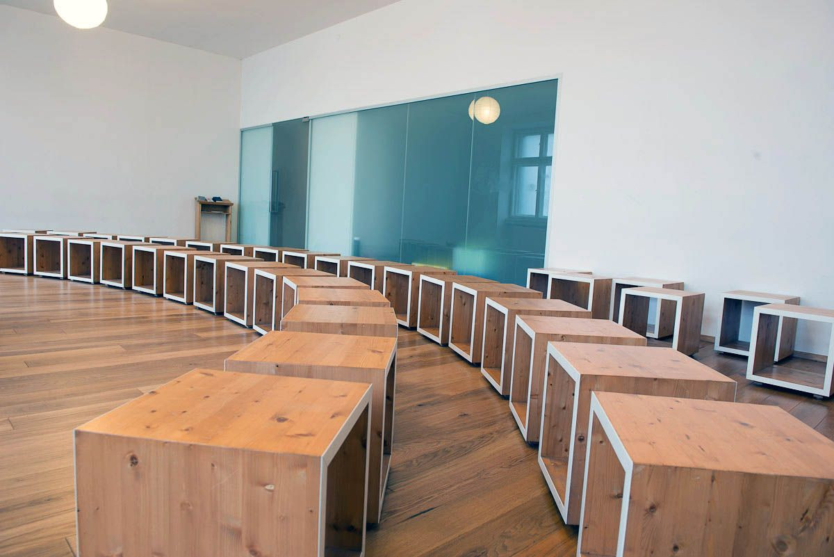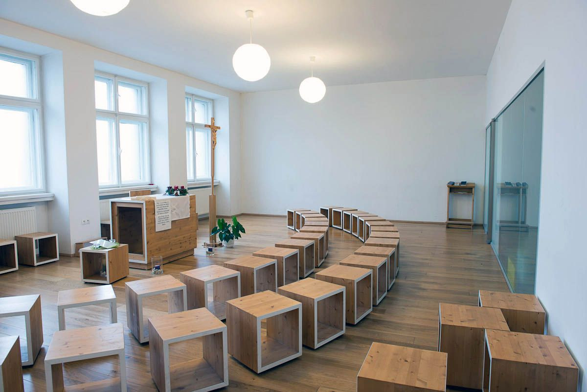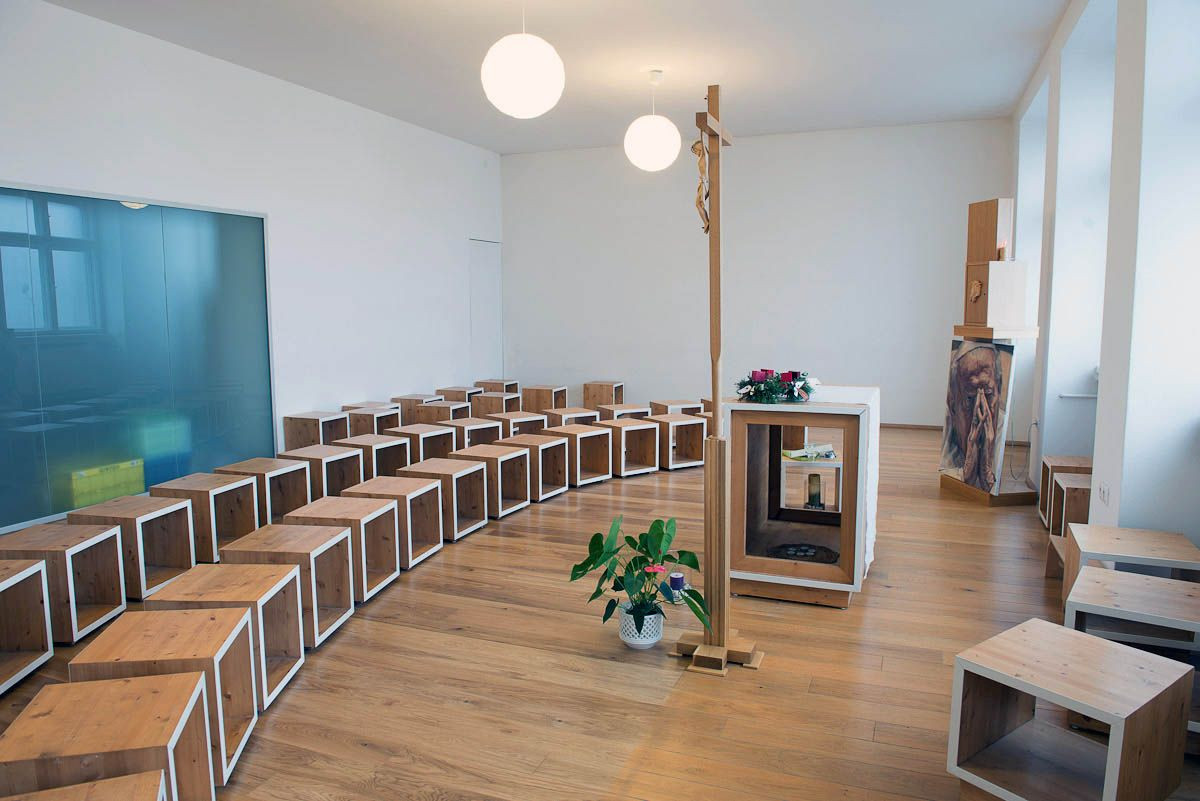 Sedenie kaplnky je zostavené z modulovateľných kubusov s variabilným umiestnením podľa obsadenosti a aktuálnej funkcie priestoru.,
