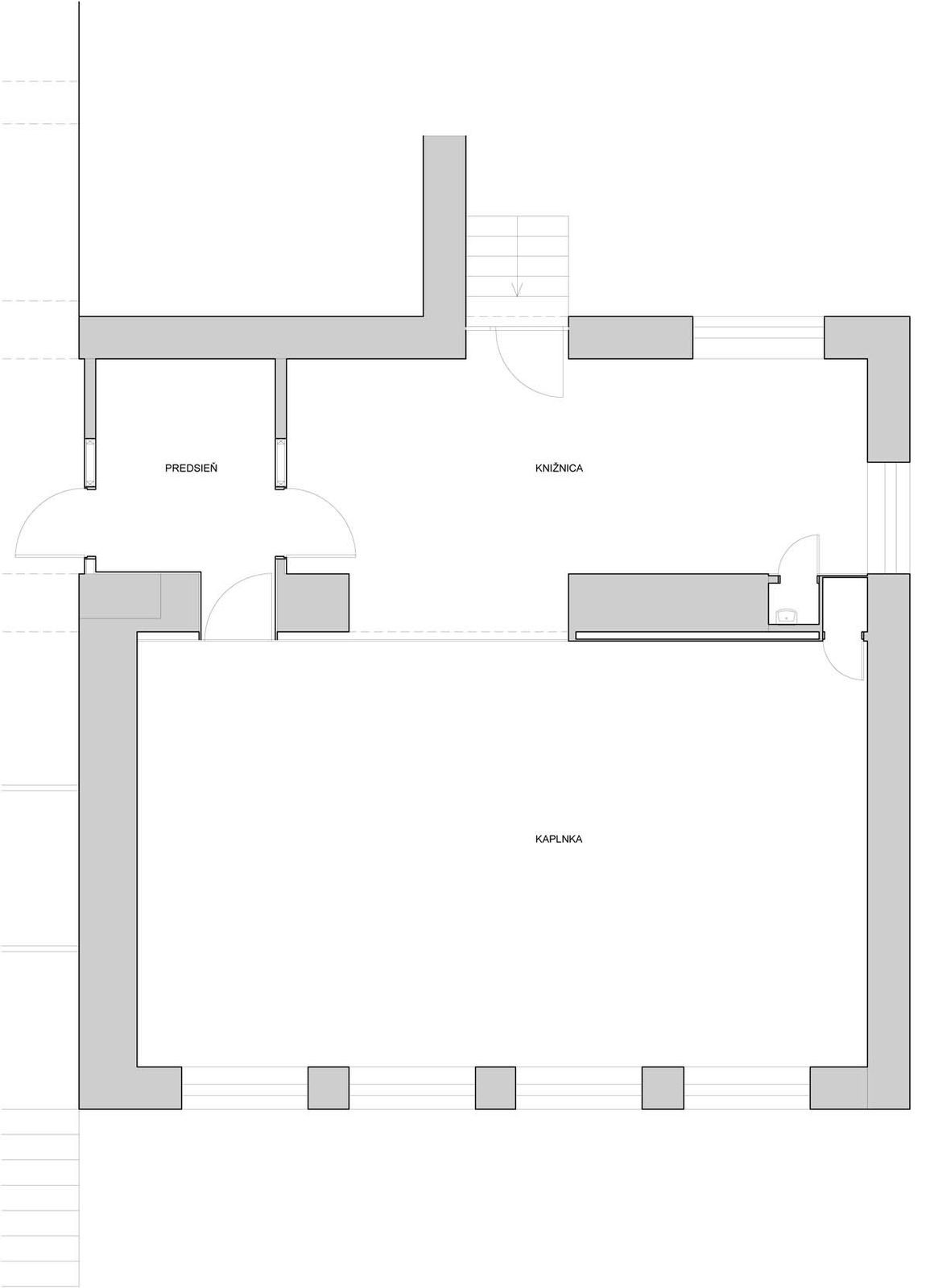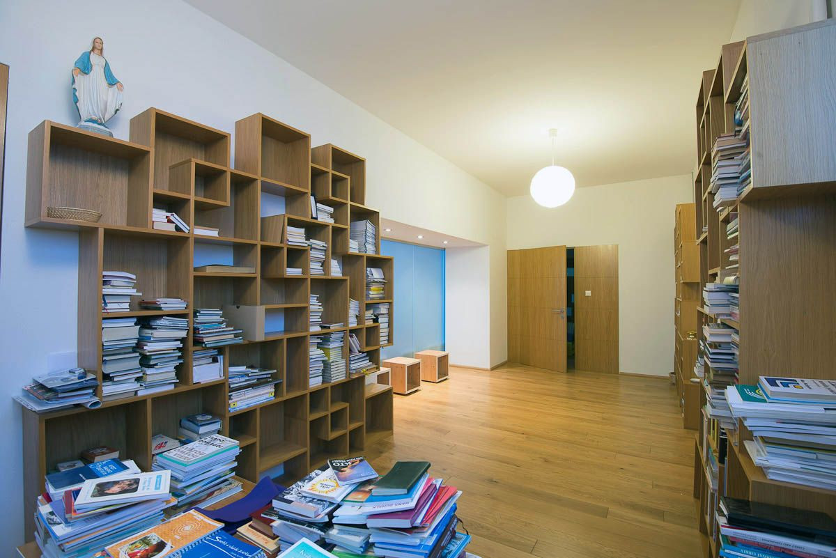 Pohľad do priestoru knižnice. Vpravo presklenie medzi kaplnkou a knižnicou. V budúcnosti priestor pre pulty individuálneho štúdia a počúvanie hudby,