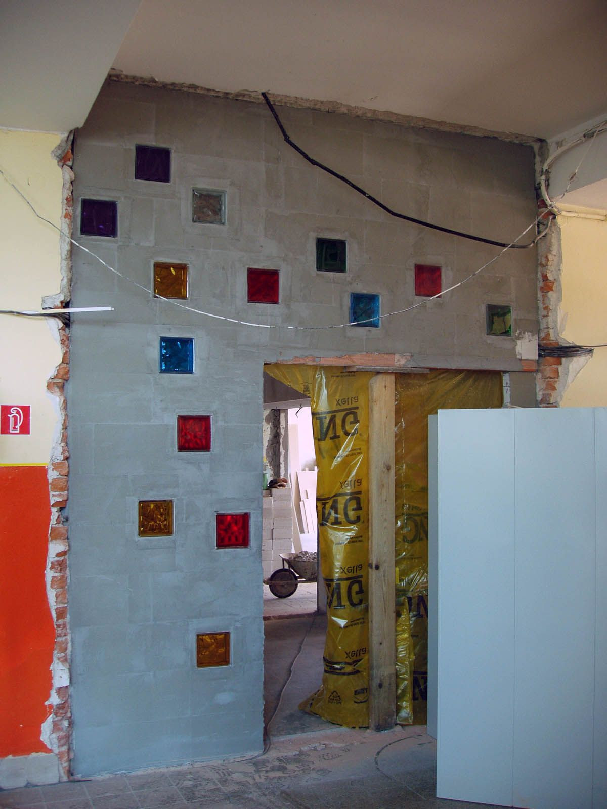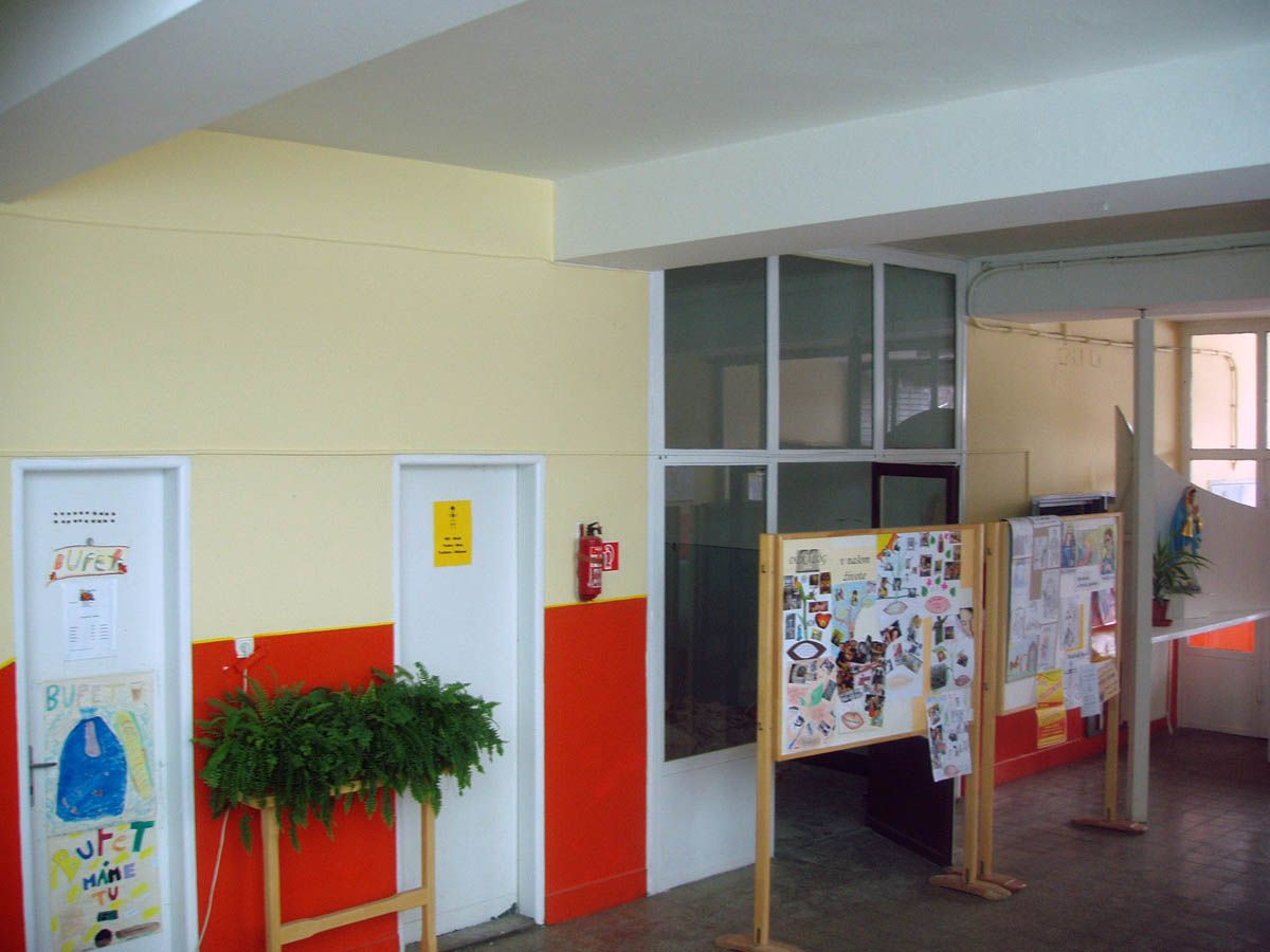Pohľad zo vstupnej haly školy. Pôvodný stav a stavebné práce.