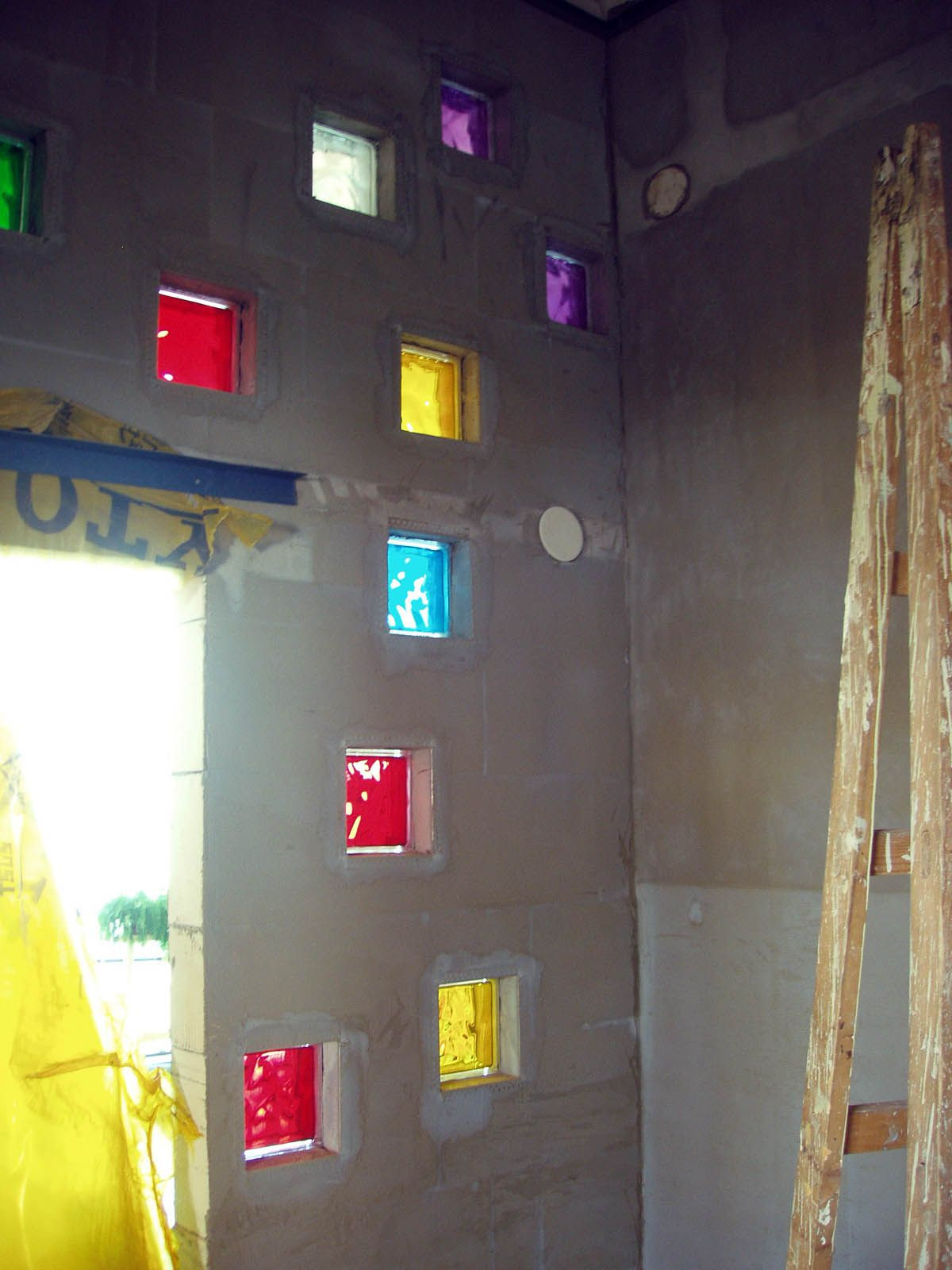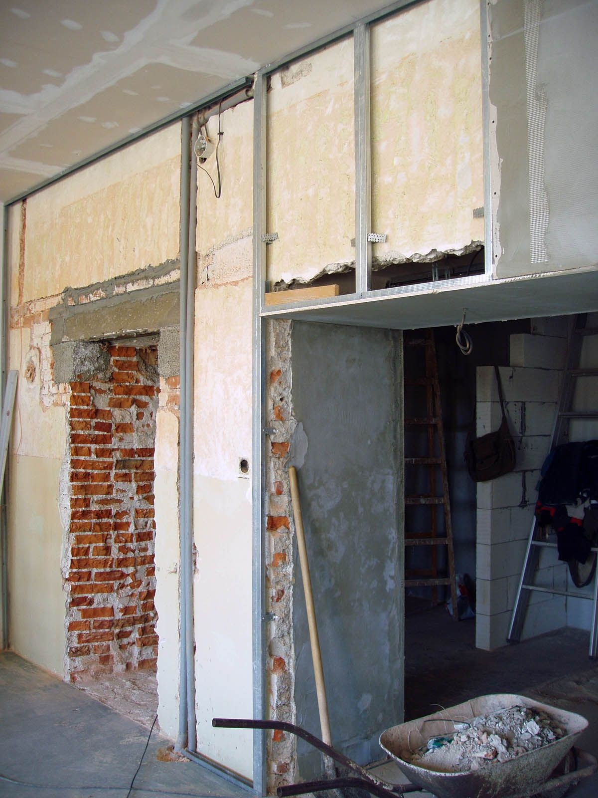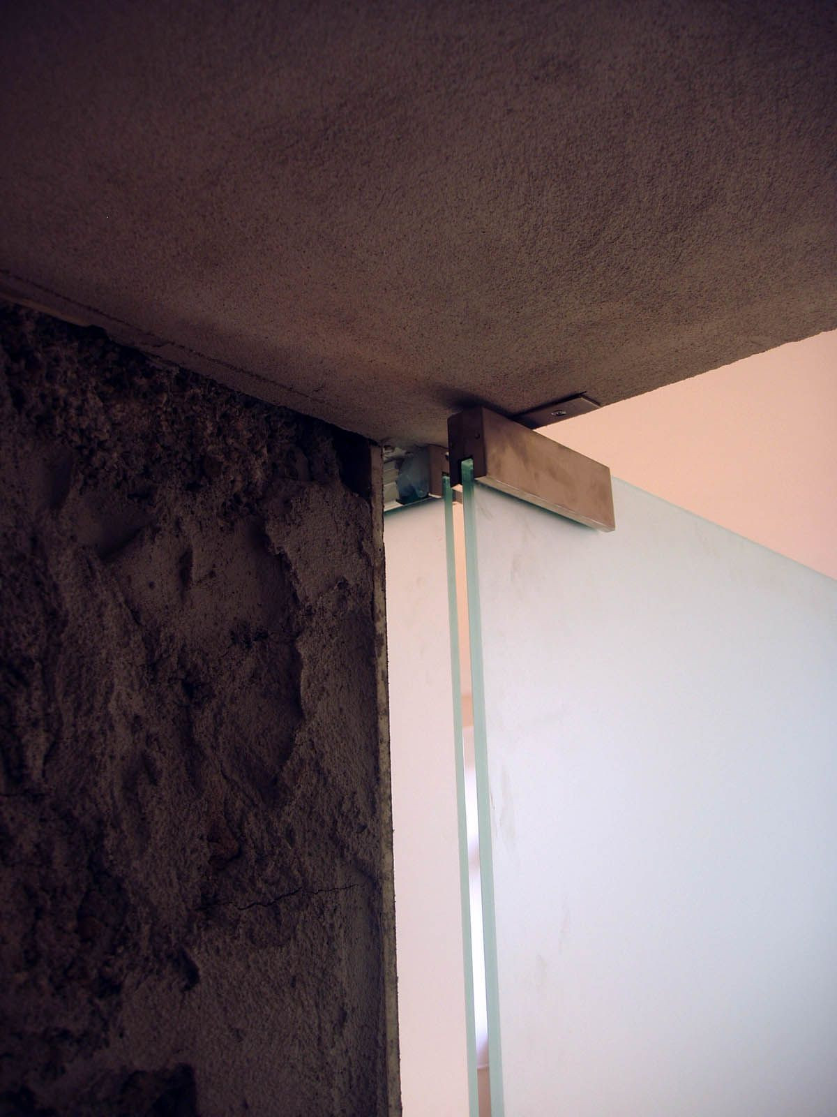 Kotvenie presklenných dverí. Foto pred montážou dreveného obkladu stien.