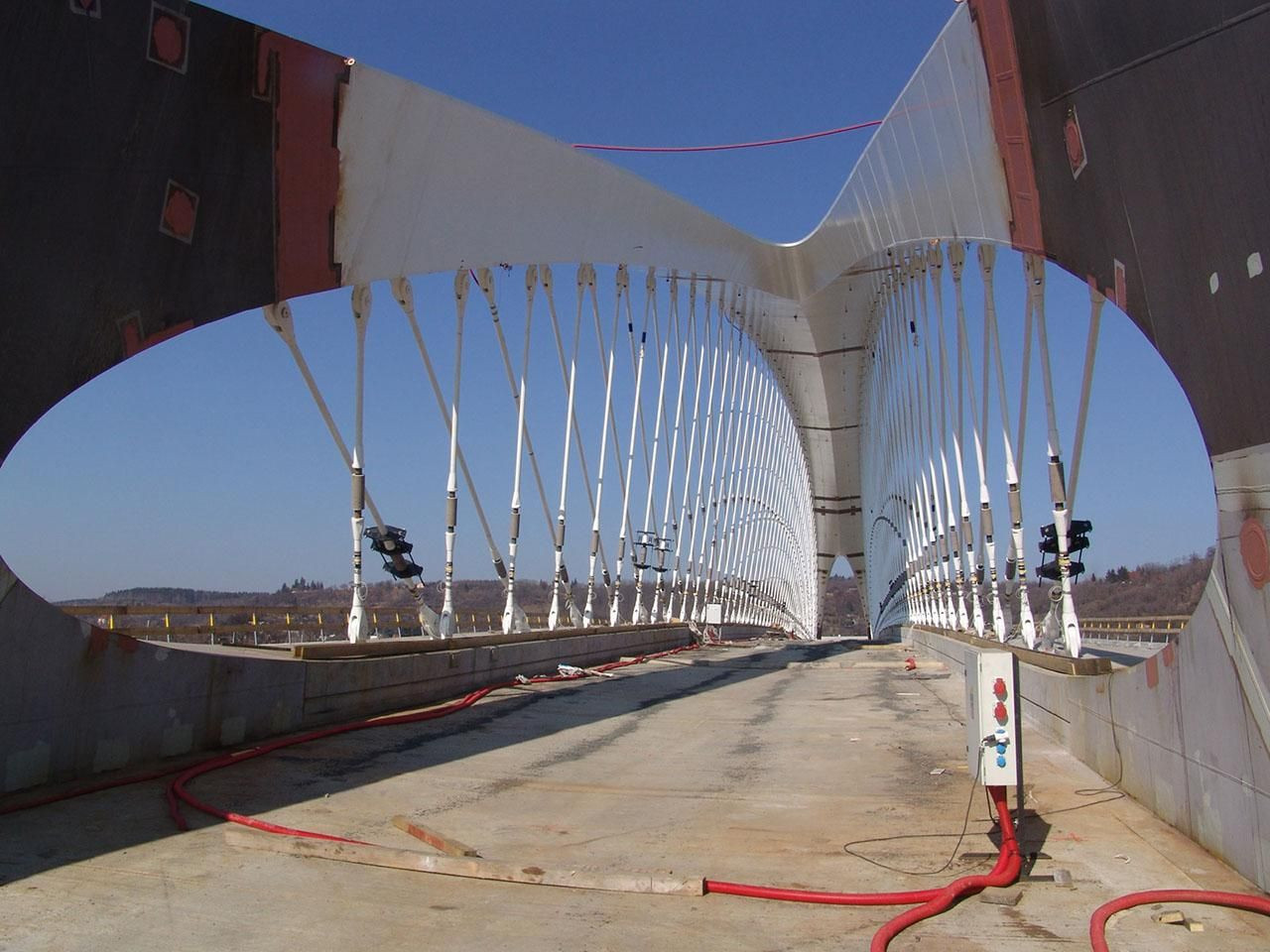 Následně montovaný ocelový oblouk je originální svým rozměrem i konstrukčním řešením. Dutý průřez má ve vrcholu oblouku šířku necelých 7 metrů a proměnlivou výšku v rozmezí 0.9 až 1.3 m. Směrem k podporám se průřez rozšiřuje a zvyšuje, asi ve čtvrtině rozpětí se pak dělí na dvě nezávislé části. Podélně i příčně předpjatou desku mostovky podporují prefabrikované příčníky. Tramvajový pás lemují ocelobetonová táhla s vnitřním předpětím, a oddělují ho tak od jízdních pruhů pro automobily. Tahové obloukové síly v mostovce jsou eliminovány podélným předpětím. „Most je krokem kupředu z hlediska použitých materiálů,“ vysvětluje Alexandr Tvrz, „staví se moderními technologiemi s využitím hydrauliky a dalších poznatků, při výstavbě byly použity například vysokopevnostní samozhutnitelné betony o pevnostech přes 100 MPa, kterými se betonovaly vnitřky ocelové konstrukce v zárodcích oblouku, a také v oblouku bylo použito speciálních tříd oceli, a podobné je to i se zvolenými závěsy. Jsou to oceli velmi složité na svařitelnost, protože obsahují příměsi, které se nedají svařovat standardním způsobem. Bylo také problematické najít dostatek kvalifikovaných svářečů, kteří mají zkoušky na typ svárů, které se v mostním stavitelství tak často nepoužívají. Problematické byly ze stavbařského hlediska i šikmé závěsy, kterých je na mostě 200 - ty jsou vyrobeny v Anglii, stejně jako odvodnění mostu, protože v ČR není výroba těchto materiálů standardem, nedělají se tu běžně. A takových věcí je na tomto mostě několik..." Mostní konstrukce dostane svoji finální podobu po montáži ocelových chodníkových konzol, zábradlí a dokončení kompletního příslušenství. Tramvajový provoz by měl započít na podzim letošního roku, do plného provozu bude most uveden až při kompletním dokončení projektu Blanka, to by mělo být v první polovině roku 2014.