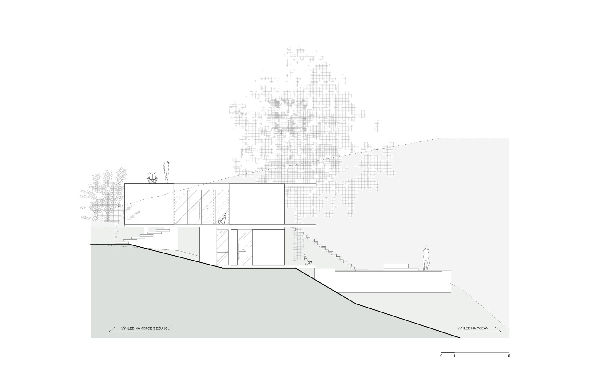 Patro s ložnicemi je dole a opírá se o svah. V zadní části bez oken je prostorná prádelna s technickým zázemím. Ložnice jsou menší, mají však „výhled za konturu oceánu i hranice fantazie,“ jak to architektka popisuje. Na oceán je vidět i z koupelny, z ložnic i z koupelny je také přímý přístup k bazénu, dlouhému deset metrů.