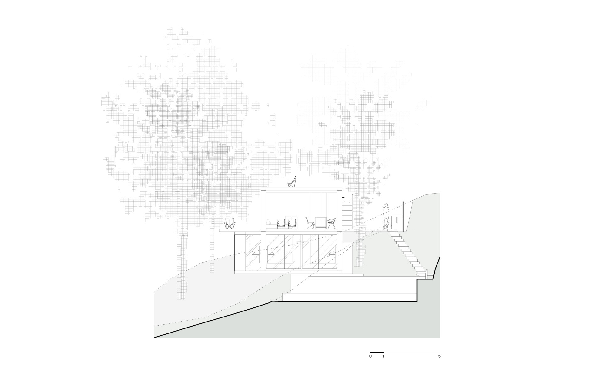 Nejlepší vyhlídku člověk získá, když po ocelovém schodišti vystoupá na střechu. Tady se dá pozorovat západ slunce. Když se setmí, na obloze se objeví hvězdy a podobný „hvězdný“ efekt dělá i perforovaný plech v kuchyni a ložnicích. „Společně s výhledem na skutečnou hvězdnou oblohu se celek i jednotlivé prvky domu propojují s okolím, nebem a s Universem,“ popisuje to Dagmar Štěpánová. Žít tady podle ní znamená zažívat každý den „souznění architektury a místa.“