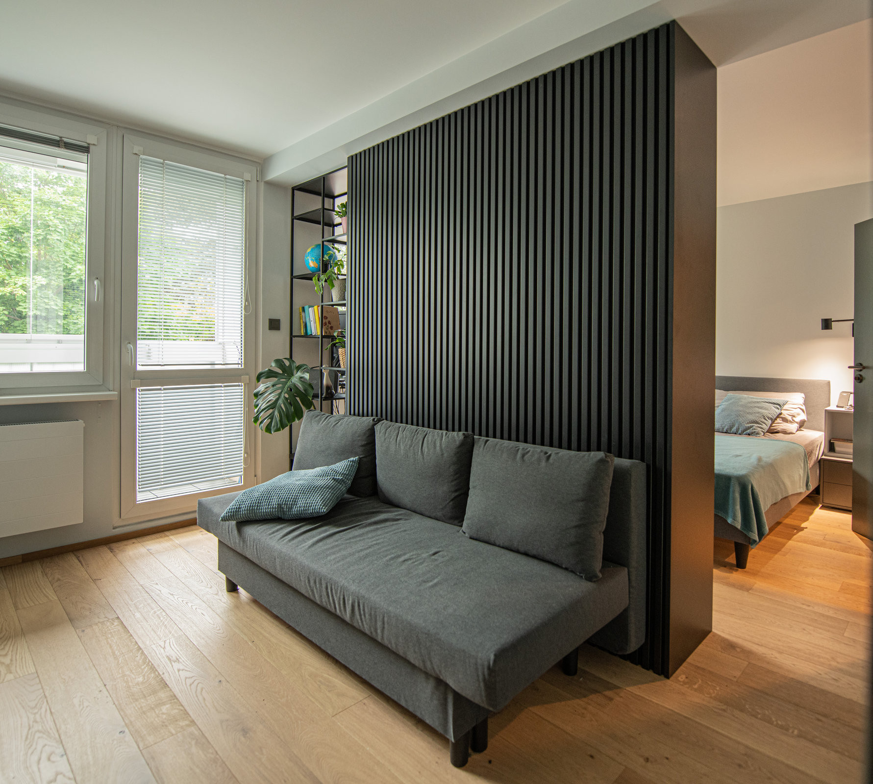 Po patnácti letech od posledních úprav působil byt v panelovém domě zastarale a nevyhovoval představám klientů. Proto se rozhodli oslovit architektku Markétu Janderovou s přáním na kompletní rekonstrukci tak, aby měli oba dostatek soukromí a zároveň pohodlný společný prostor.