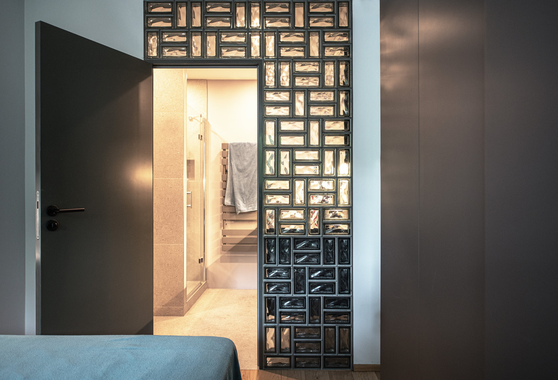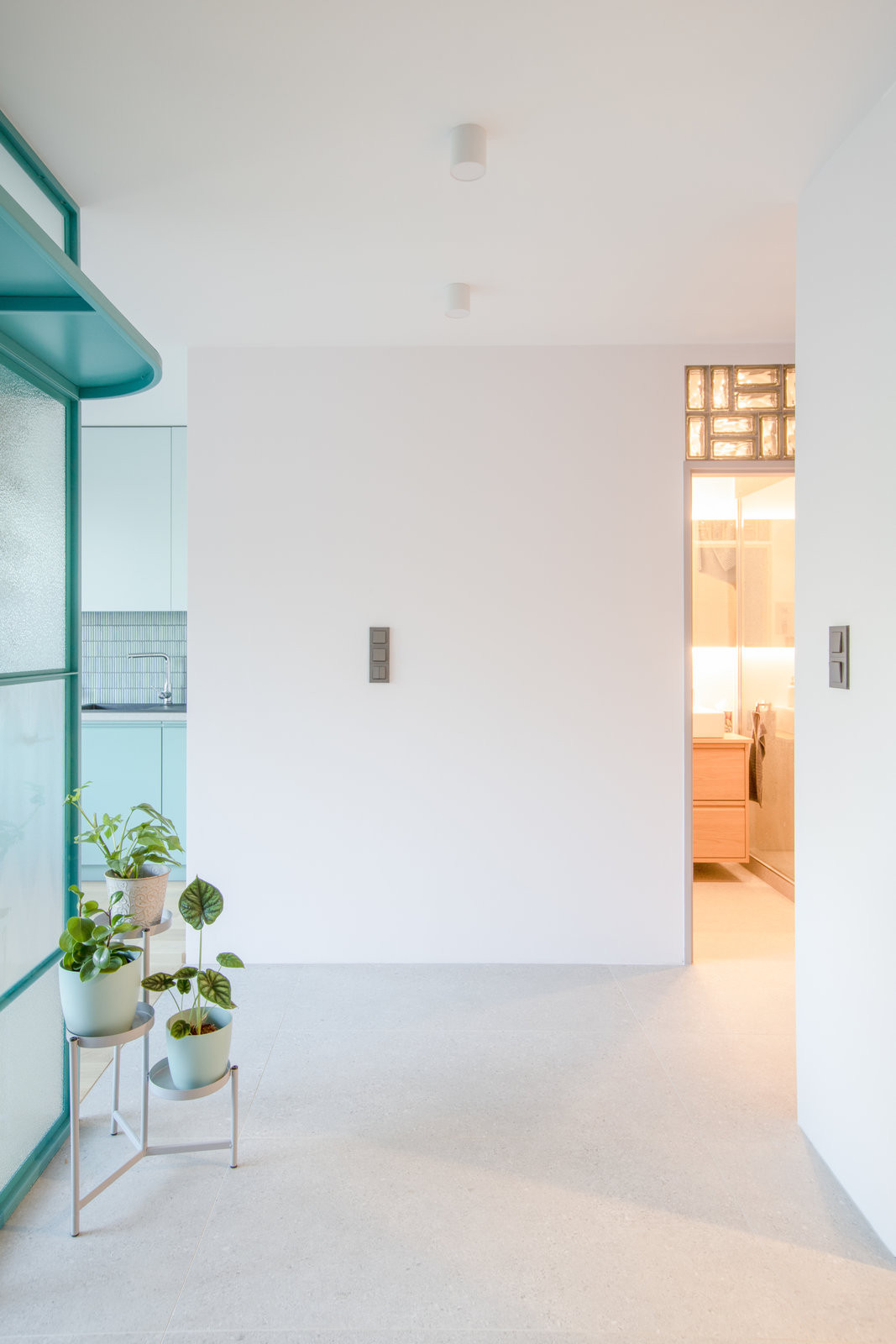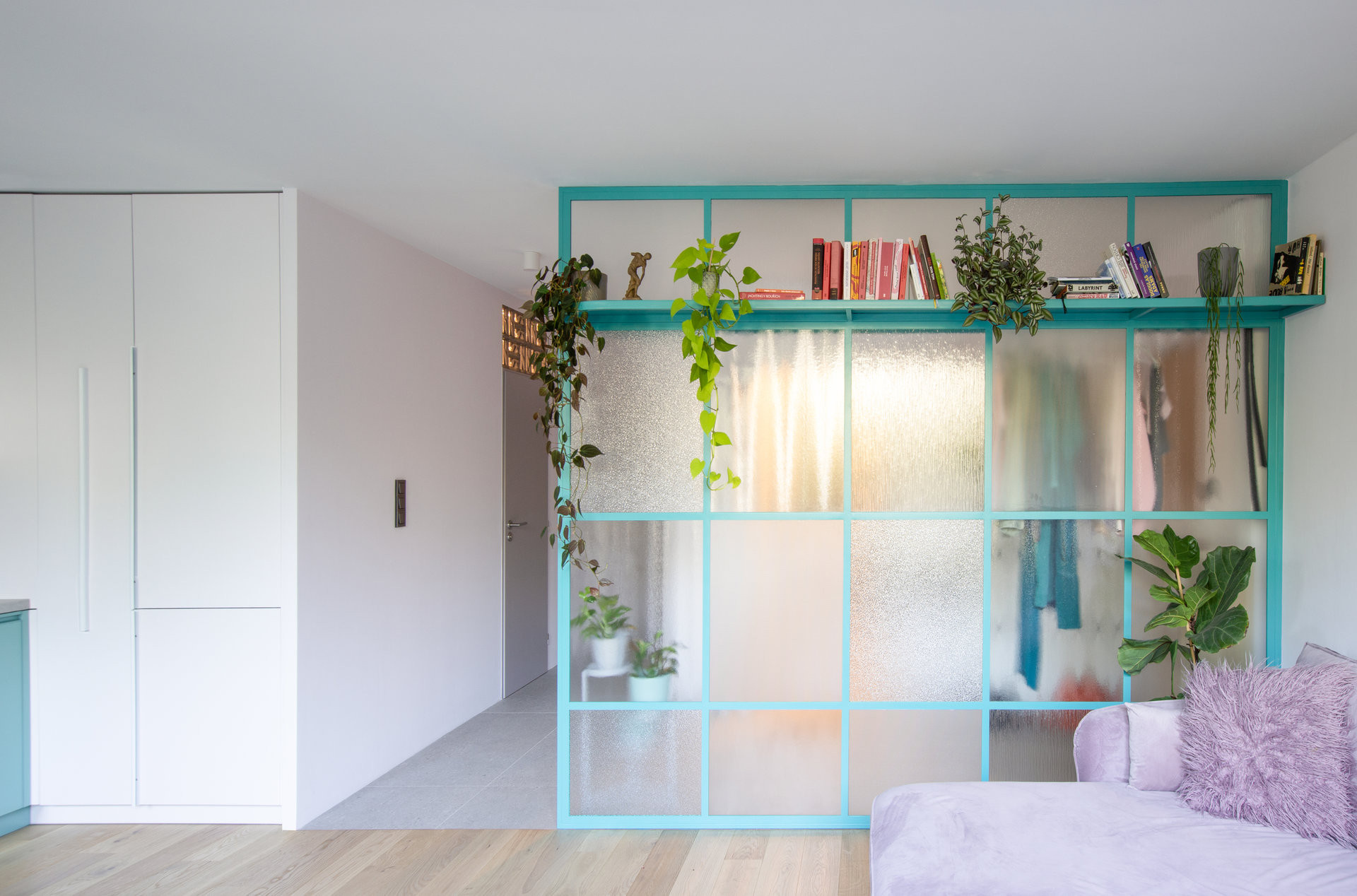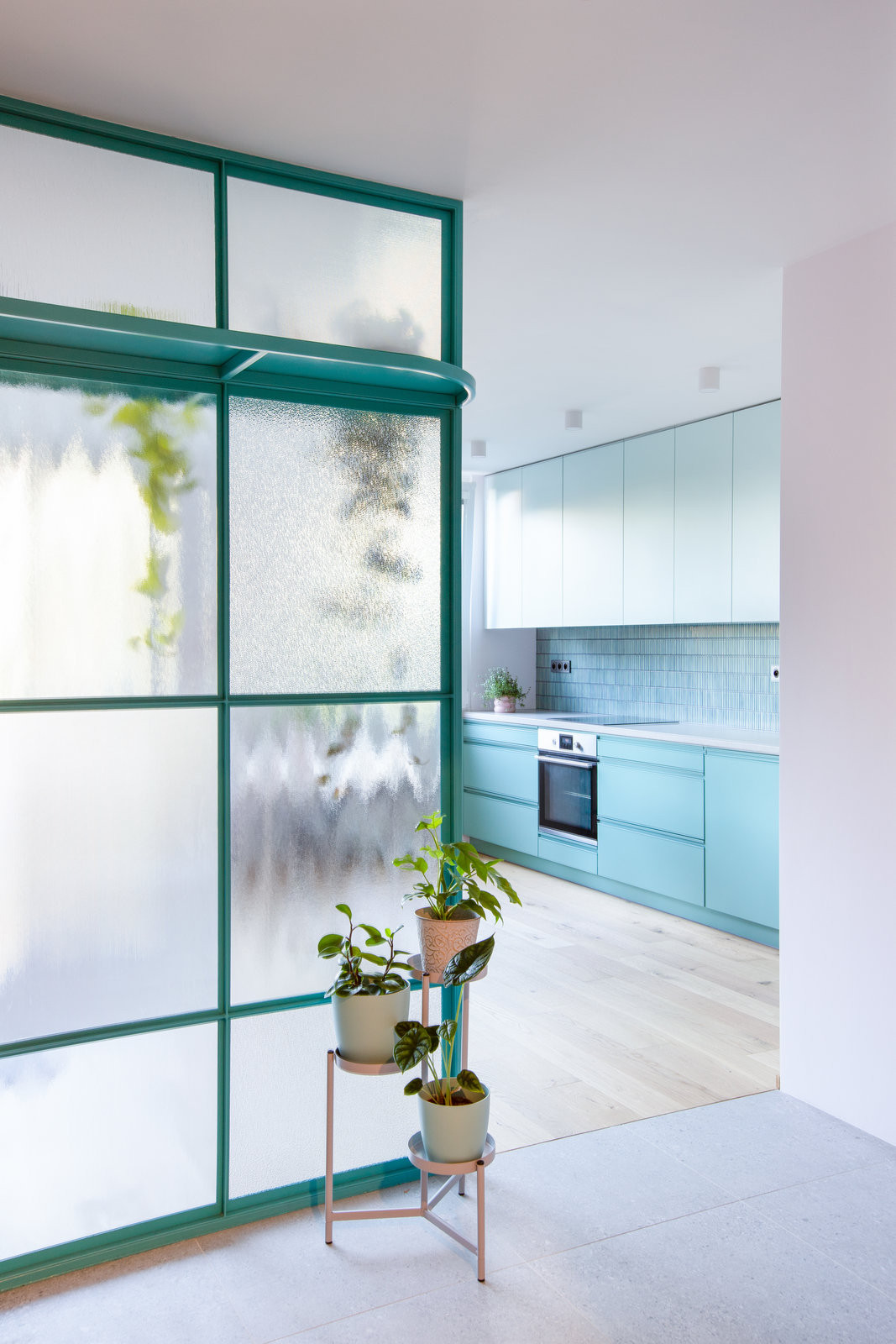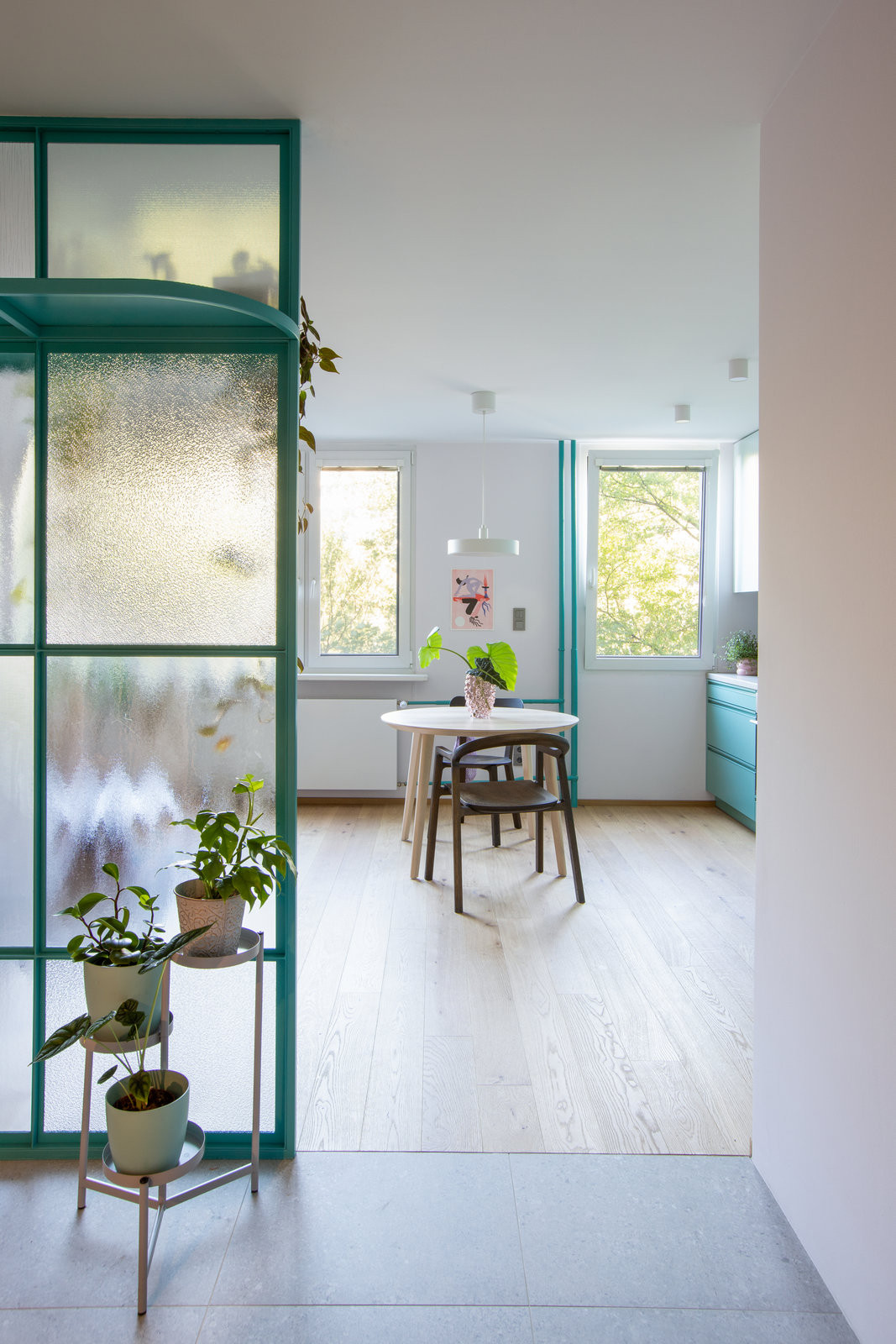 Byt je celkově světlý, pokoje jsou orientovány na východ a západ. Architektka navíc do středu dispozice přivedla denní světlo pomocí luxfer a prosklené příčky mezi obývacím pokojem a vstupní chodbou. Příčka se stala jednou z dominant nového prostoru. Také její konstrukce je řešena v tyrkysové barvě a vyplněna je tabulkami tlačeného skla. Mimo to, že do interiéru přináší více světla, funguje díky šatní tyči a polici i jako odkládací prostor.