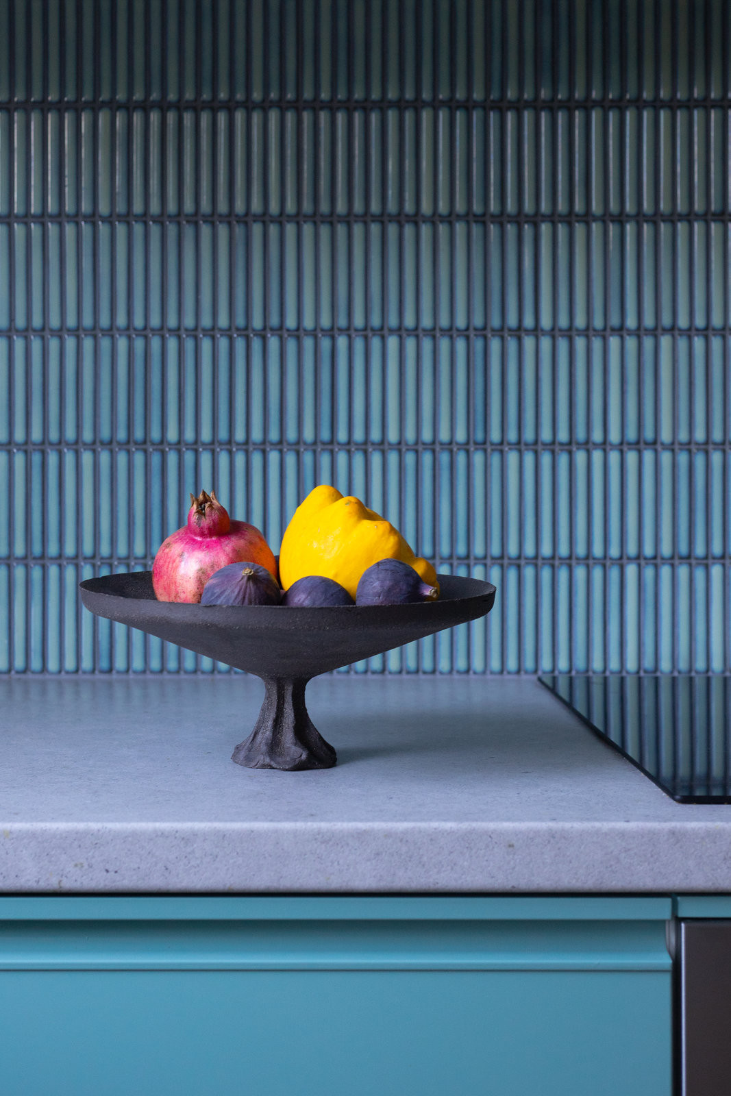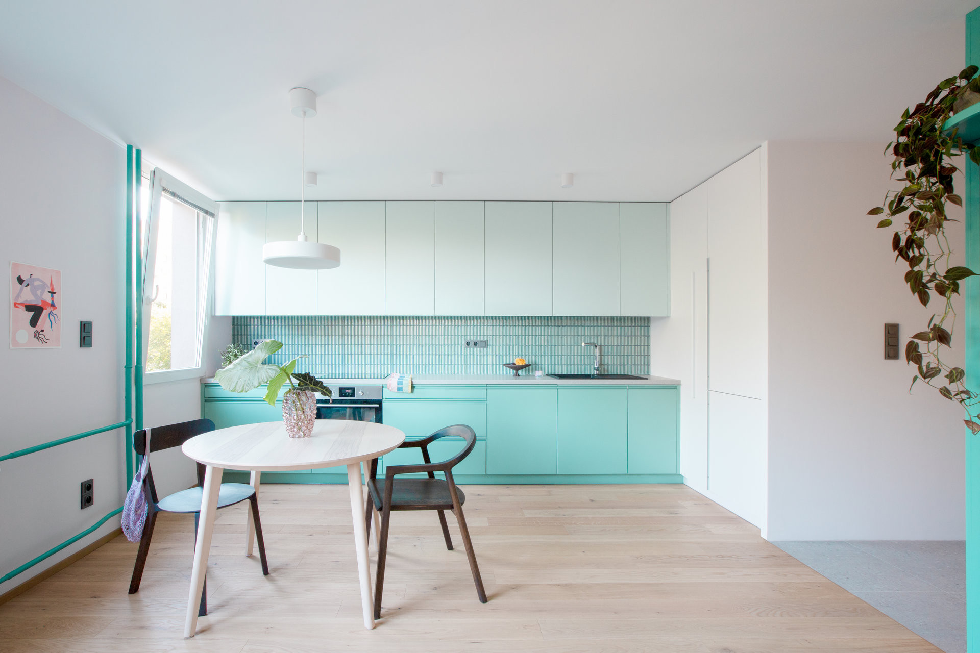 Hlavním setkávacím místem bytu se stal prostorný obývací pokoj s kuchyňským koutem, který vznikl odstraněním příčky. „Kuchyň je přesně v barvě oblíbené šály klientky.