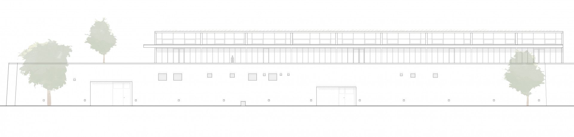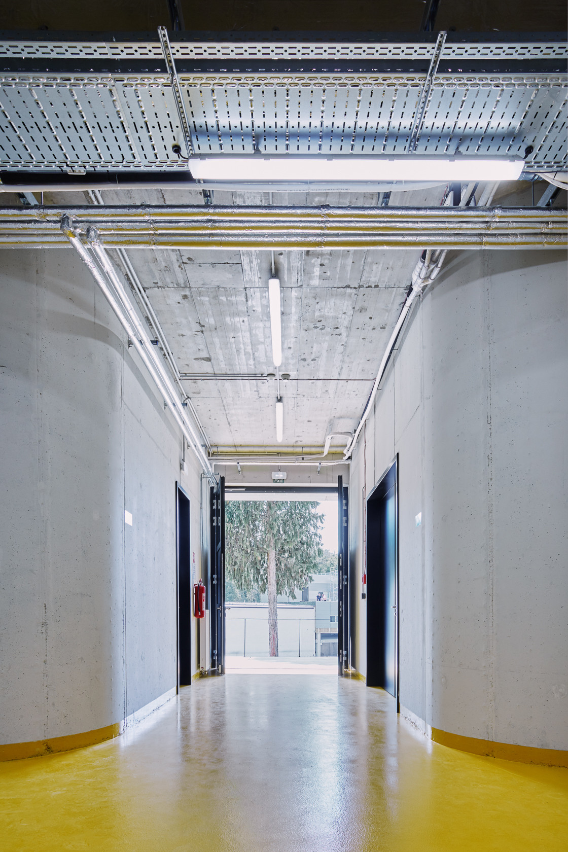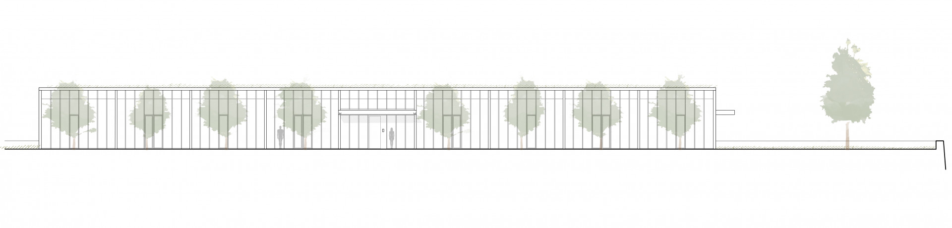 Budovu charakterizuje výrazná kovová konstrukce s velkými plochami zasklení. Architektonický výraz určuje pravidelný rastr černých okenních rámů. Zasklení na celou výšku místnosti prosvětluje halu ze strany nádvoří a umožňuje velmi úzký kontakt mezi vnějším a vnitřním prostředím. Sytě žlutá podlaha z probarvené epoxidové stěrky v hořčičném odstínu tak při průhledu budovou kontrastuje s dlažbou nádvoří i přilehlými travnatými plochami.