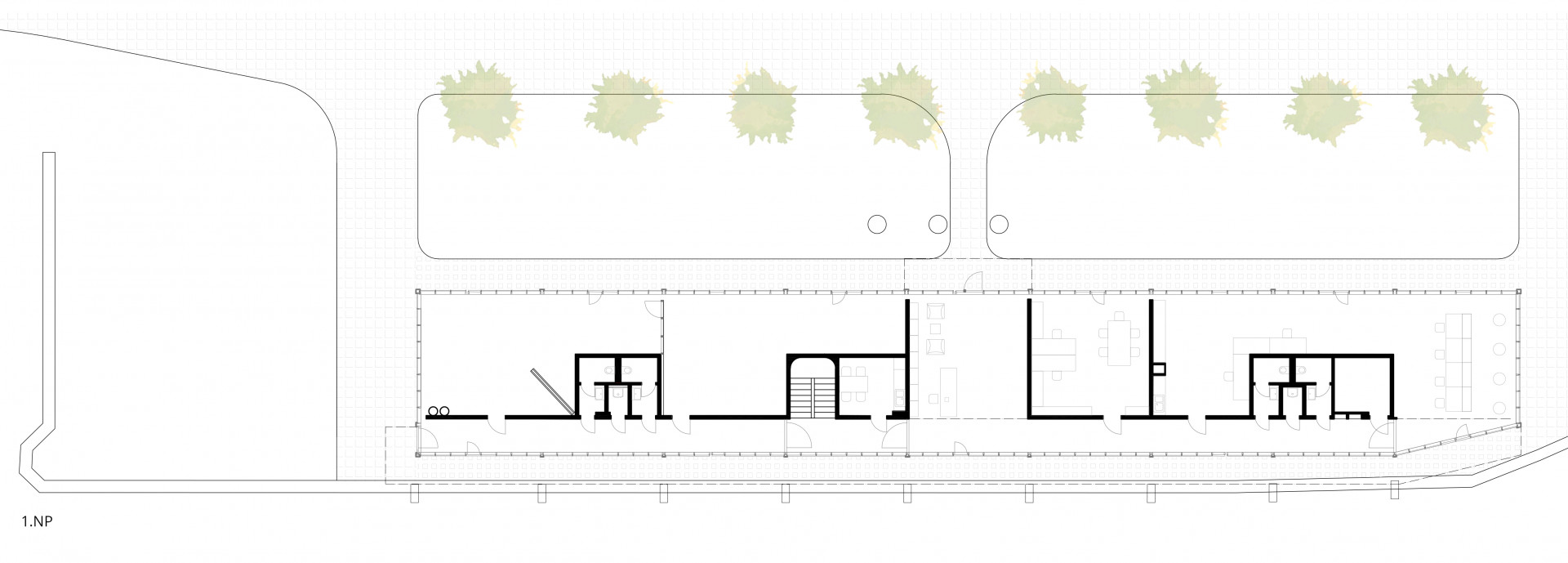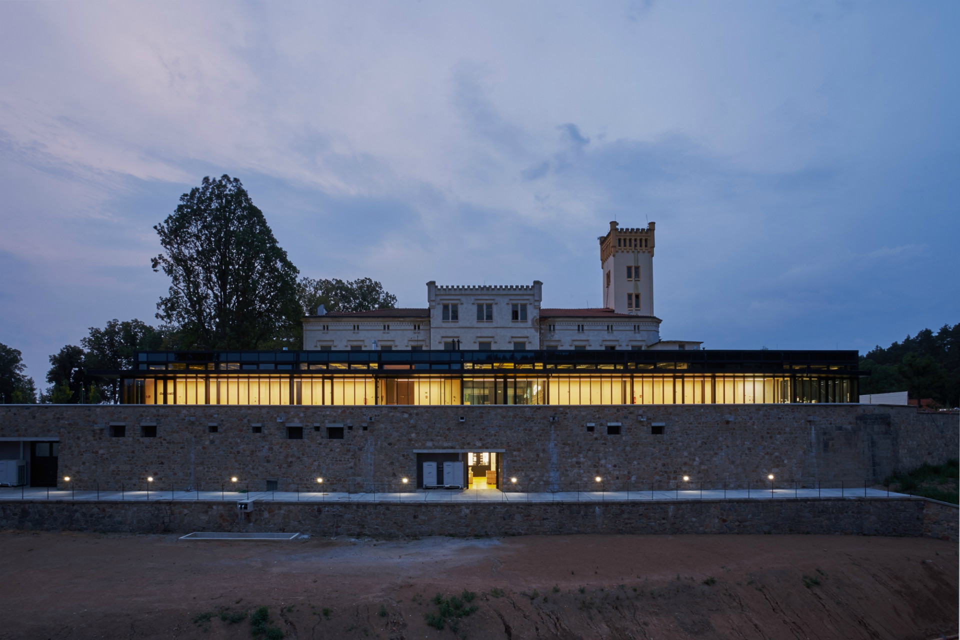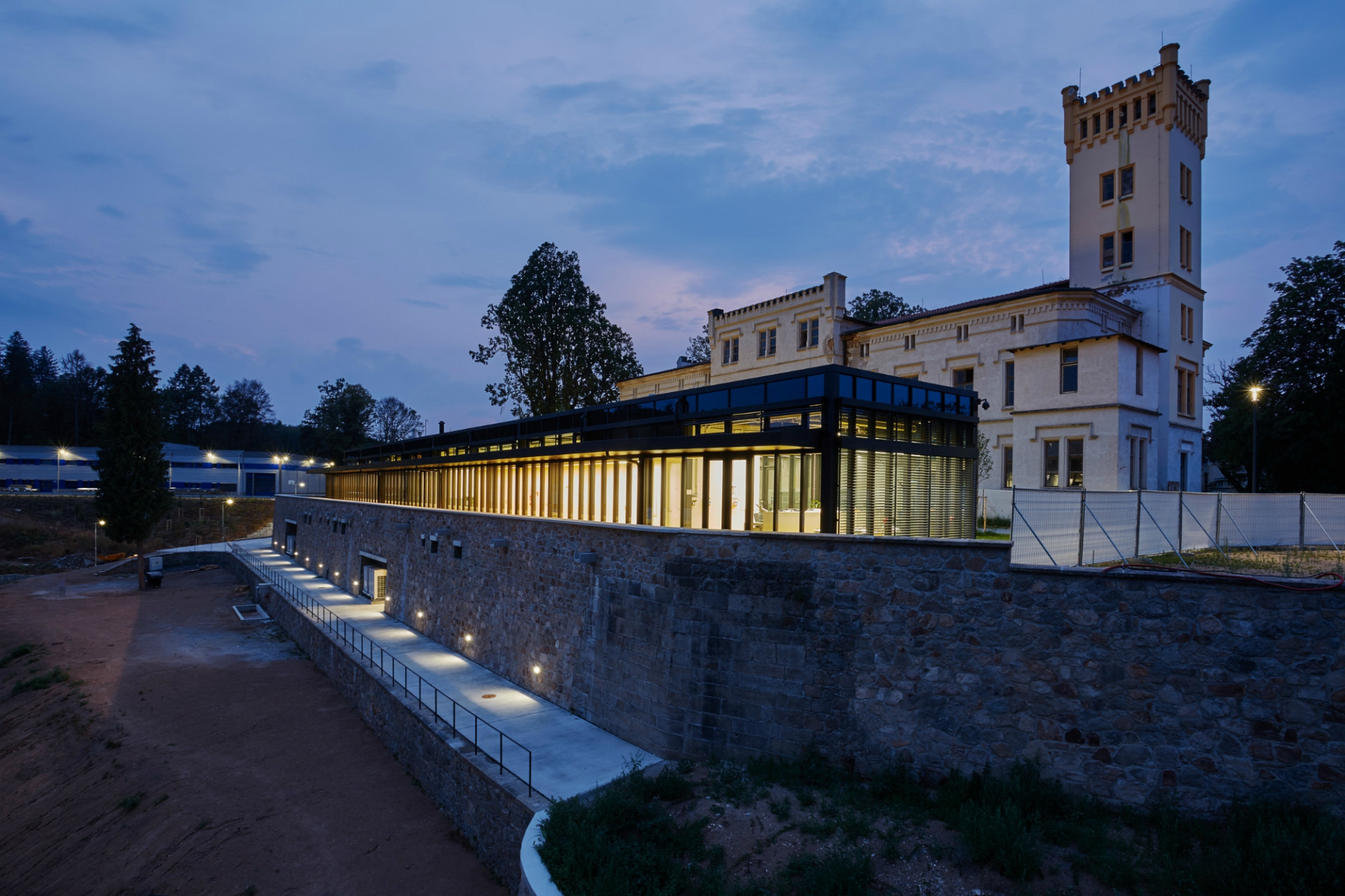 Ačkoliv směrem od zámečku působí budova jako přízemní, ve skutečnosti ji tvoří dvě podlaží – část objektu s hlučnými technologiemi bez potřeby denního světla totiž architekti umístili do podzemí. Suterénní podlaží tak vzniklo za historickou kamennou hradbou. V nadzemní prosklené části se pak nacházejí čisté laboratoře spolu s administrativními prostory. Hmota „skleníku“ logicky sleduje hranu hradeb a uzavírá prostor terasy. Nově vymezuje intimnější nádvoří mezi novou a historickou budovou.