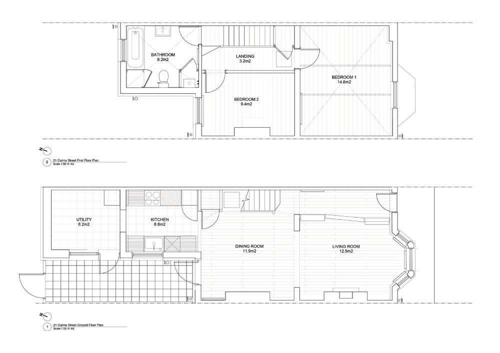 Domy na Cairns Street byly postavené okolo roku 1900. Jak bylo v té době typické, mají nepórovité a neizolované cihlové zdi s dřevěnými trámy, původně zakrytými břidlicovými taškami. Každý z domů má výklenek s pískovcovým ostěním a přístřeškem. Materiálově je definují dva základní prvky: nosné zdi jsou cihlové, střechy, podlahy a ostatní zdivo je dřevěné.