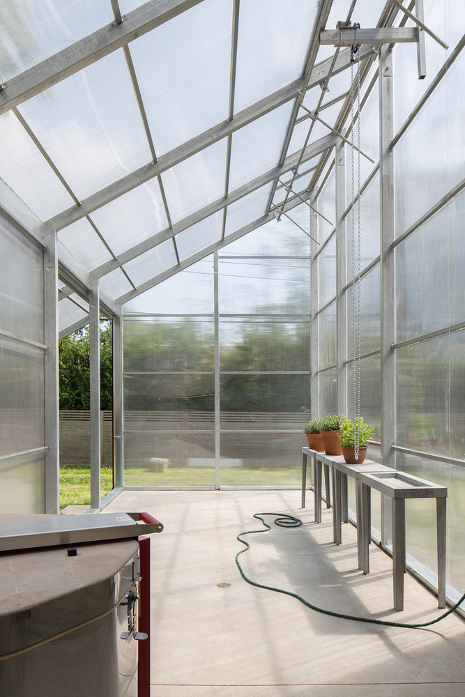 Třetí část je pak určitým mezistupněm mezi interiérem a exteriérem a díky svým stěnám z polykarbonátu umožňuje akumulaci tepla ze slunce, takže zajišťuje celoročně teploty nad bodem mrazu. Skleník tedy nevyužívají majitelé jen pro pěstování rostlin, ale jako další plnohodnotný prostor, se kterým mohou své ateliéry přímo propojit.