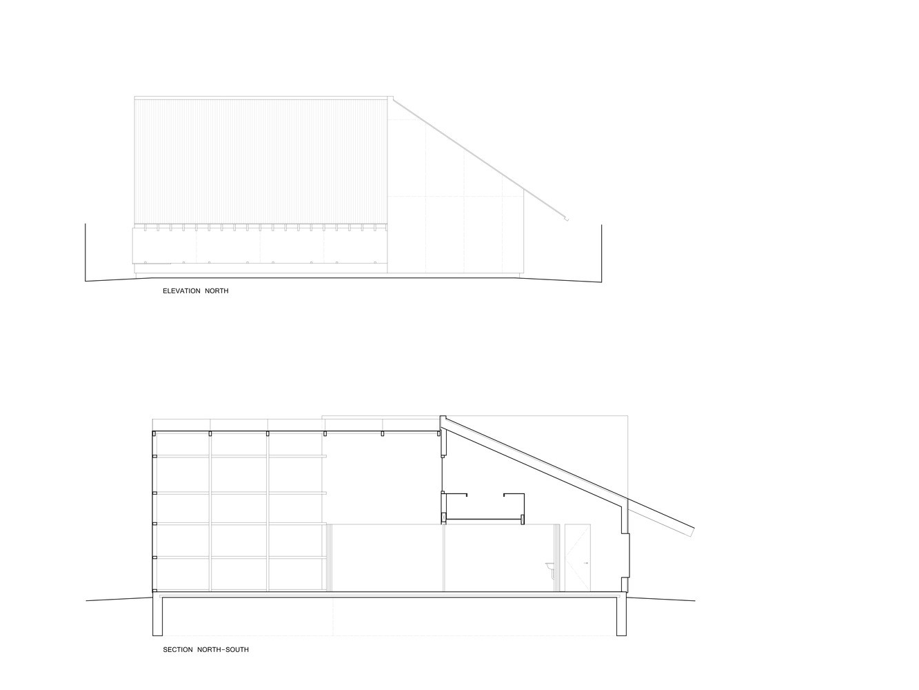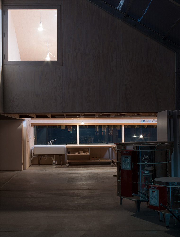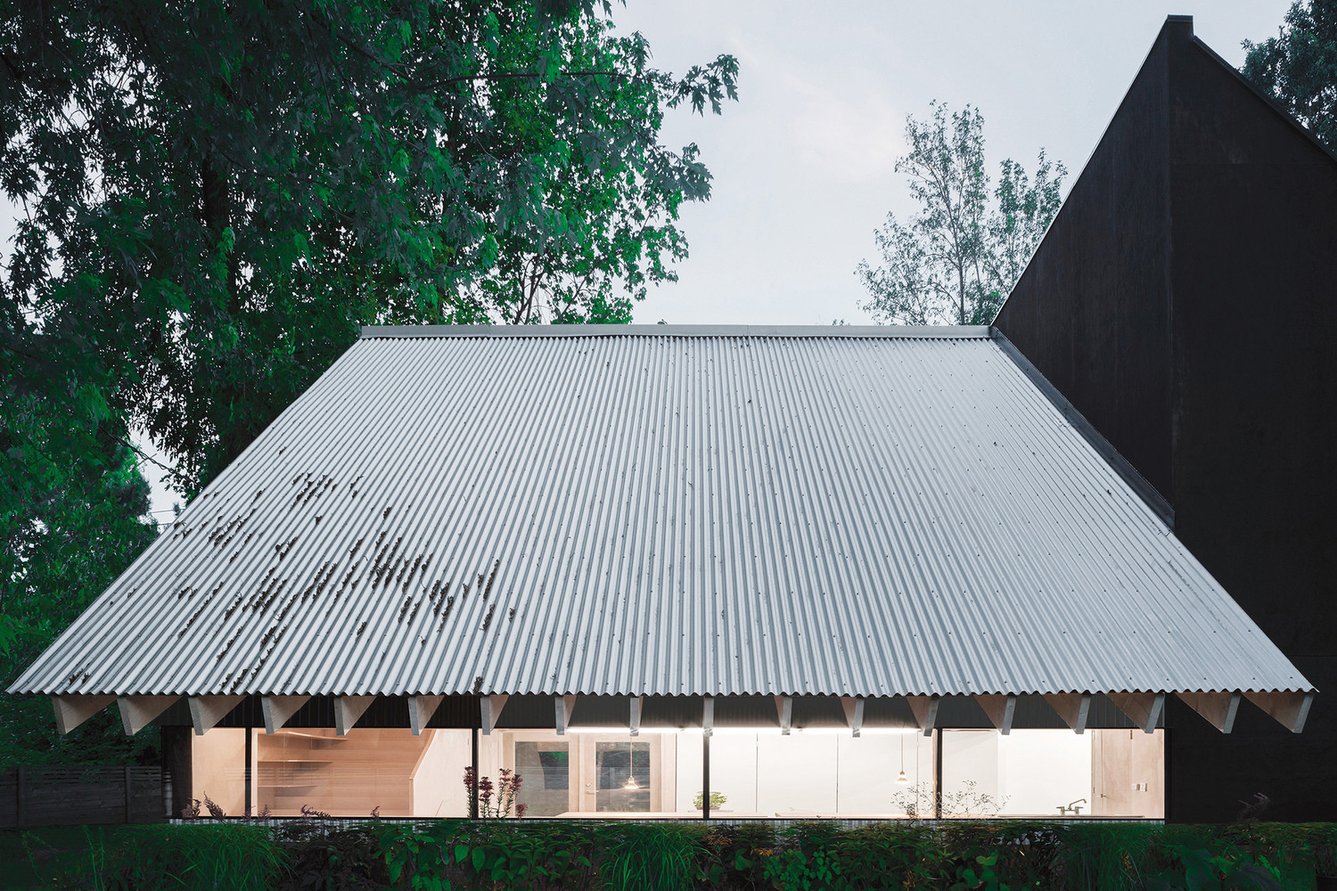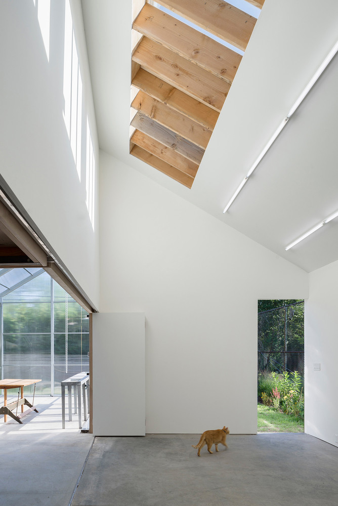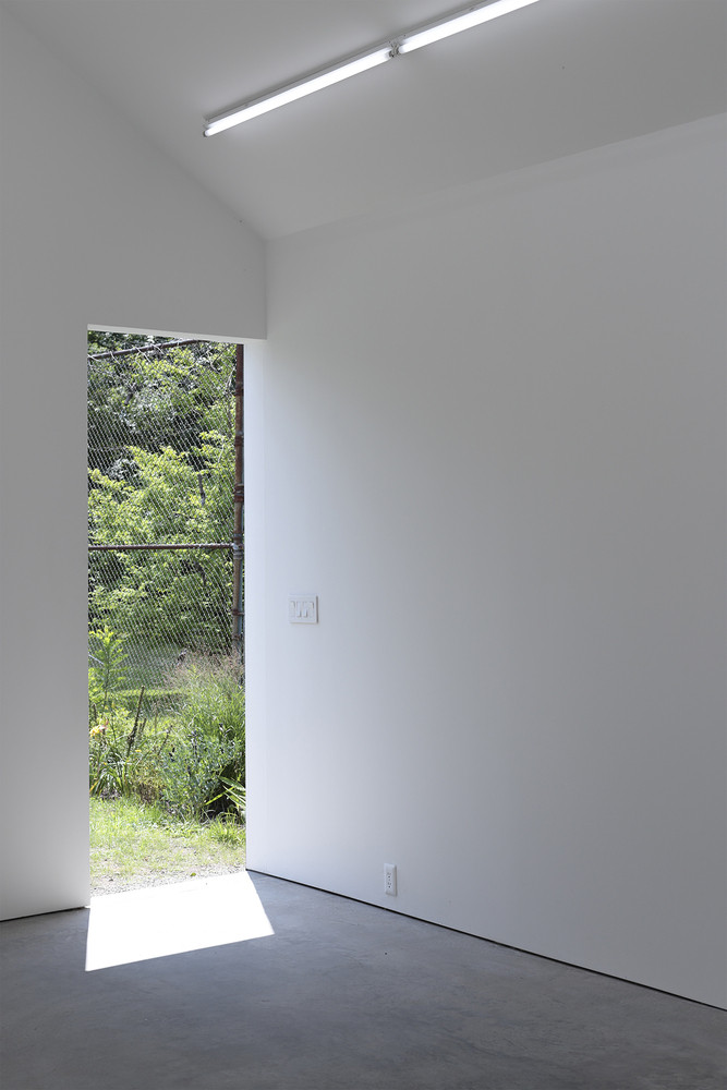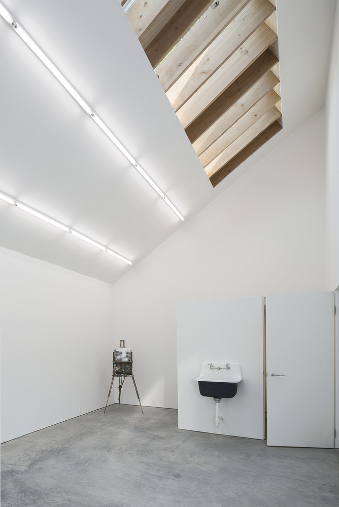 Všechny tři funkčně odlišné části stavby kryje šikmá plechová střecha. Vysoký dvoupodlažní bílý prostor, kam se přímé světlo dostává pouze shora, slouží jako malířský ateliér místního výtvarníka. Pokud při tvorbě zatouží po samotě, posuvné dveře zajistí dostatek soukromí a klid.