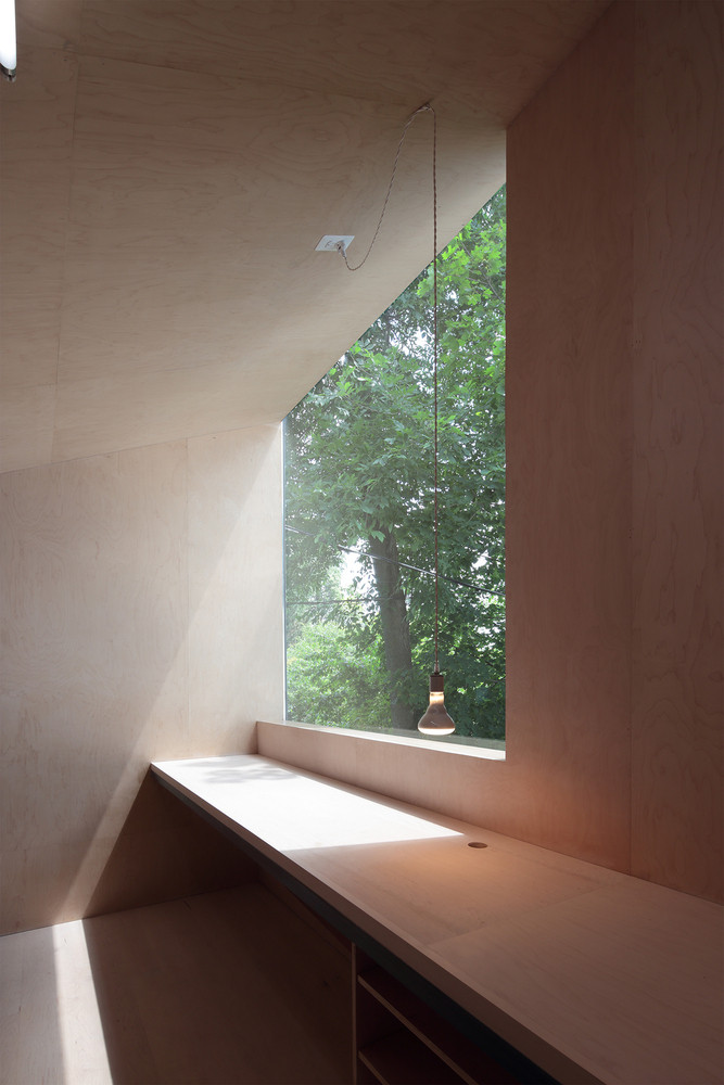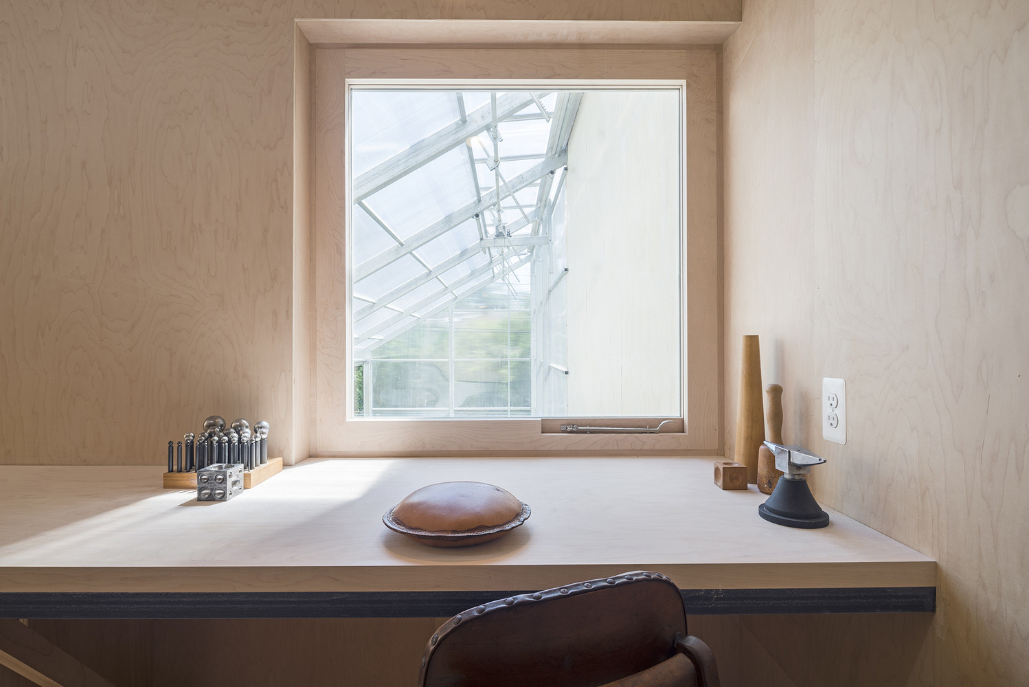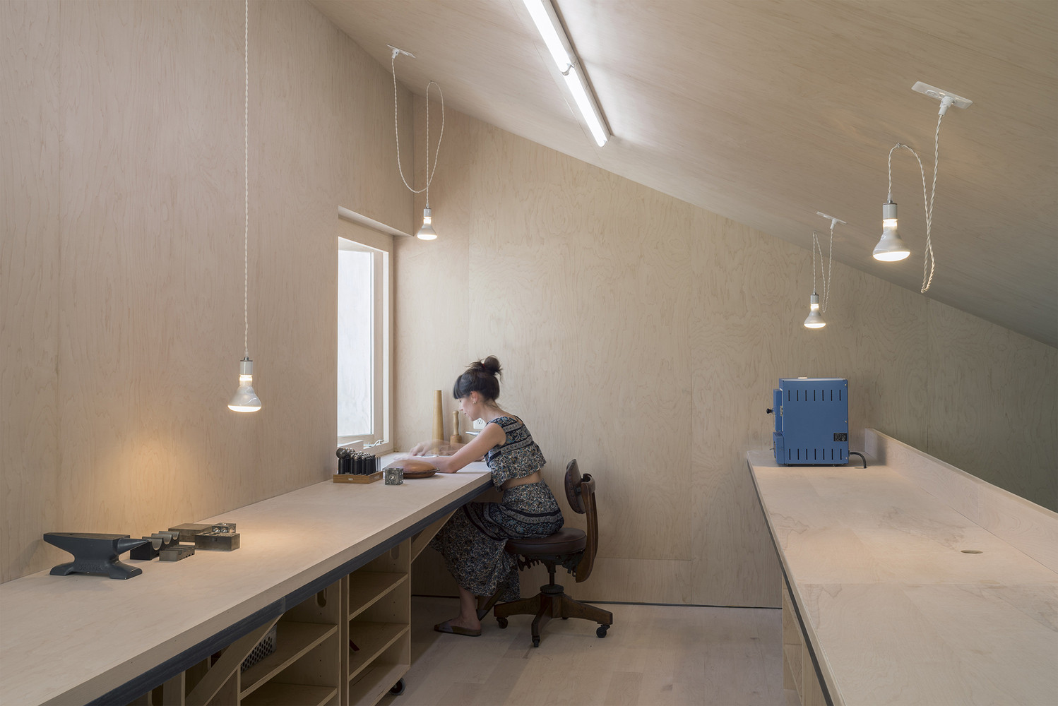 Světlé javorové dřevo kryje podlahu, stěny i strop ve druhé části domu, která je věnována umělkyni věnující se keramice a šperkařství. Vertikální okna přivádí přímé světlo pro delikátní práci se šperky, zbývající prostor se hodí pro manipulaci s hlínou.