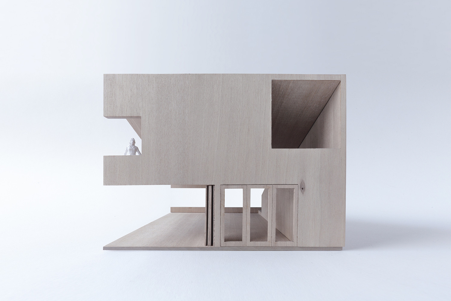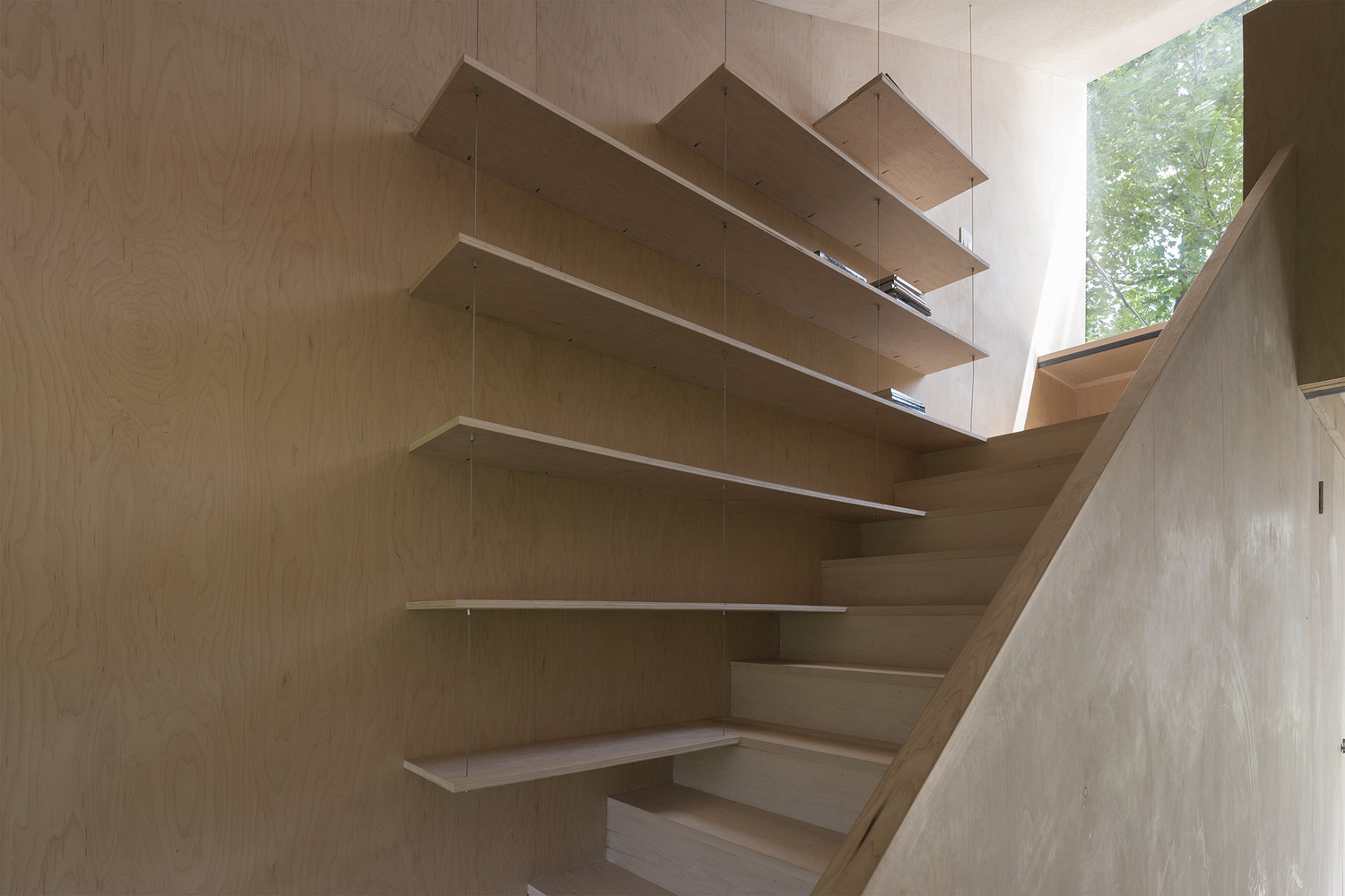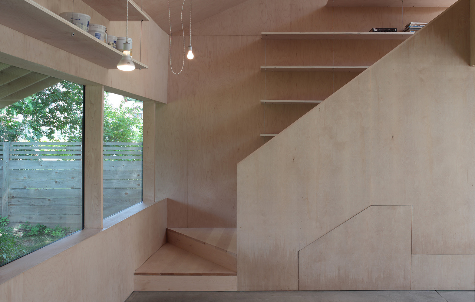 Světlé javorové dřevo kryje podlahu, stěny i strop ve druhé části domu, která je věnována umělkyni věnující se keramice a šperkařství. Vertikální okna přivádí přímé světlo pro delikátní práci se šperky, zbývající prostor se hodí pro manipulaci s hlínou.