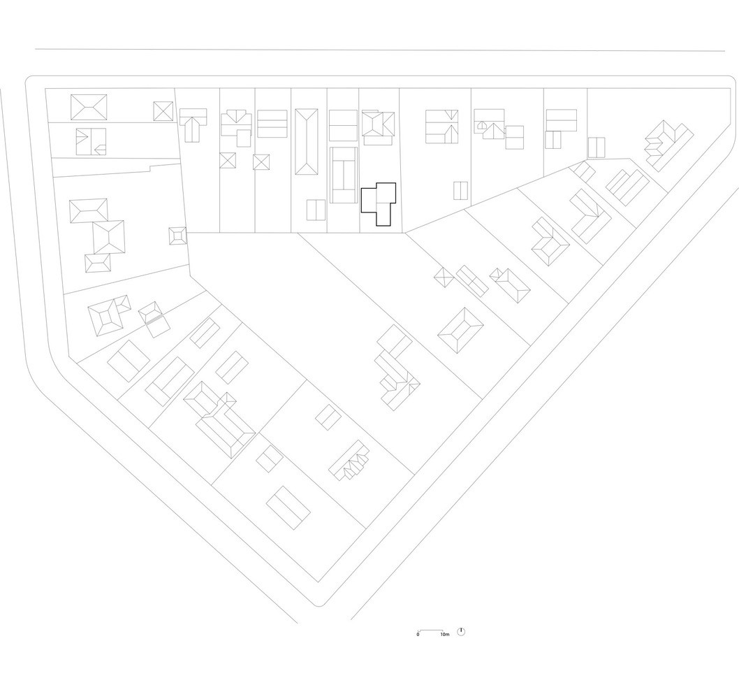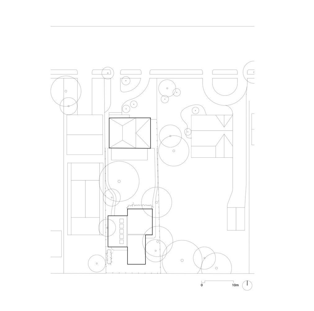 Objekt se o pozemek dělí s rodinným domem, který tak slouží jako bariéra chránící soukromí zahrady před pohledy z ulice. Vchodové dveře do studia jsou navíc umístěny z druhé strany, aby oddělení od každodenní rutiny v rodinném domě bylo co největší – objekt se má totiž stát místem pro nerušenou tvorbu.