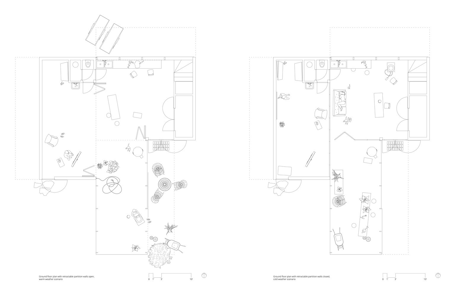 Ačkoli jsou jednotlivé části studia velmi rozdílné, všechny spojuje důraz na volný prostor a dostatek přirozeného světla. Klíčovým prvkem jsou posuvné dveře, které umožňují různé způsoby využívání prostorů a také měnit jejich atmosféru.