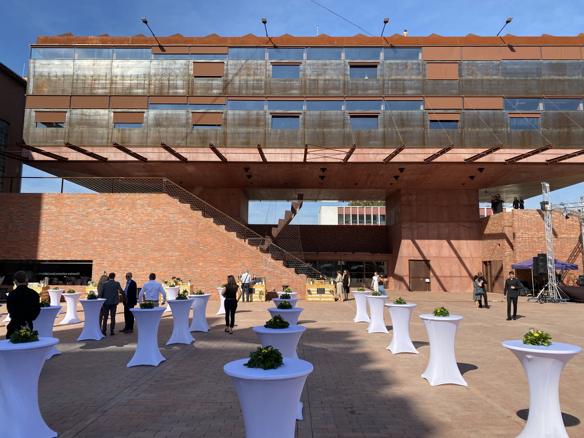 Otevření doprovázela performance uklízečů v overalech. Ovšem ještě večer před tím tu běhali reální pracovníci a dokončovali výdlažbu dvora.