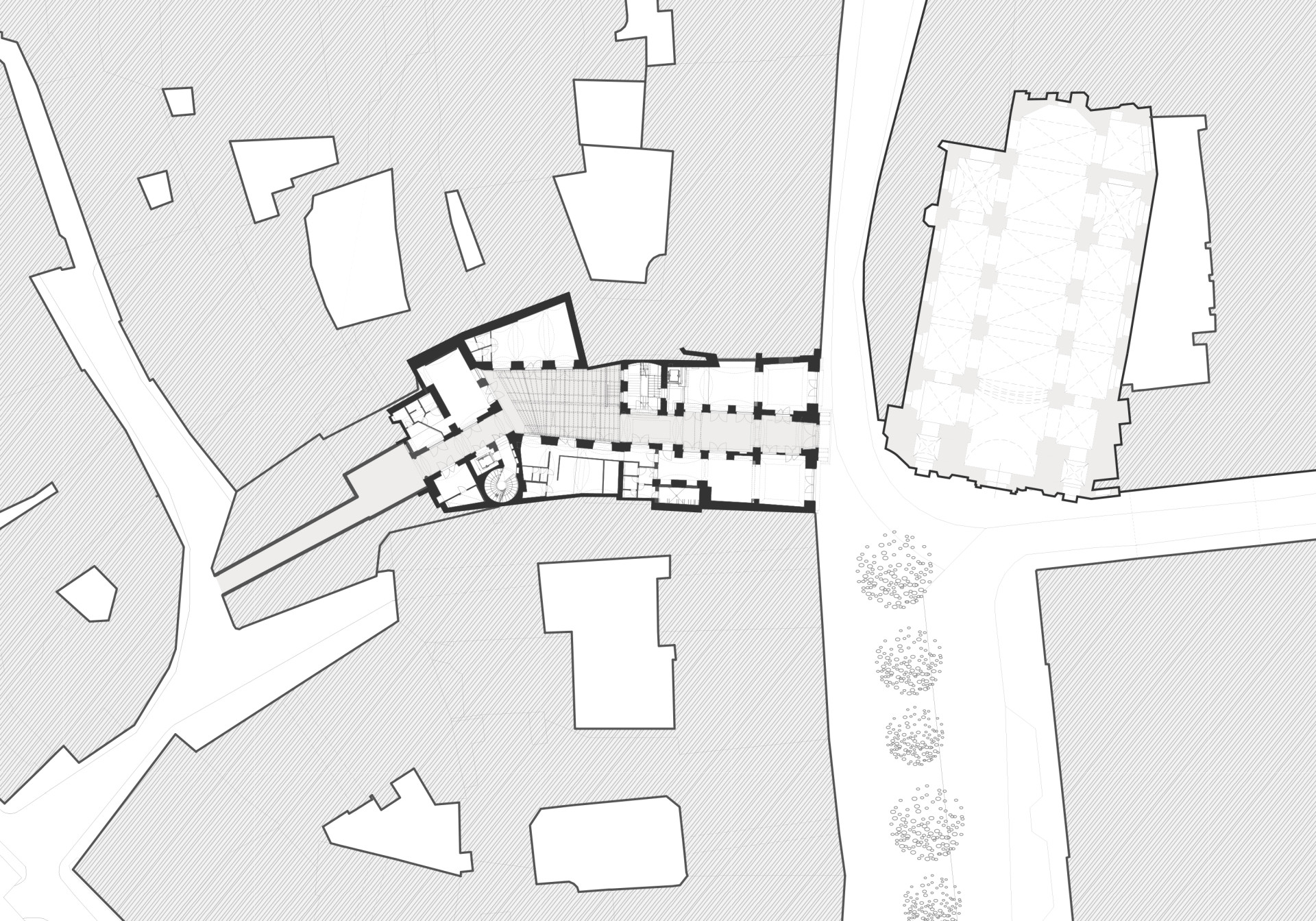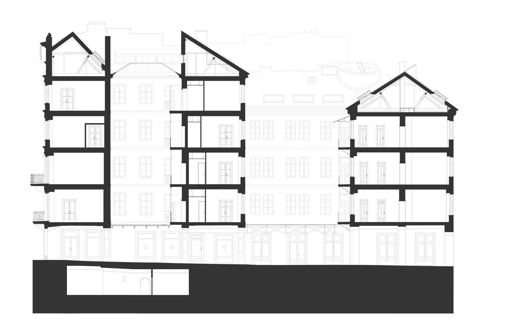 Parter domu je navržen pro restaurační využití, ve zbylých patrech se pak nacházejí bytové jednotky, a to včetně podkroví, které je nyní obytné. Vede do něj nové betonové schodiště navazující na historické kamenné.