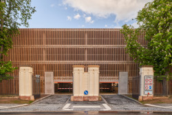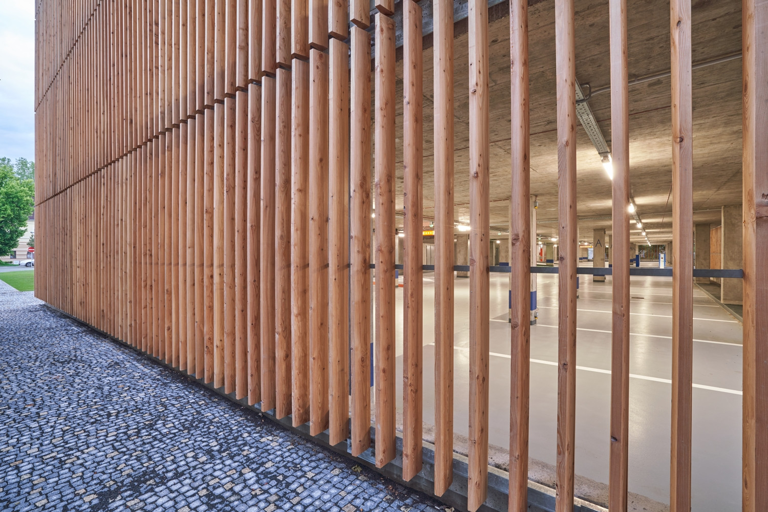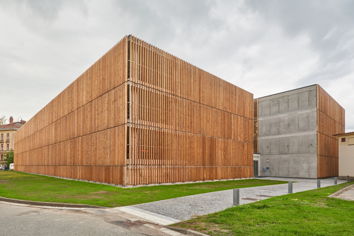 V areálu bývalých kasáren Hradce Králové vznikl parkovací dům s dřevěným pláštěm od studia architekti chmelík & partneři