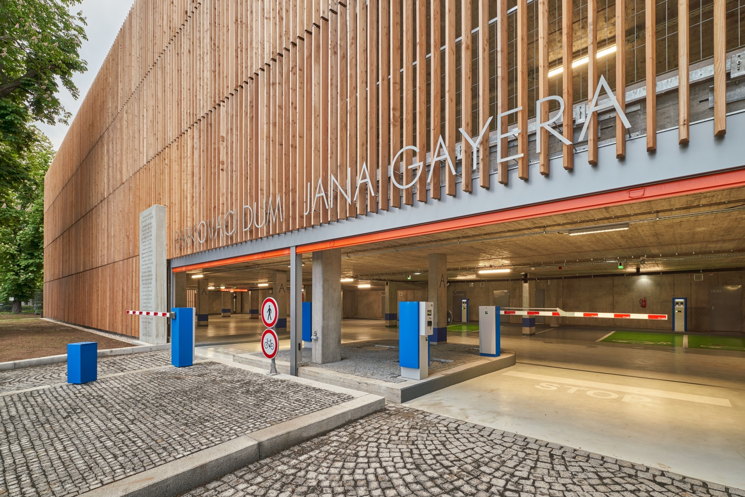 Na pozemcích bývalých Gayerových kasáren v širším centru Hradce Králové navrhli architekti chmelík & partneři dvě velikostně rozdílné hmoty sloužící jako parkovací dům. Rozměrná stavba z betonu a dřeva výrazně přispěla k budoucímu uvolnění plochy kasárenského komplexu a svou orientací jasně vymezila centrální náměstí, které by nyní mělo převzít funkci veřejného polyfunkčního prostoru.