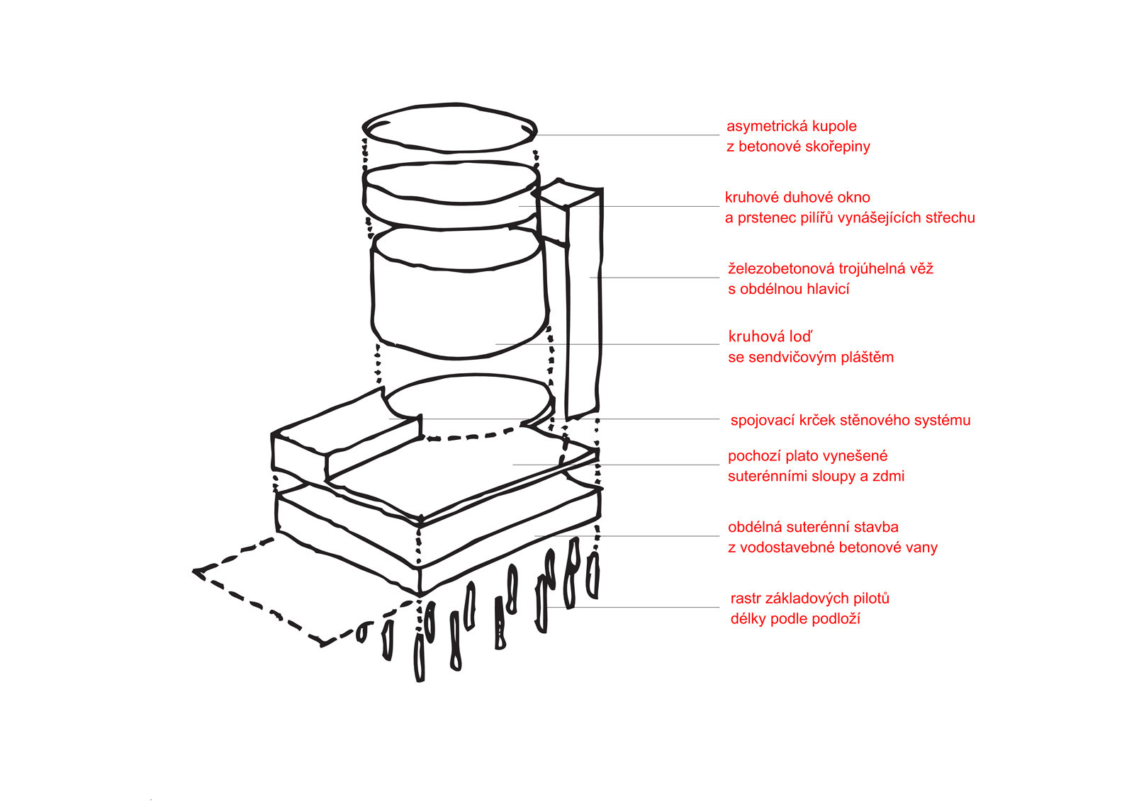 Kostel bl. Restituty Brno - Lesná, schéma konstrukce