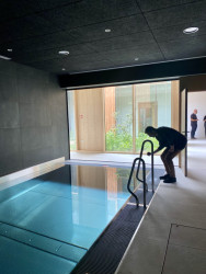 Konceptu odpovídají také použité materiály. „Jelikož je stavba domu z velké části zapuštěná do terénu, je hlavním konstrukčním materiálem monolitický železobeton. Jeho estetika se propisuje v interiéru i na fasádě domu, kde betonově šedé broušené omítky doplňují dřevěné obklady modřínovými biodeskami a velkoformátové prosklení v dřevěných rámech,“ popisují architekti. Vytápění a chlazení budovy řeší rozvody skryté v betonových stropech, zdrojem tepla i chladu jsou tři tepelná čerpadla vzduch – voda.