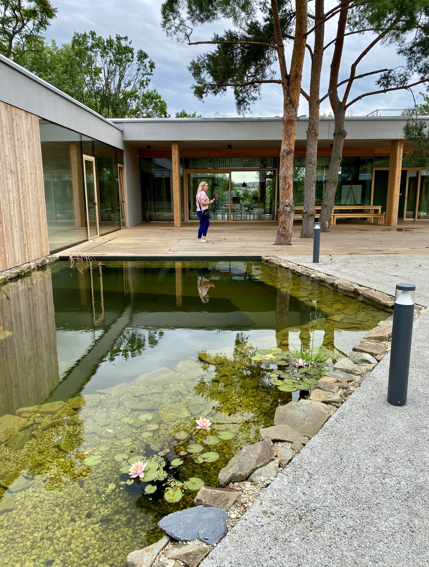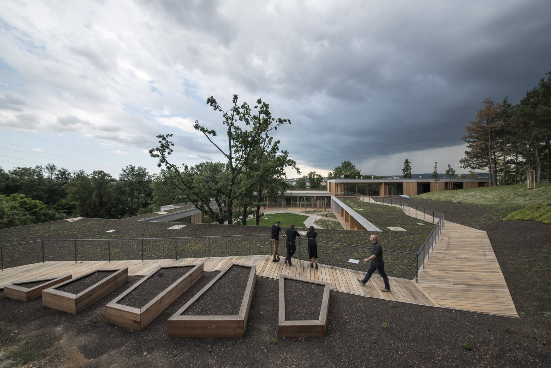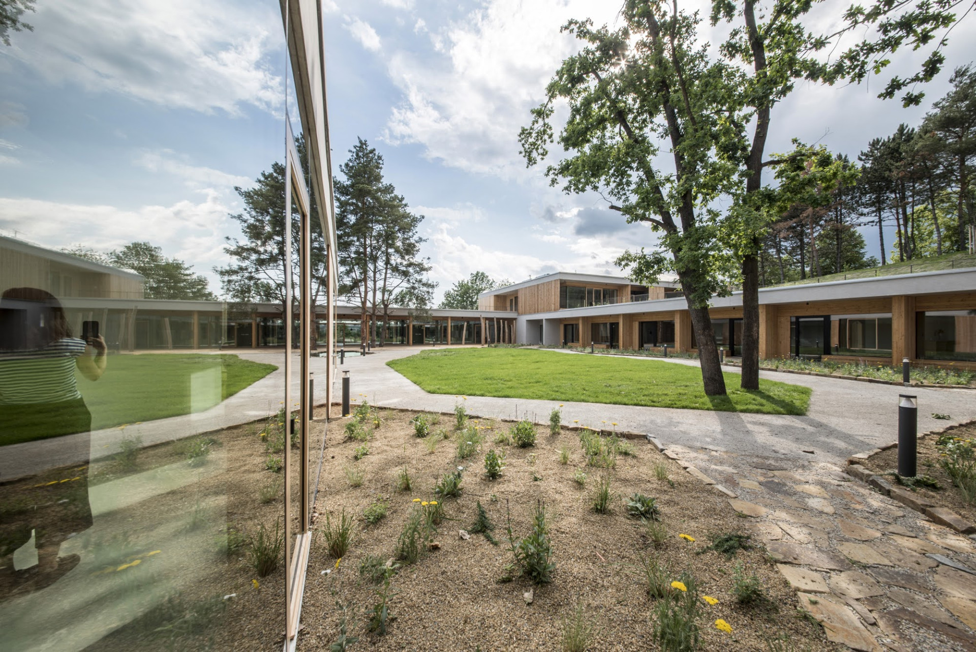 „Domem se můžete pohybovat pěšky, s kočárkem i na vozíku, střídat prostředí a trávit čas o samotě i ve společnosti. Můžete mít kontakt s přírodou, výhled na stromy, oblohu i na vodu v jezírku, to všechno za jakéhokoliv počasí a bez ohledu na provoz v okolním parku,“ popisují svůj koncept architekti ze studia Čtyřstěn. Jak říká Radka Vernerová, tohle uspořádání umožní, že některé děti mohou vyjet i s lůžkem ven a třeba po mnoha letech vidět hvězdy.