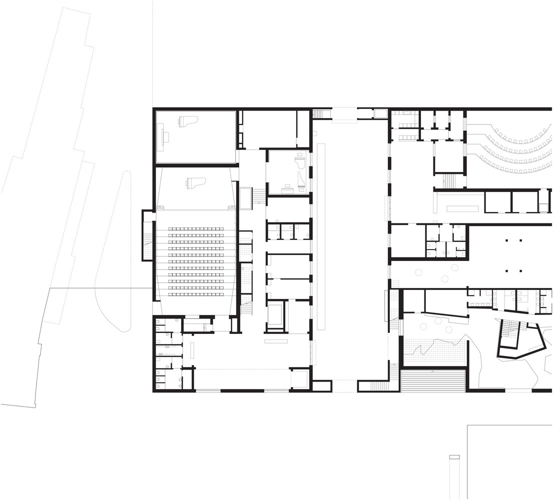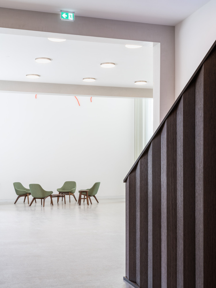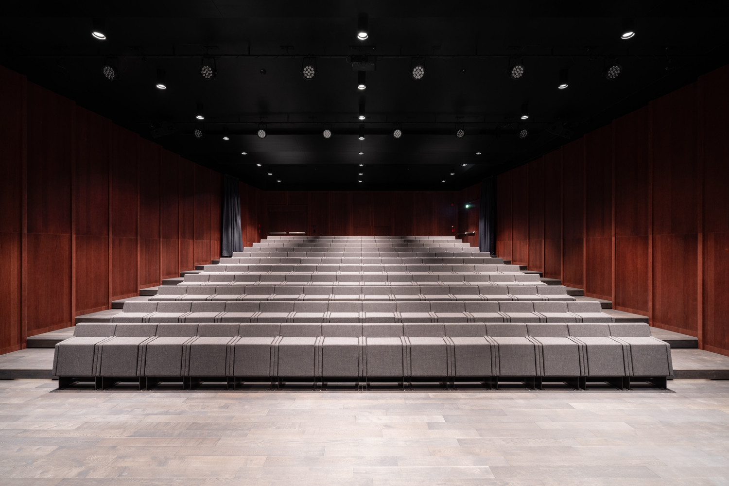 „Projekt byl realizován s velmi omezeným rozpočtem, a přesto se nevzdává formálního experimentování. Díky pečlivě vybraným prvkům, autentickým materiálům a jednoduchému konstrukčnímu systému jsme ve studiu vytvořili produkt vysoké technické a estetické kvality, který respektuje tradici a materiály dané oblasti,“ říkají. Střídmé vybavení je především z tmavě mořeného dubového dřeva. Vedle nábytku a obložení centrálního schodiště ho architekti využili také pro ztvárnění akustických stěn v auditoriu.
