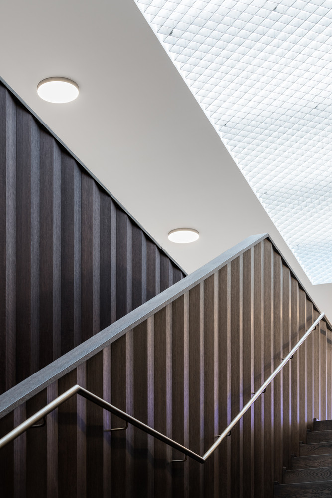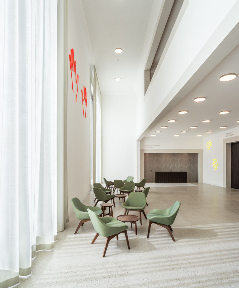 Interiéry hudební školy jsou zalité světlem a s chladným exteriérem vytváří zajímavý kontrast. Zvenčí na sebe zase přitahují pozornost vzorované stěny s ostře vyřezanými okenními otvory. „Wunderkammer“ se stává otevřenou galerií hudby, jejíž tvůrce lze pozorovat jako exponáty ve vitrínách otevřeného depozitáře.