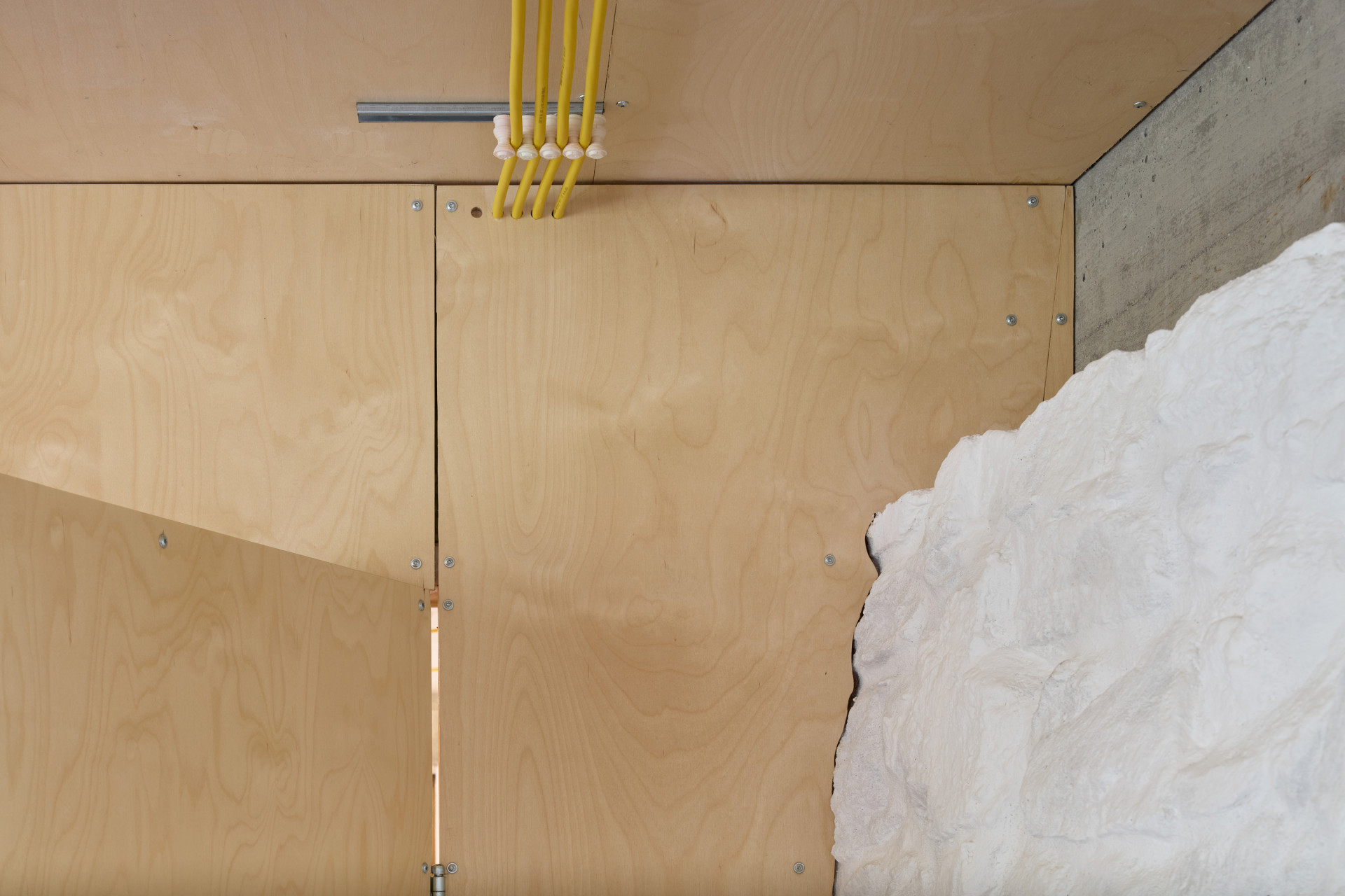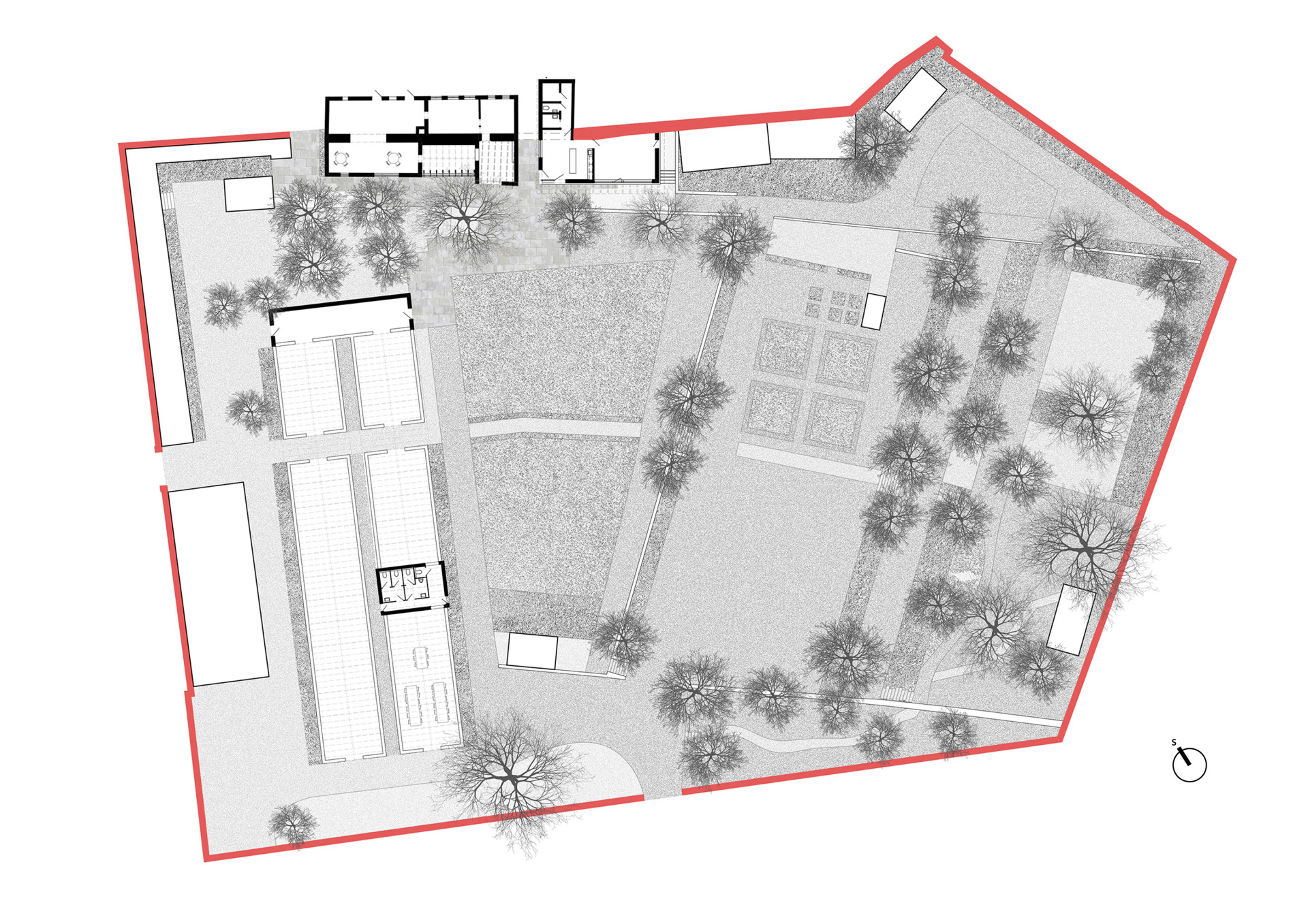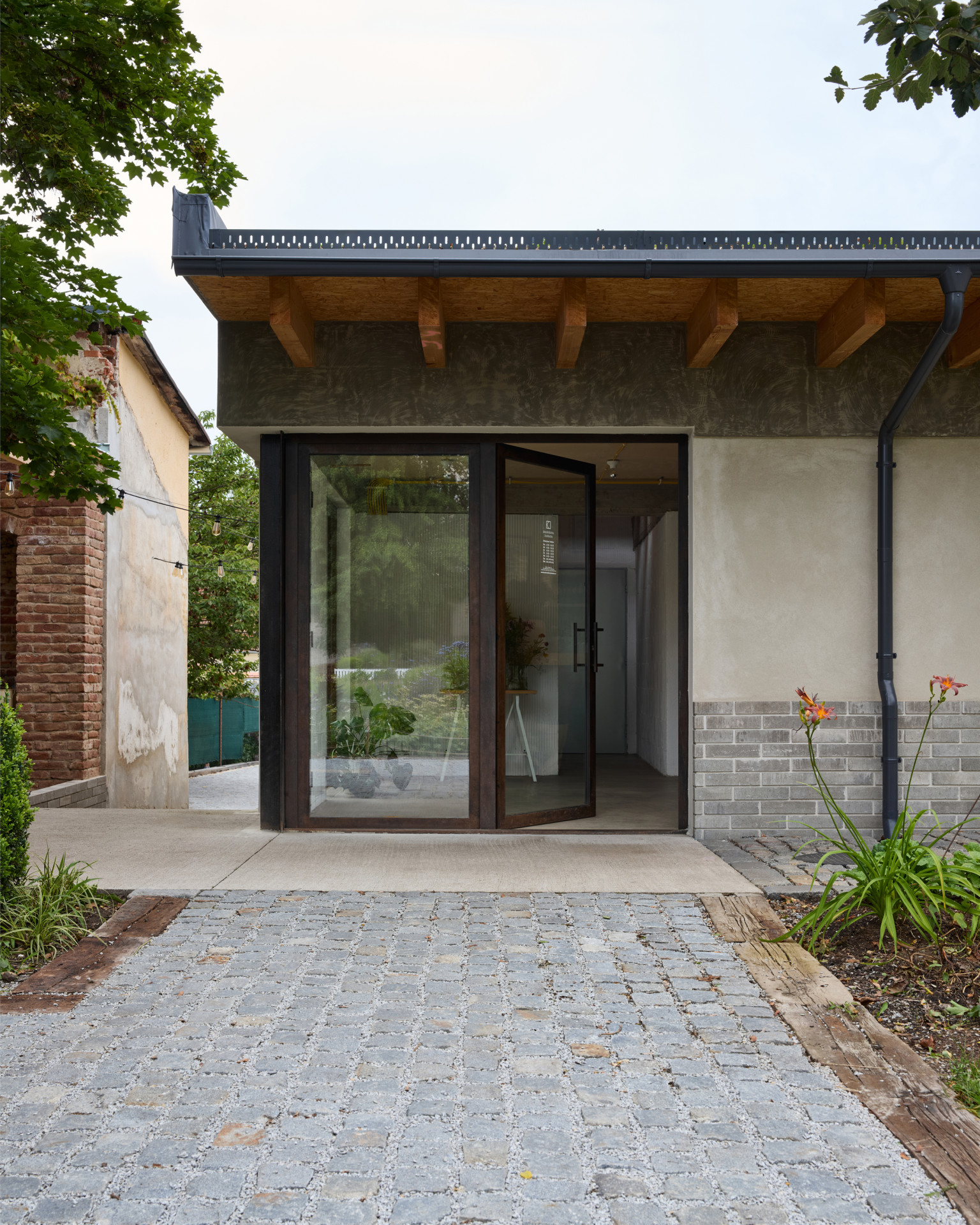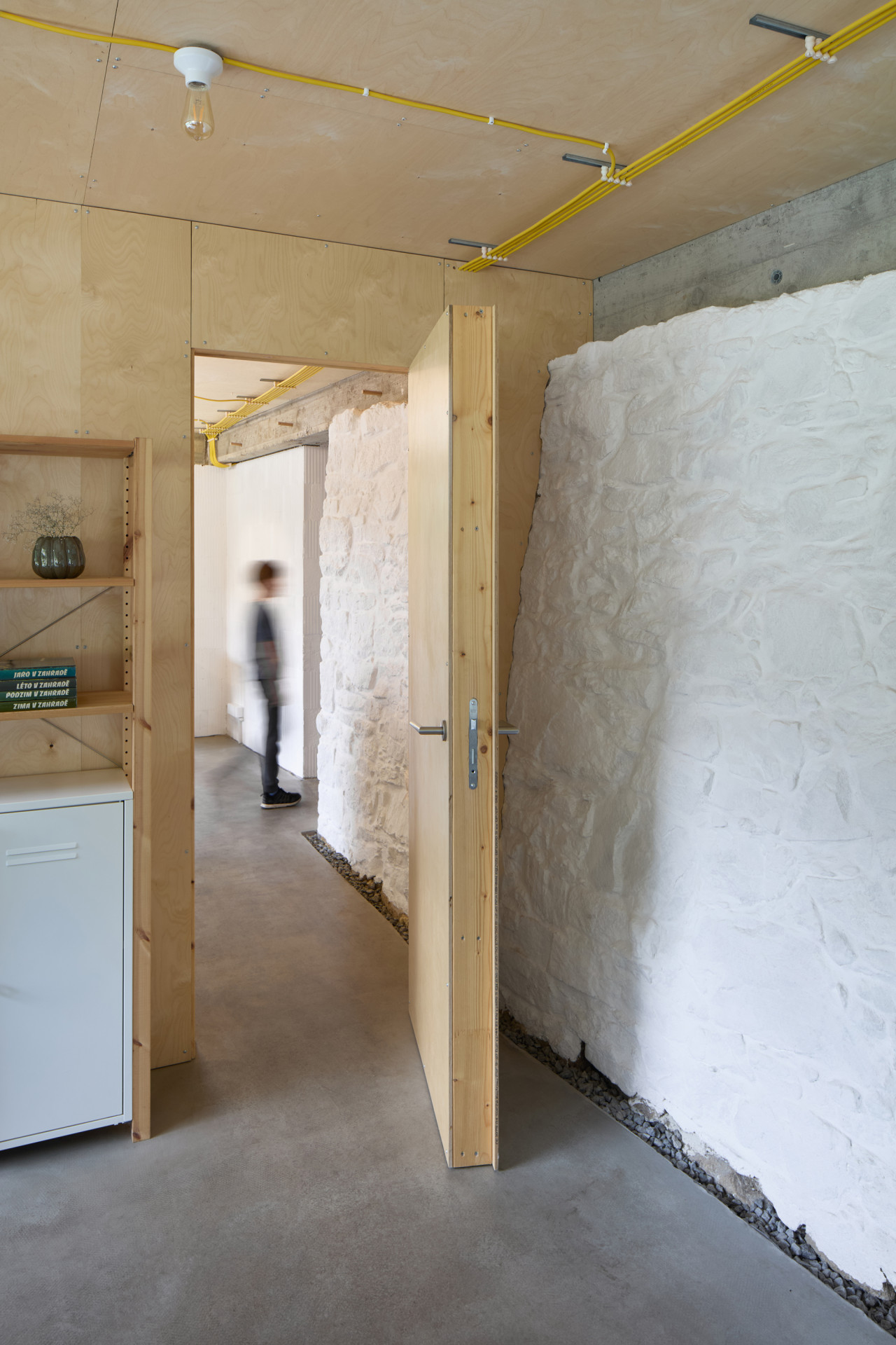 „Dispozičně i konstrukčně se přimyká k původní barokní ohradní zdi, která přímo prochází souborem staveb a její fragmenty se promítají i do interiéru,“ popisují stavbu v autorské zprávě matěj šebek architekti. Kromě květinářství se uvnitř novostavby nachází také studio Ateliéru Za Mák. Prostory vymezila březová překližka, právě na ní lze pozorovat, jak se zalamuje přes hrubou kamennou zeď.