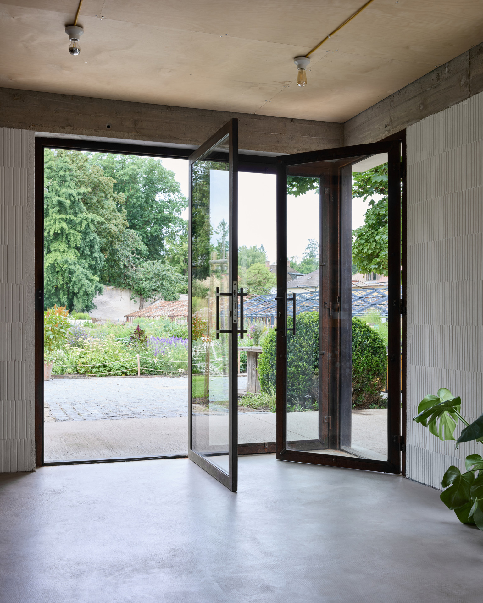 Dovnitř člověka zve brána s vraty v peprmintově zelené. Za nimi následuje plácek vydlážděný žulovými kostkami a pak rampa z betonu. Architekti pro ni „prostřihli“ cestu mezi starými skleníky a sklady. Z jejího konce se otevírá výhled do pěstitelské zahrady v centru Jindřichova Hradce – říká se jí Krafferova, podle zahradníka, který ji zde v polovině 19. století založil.