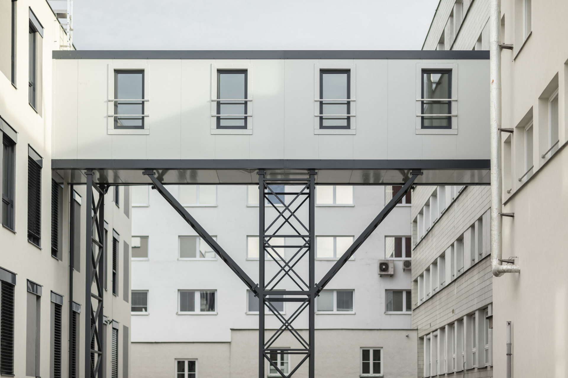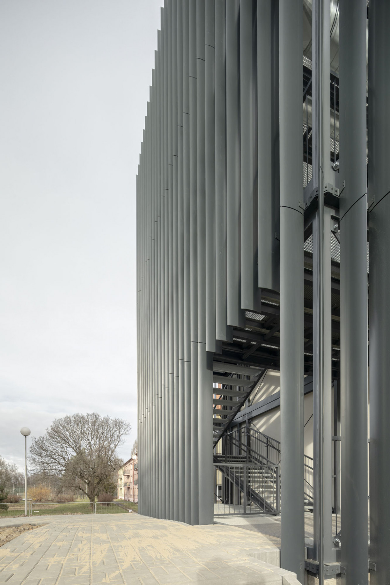 Vnější vzhled budovy charakterizuje střídmá kombinace bílé a šedé omítky zvýrazňující okenní otvory. Fasády oživuje hravá kompozice okenních výplní spolu s výraznými hmotami schodišť v obou koncích budovy.