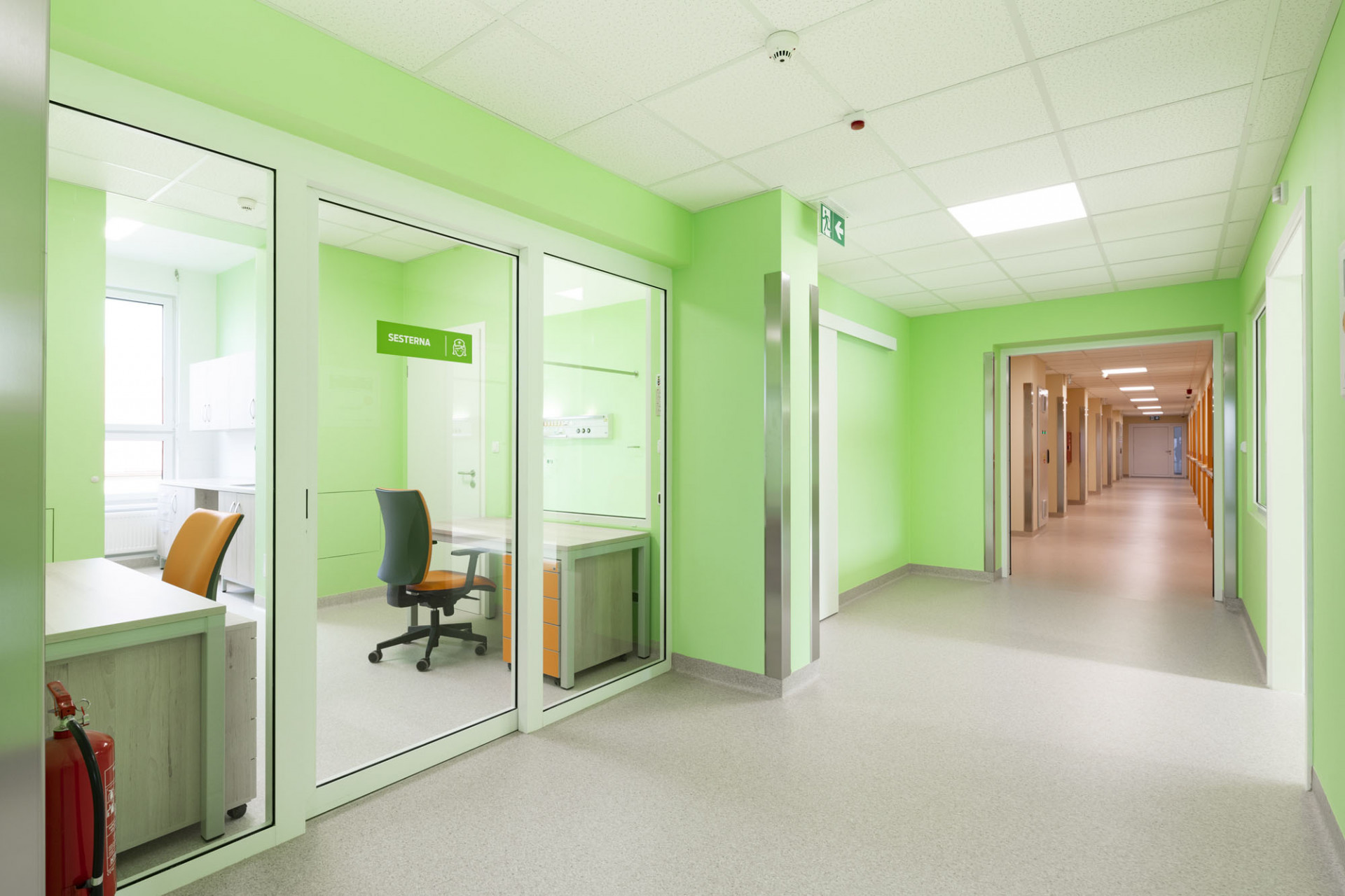 Autorský tým petit atelier vytvořil kombinací několika typů modulů přehlednou dispozici splňující všechny požadavky nemocničního provozu. Základní prostorově-funkční jednotku tvoří čtyři buňky o různých šířkách sestavené k sobě, čímž vznikl typický trojlůžkový pokoj s vlastní bezbariérovou koupelnou. Prostory ordinací i přidružených provozů vznikly na základě obdobného principu. Stávající budovu nemocnice spojují s novou přístavbou komunikační krčky, vytvořené rovněž z modulů. Díky kompozici jednotlivých modulů se podařilo zajistit jasnou a přehlednou dispozici zjednodušující orientaci především pacientům.