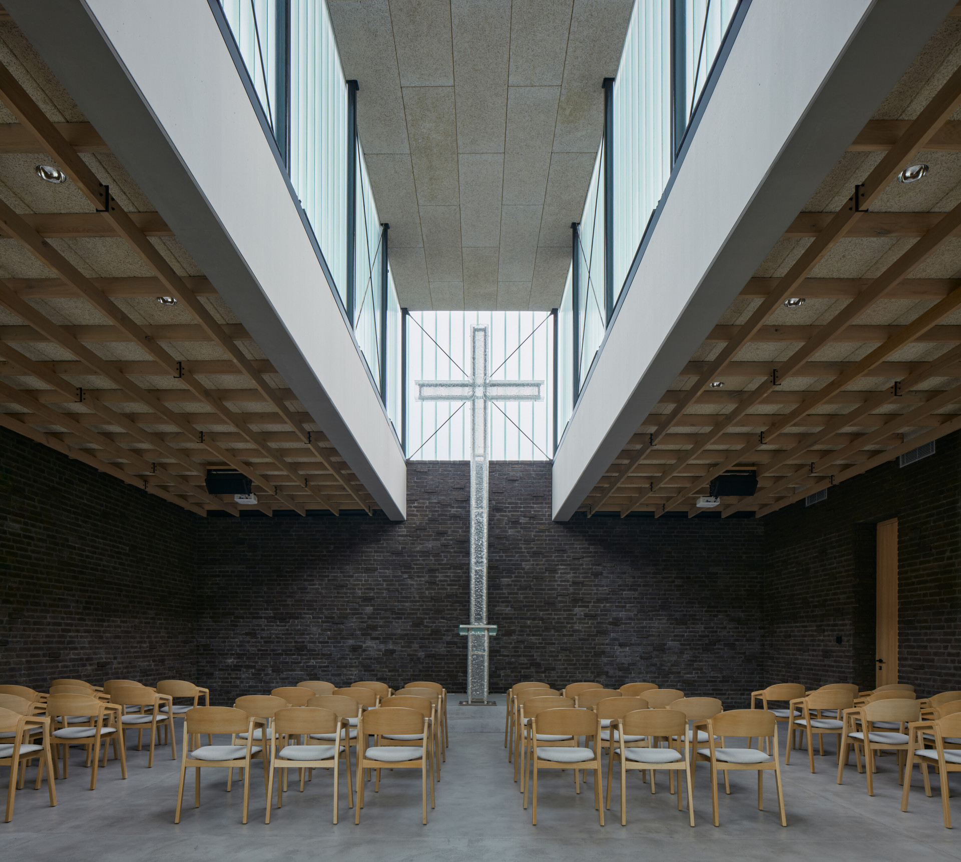 Co se týče materiálového zpracování objektu, v exteriéru nejvíce zaujmou lícové cihly fasád, přiznaná železobetonová pergola a profilitový světlík. Cihly našly své uplatnění také v interiéru. „Kladení cihel v sále modlitebny symbolizuje pulzaci života – směrem k pomyslnému středu, ke kříži, se cihly shlukují, opačným směrem řídnou, sublimují,“ popisují autoři návrhu.