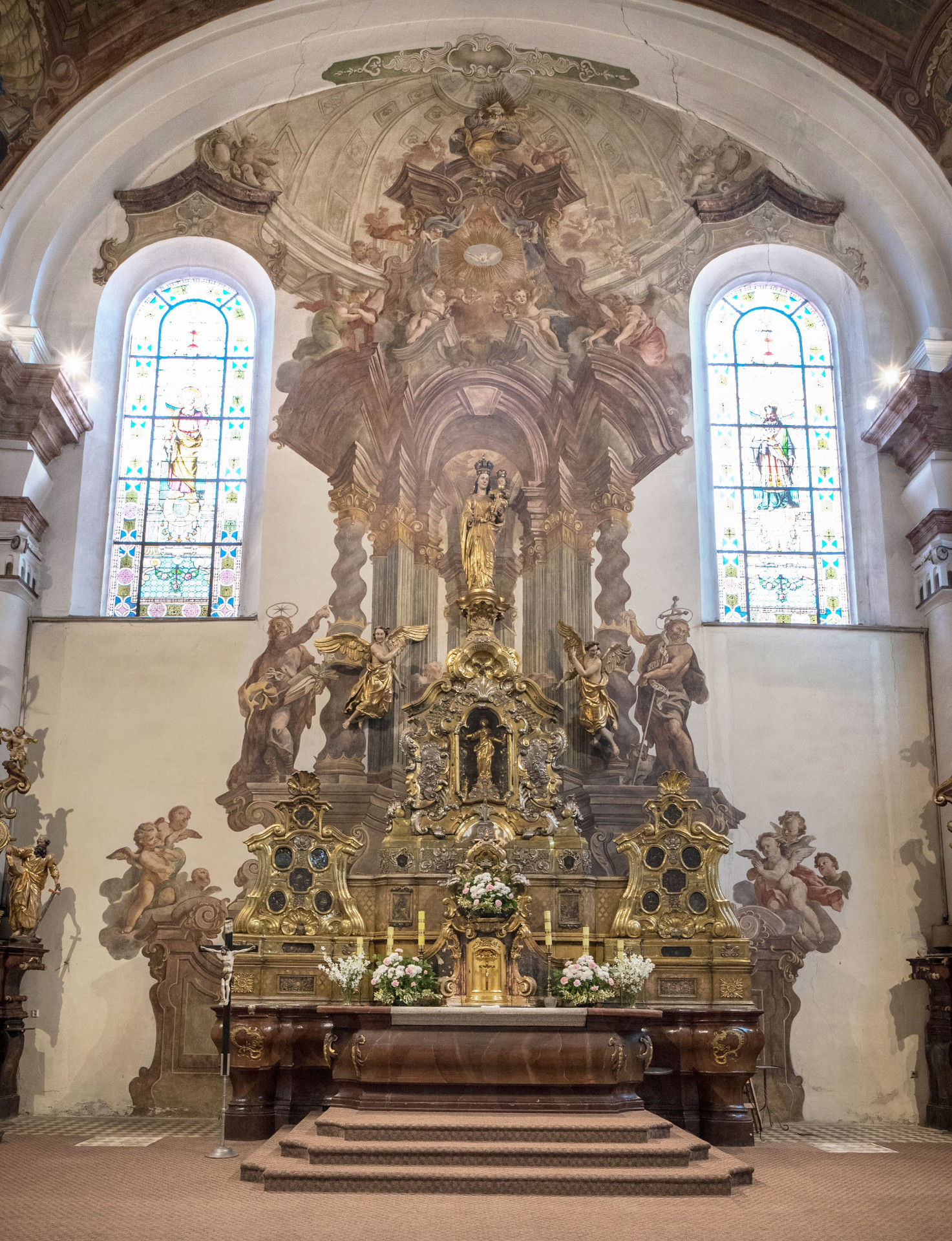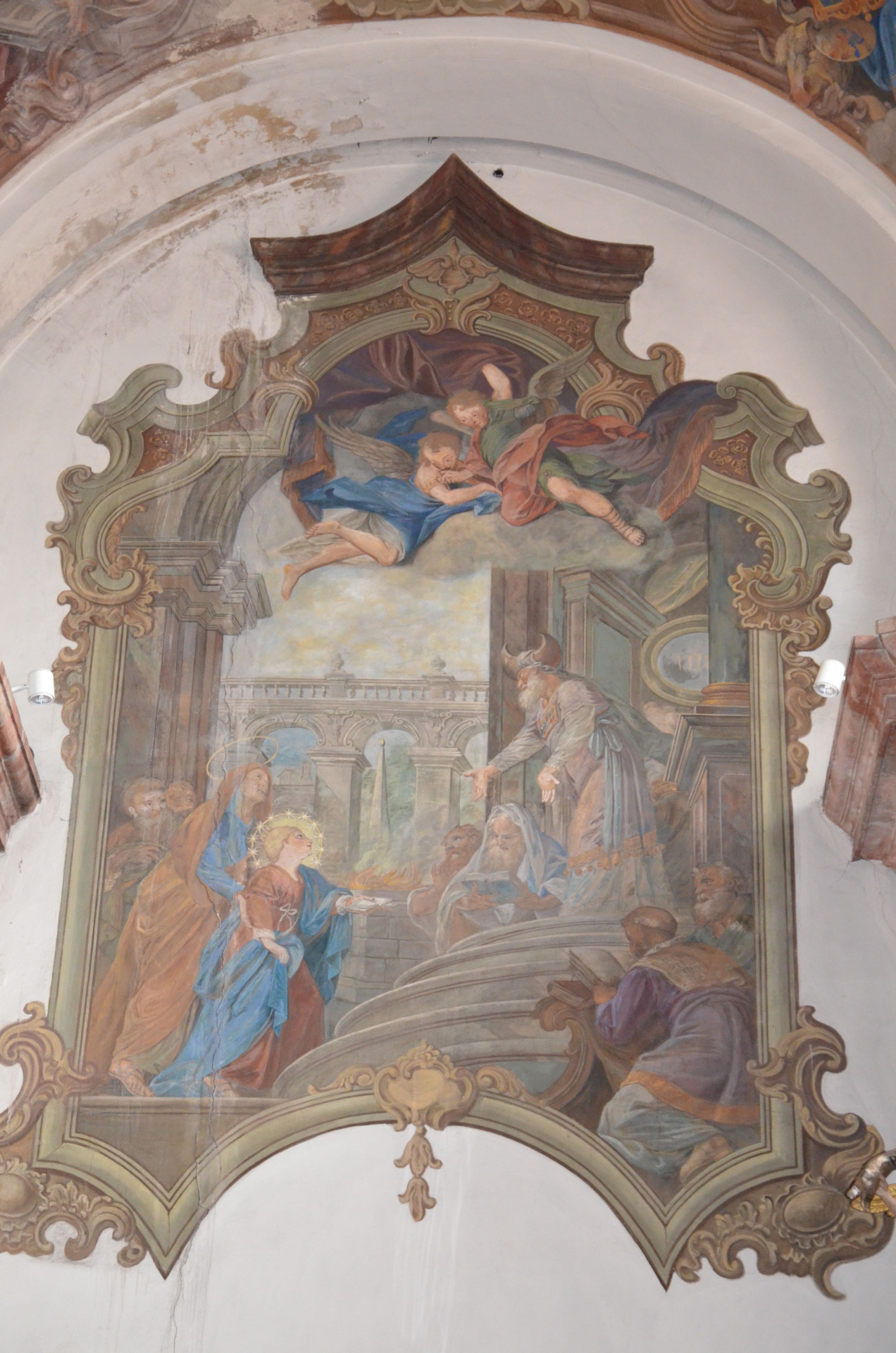Původně gotický kostel Narození Panny Marie byl v době barokní přestavby v letech 1751-1756 vyzdoben figurálními nástěnnými malbami F. J. Luxe, významnýho plzeňského malíře, který tvořil fresky v kostelích a kaplích po celých západních Čechách. Fresky s mariánskou tématikou - „Uvedení Marie do chrámu“, „Zasnoubení Panny Marie“ a „Navštívení Panny Marie“, stejně jako iluzivní malba hlavního oltáře a malířská výzdoba v kapli sv. Barbory však byly během 20. století kompletně přemalovány.