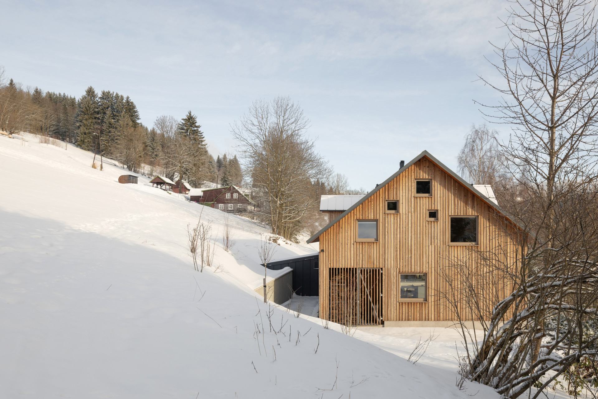 Svažitý pozemek ve Strážném poblíž Vrchlabí nabídl víc než jen parcelu ke stavbě. Otevírá se z něj široký pohled přes údolí na hřebeny Krkonoše s jasně čitelnou dominantou Černé hory. V zimě stačí vyjít z domu v přezkáčích a o pár metrů dál nazout lyže.
