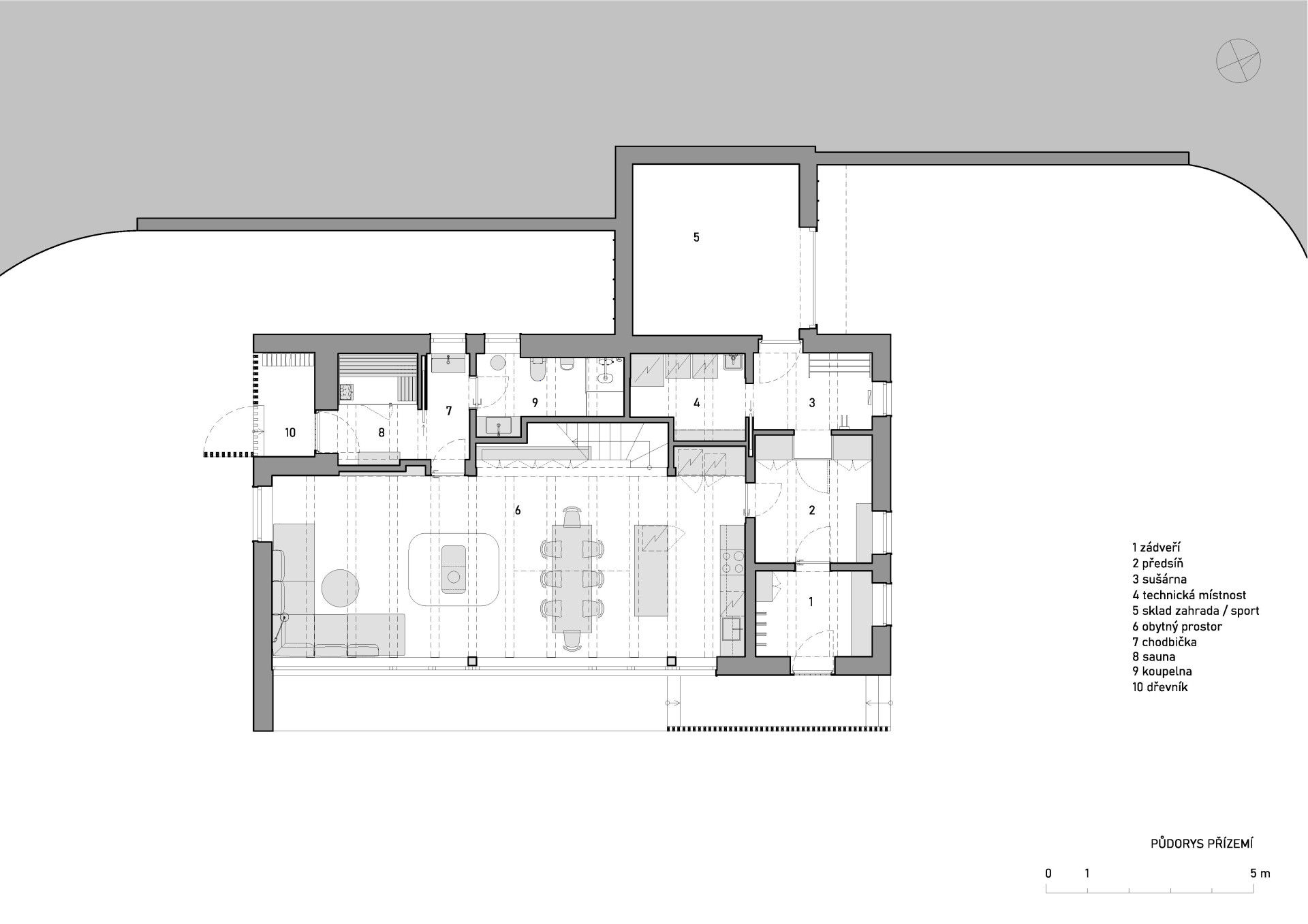 V přízemí nechybí sauna s možností vyběhnout rovnou do sněhu. Technické zázemí včetně lyžárny a sušárny zajišťuje, že zimní provoz probíhá bez komplikací. Dům funguje jako plnohodnotná základna pro letní i zimní sezónu.