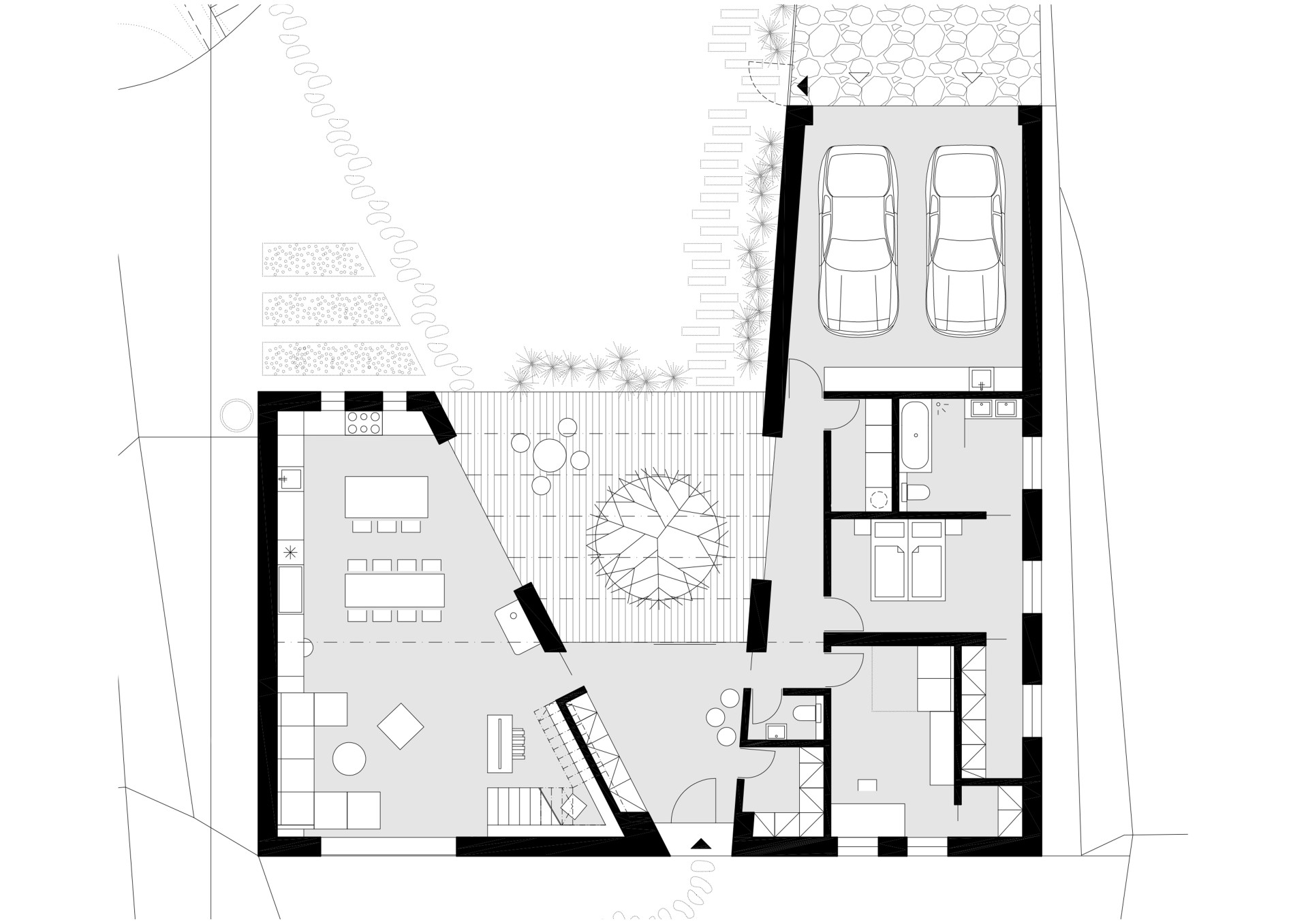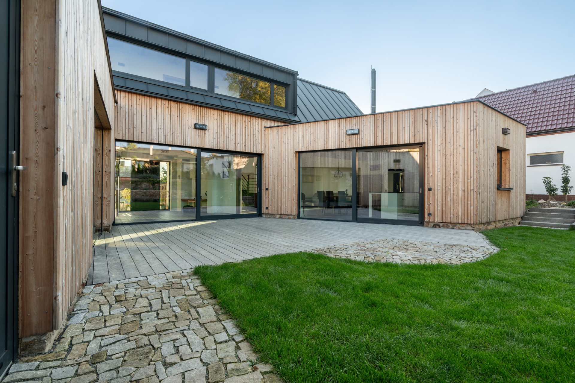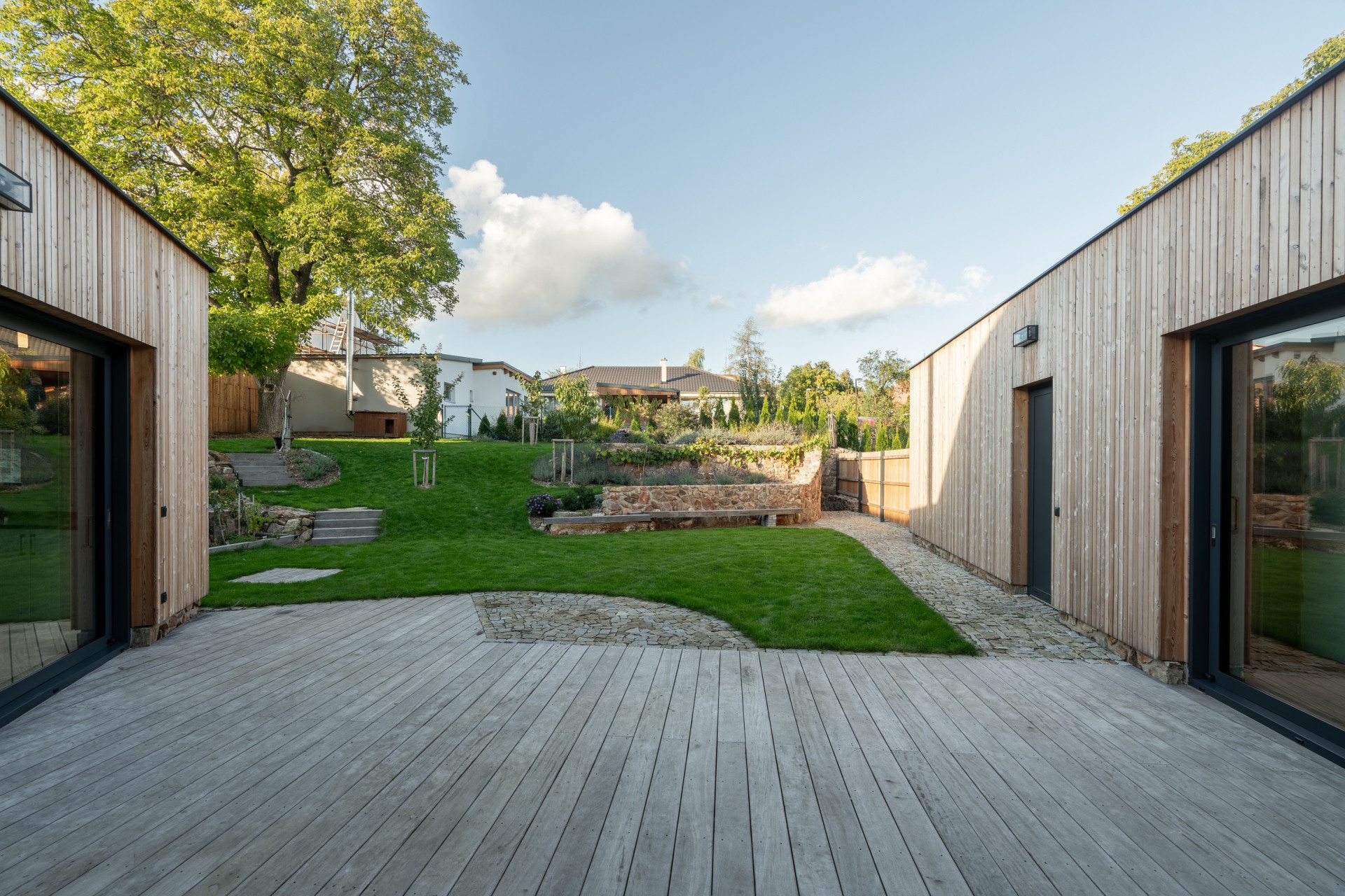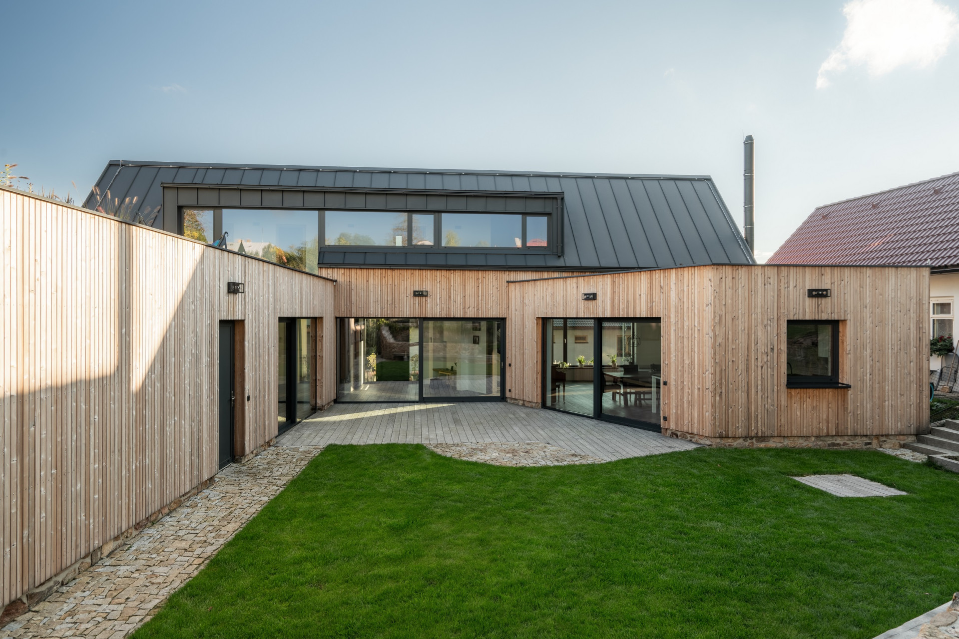 Rodinný dům vyrostl na místě staršího objektu. Jeho původní pozici kopíruje hlavní trakt novostavby, ze které směrem do zahrady vybíhají dvě kratší křídla. Trojkřídlá struktura zde svírá vnitřní dvůr, kterým se táhne dřevěná pobytová terasa.