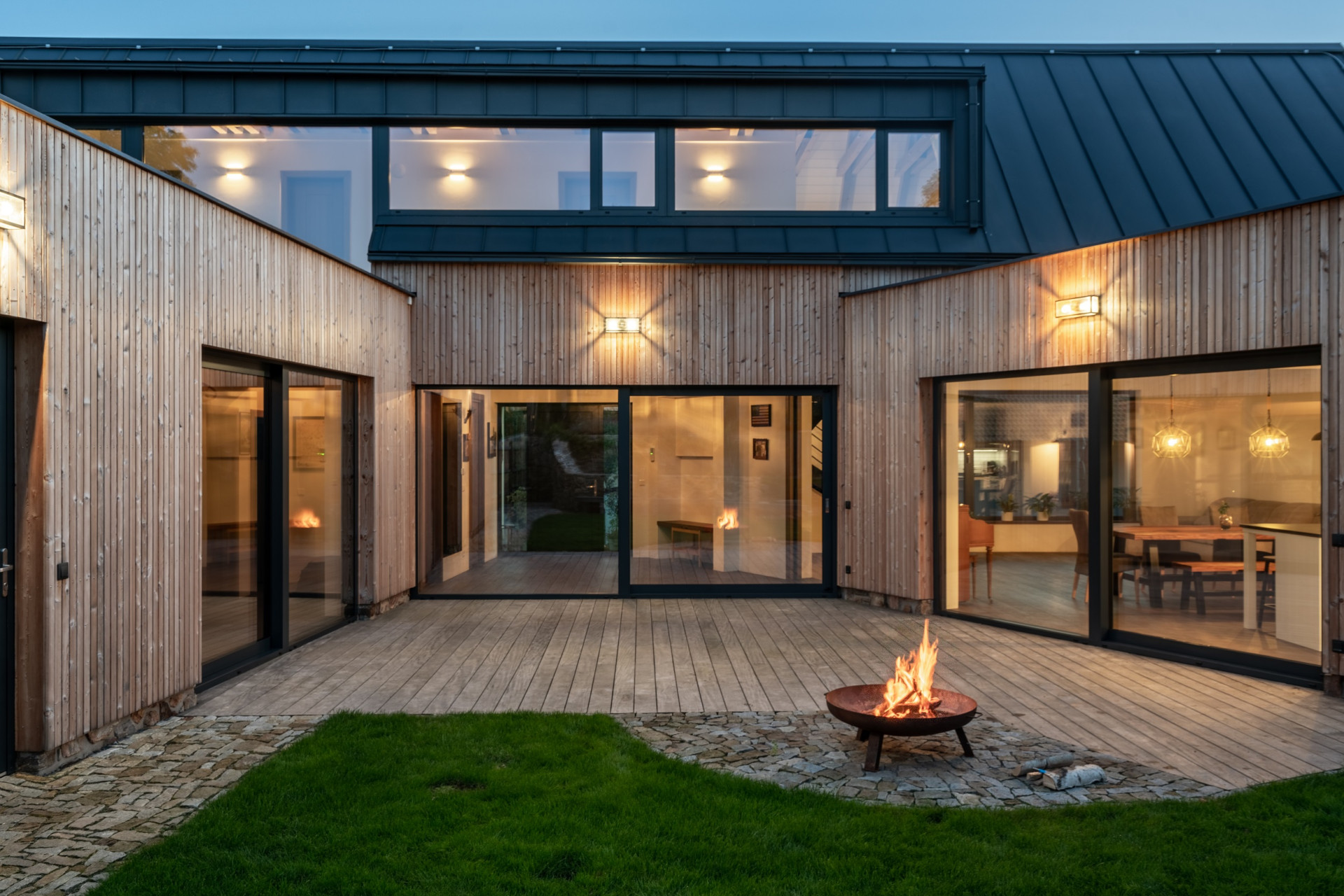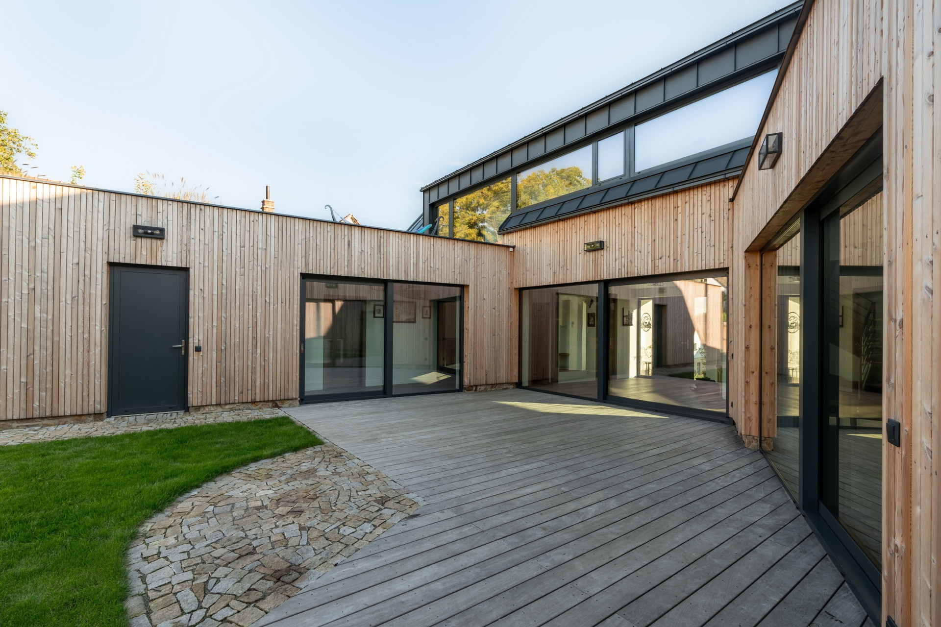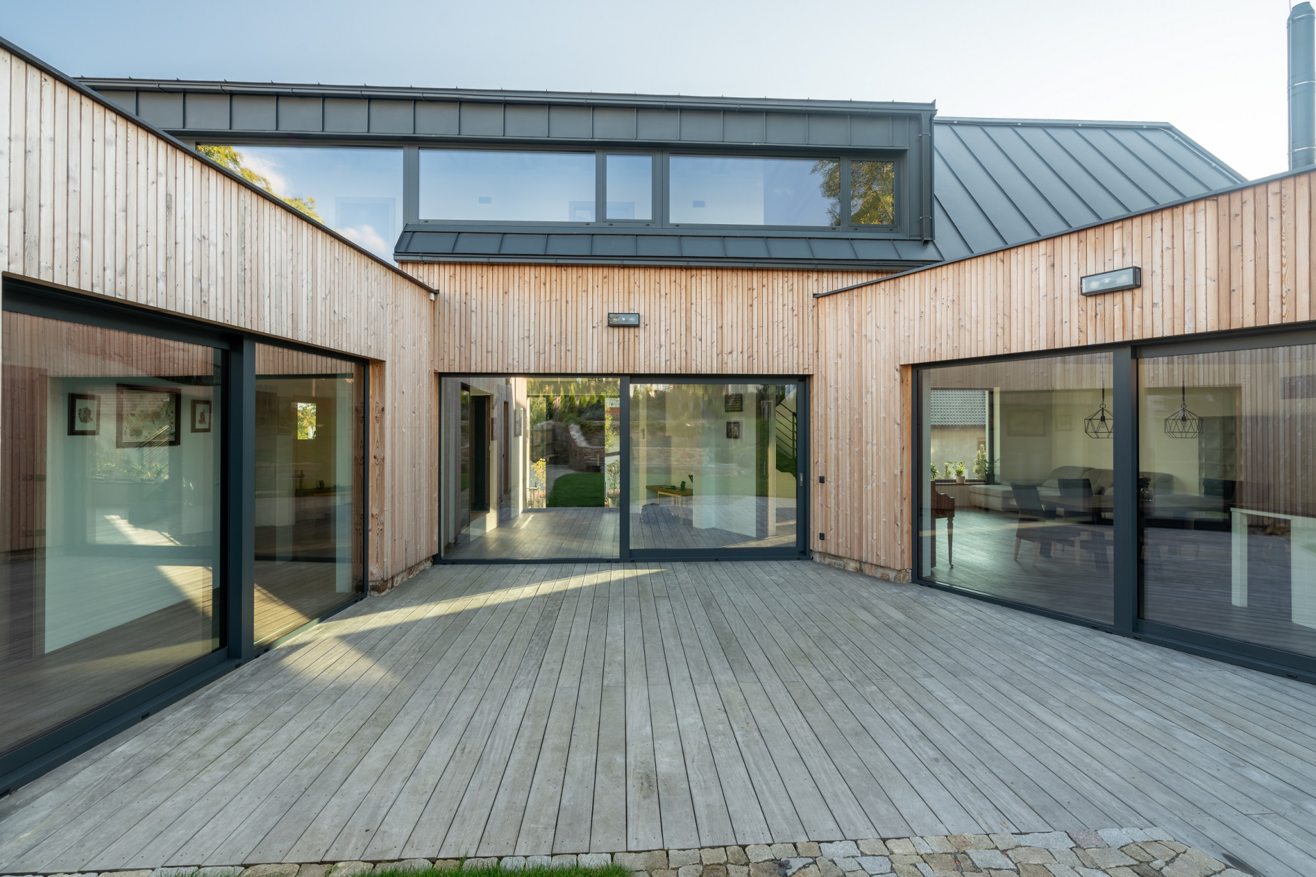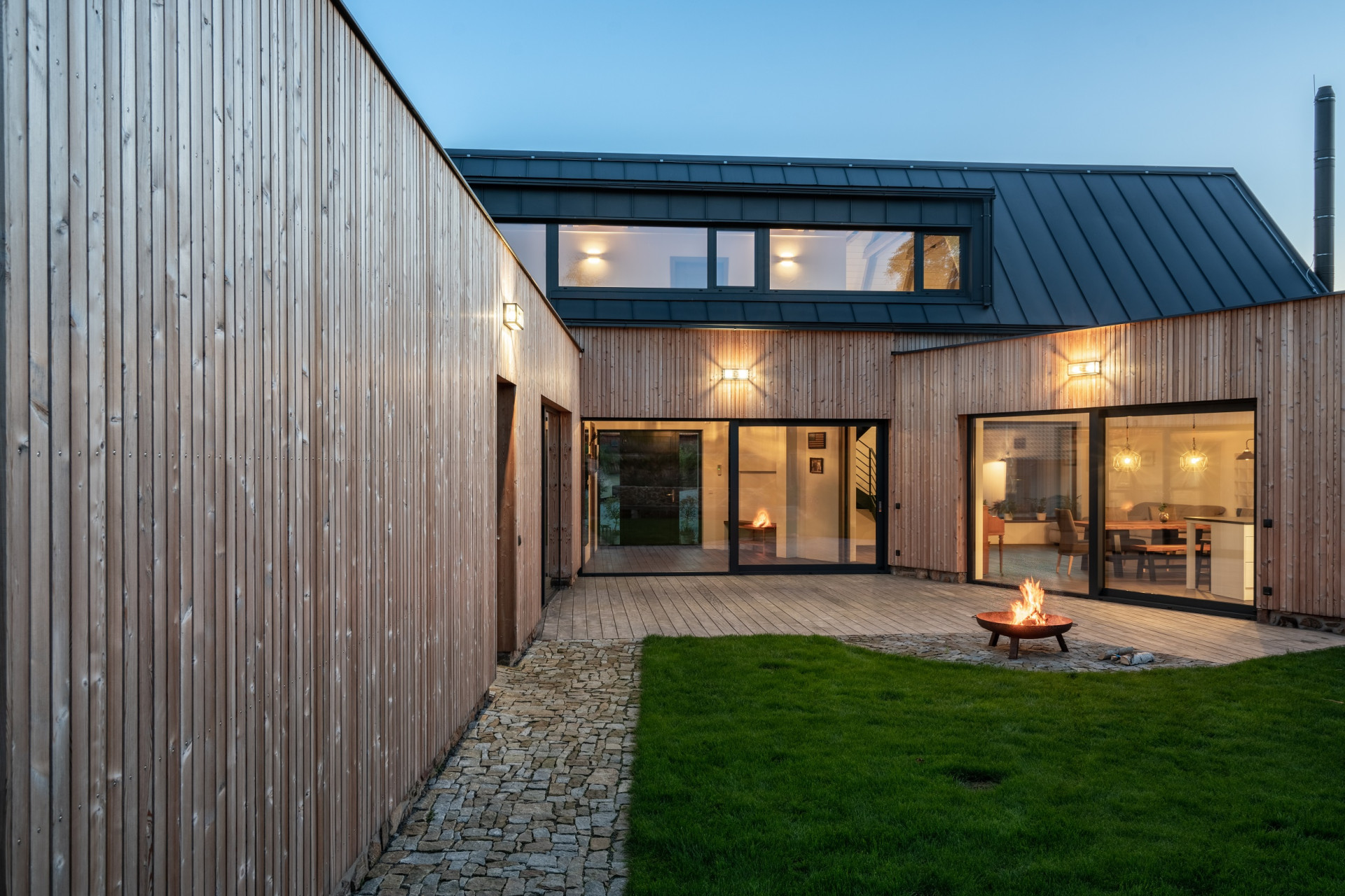Rodinný dům vyrostl na místě staršího objektu. Jeho původní pozici kopíruje hlavní trakt novostavby, ze které směrem do zahrady vybíhají dvě kratší křídla. Trojkřídlá struktura zde svírá vnitřní dvůr, kterým se táhne dřevěná pobytová terasa.