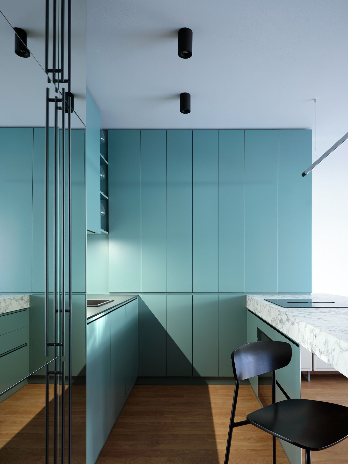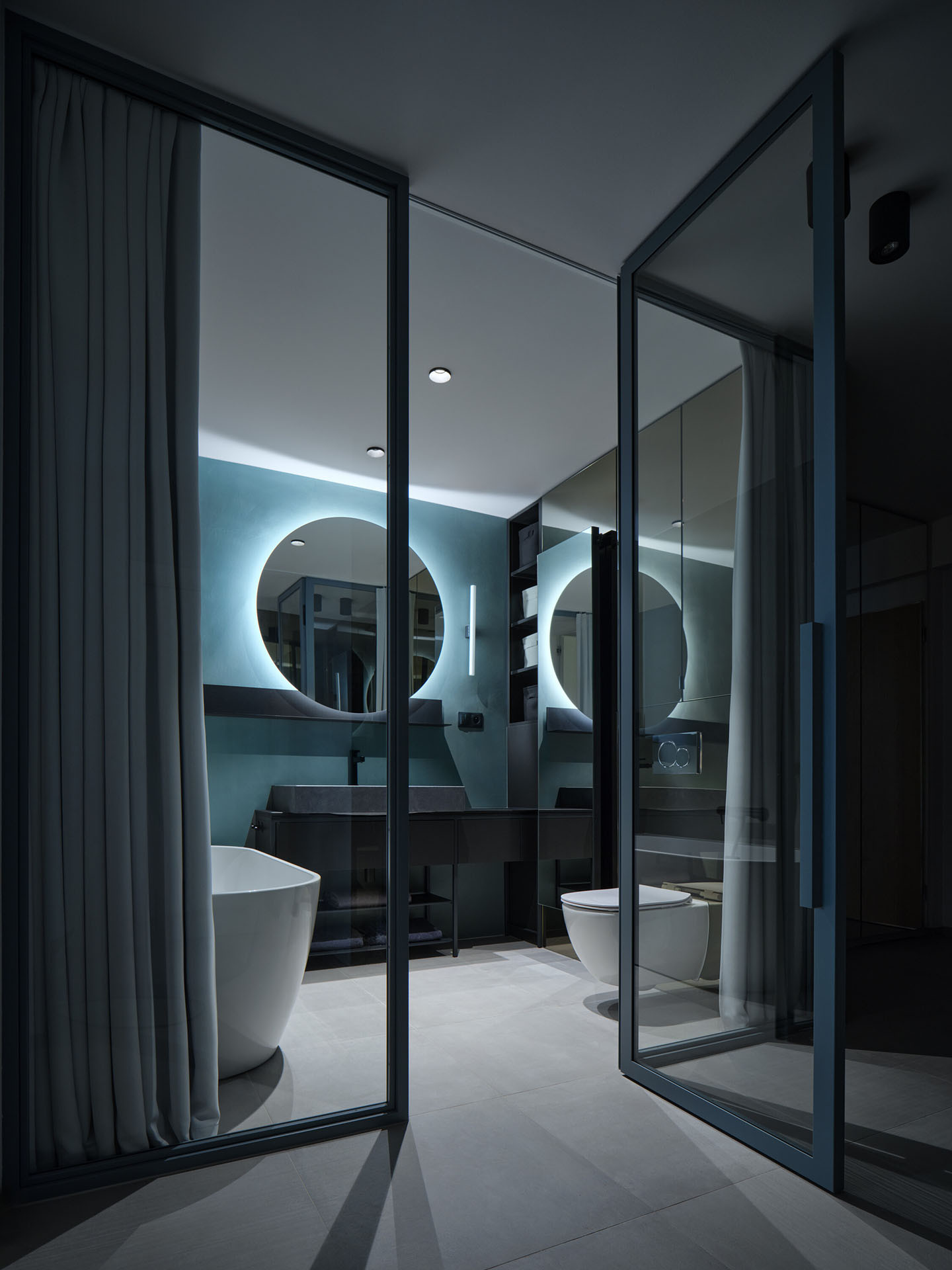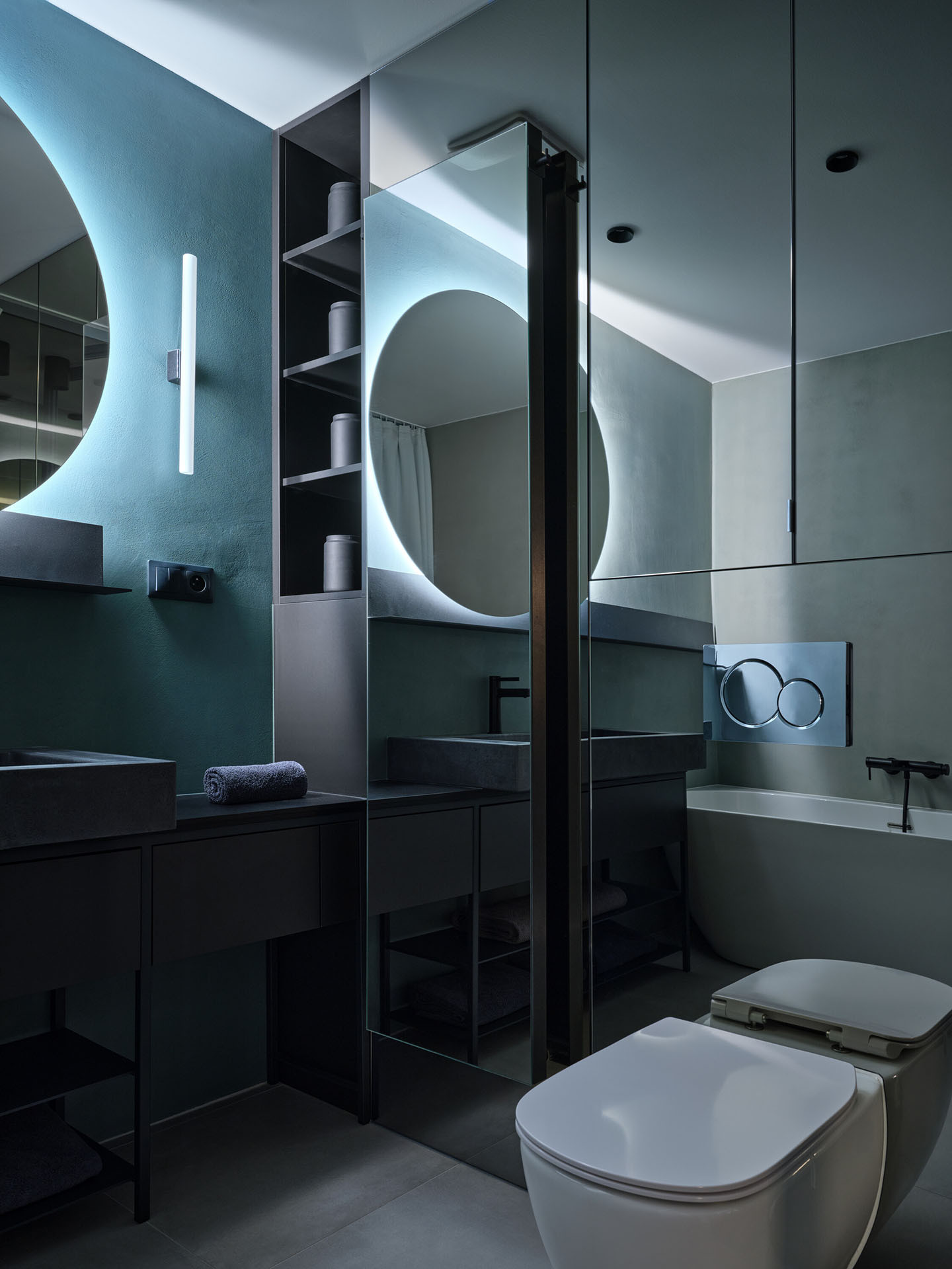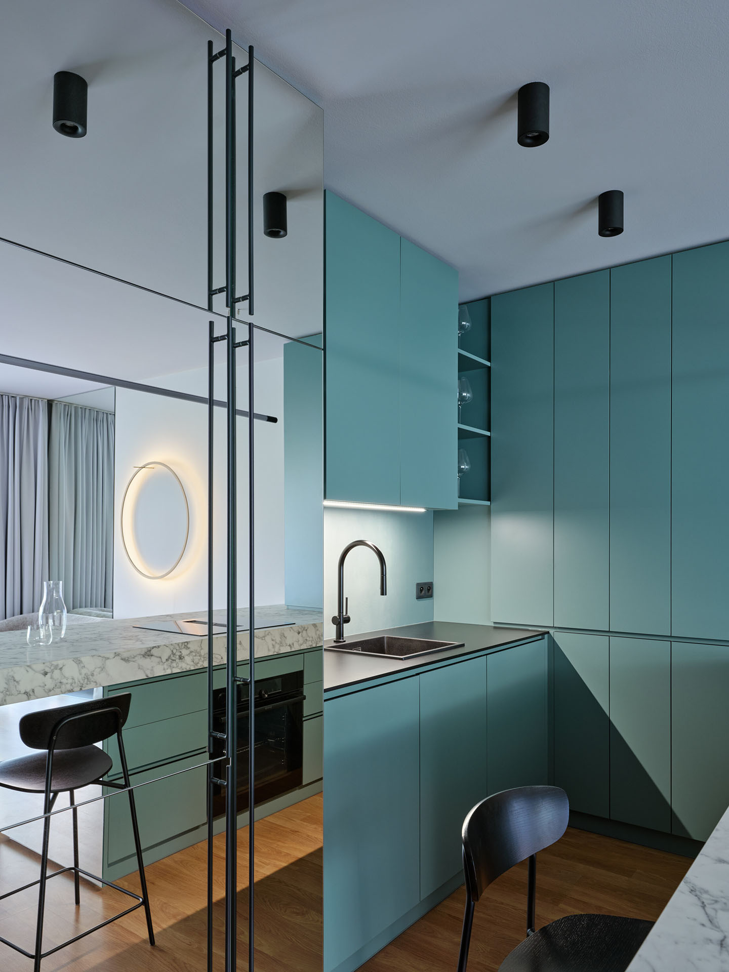 Zásadní roli v návrhu hraje práce se světlem a materiály. Zrcadlové plochy, epoxidová stěrka v odstínech šedé a petrolejové barvy a rafinovaně rozmístěné světelné zdroje přetvářejí kompaktní byt v dynamické a vizuálně poutavé prostředí.