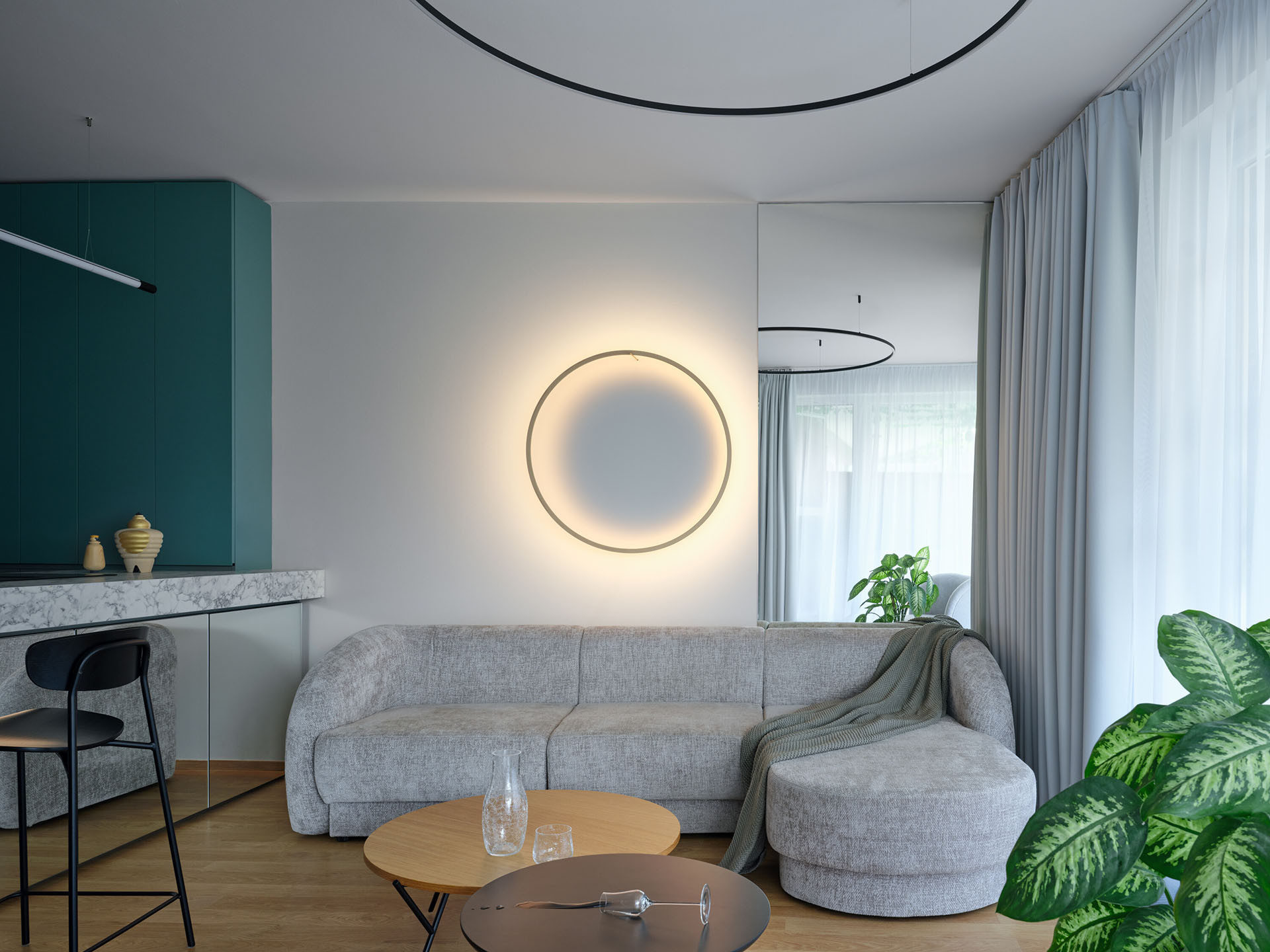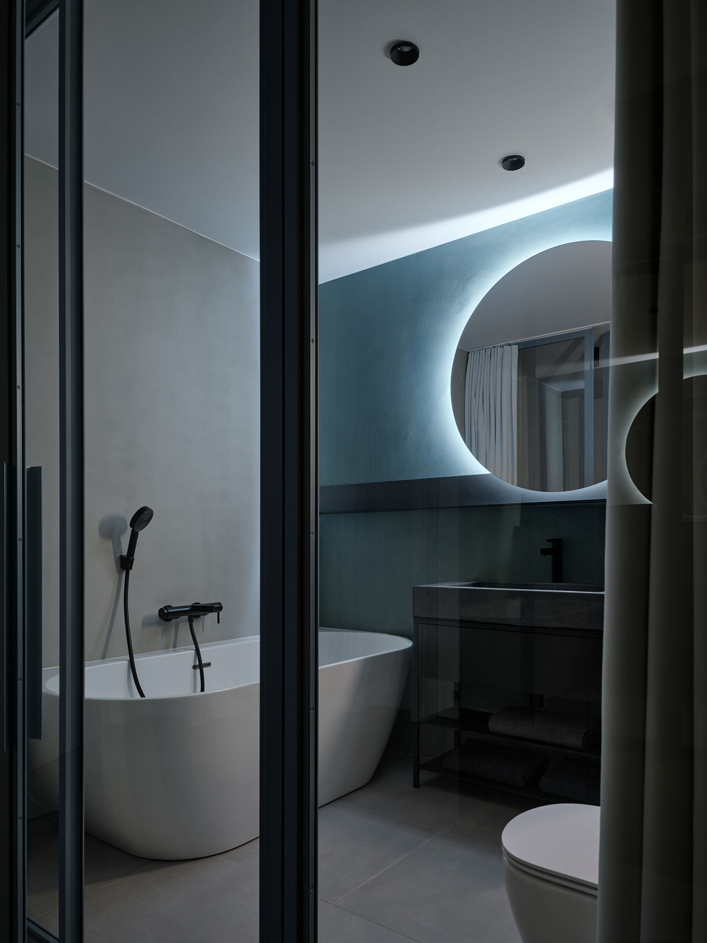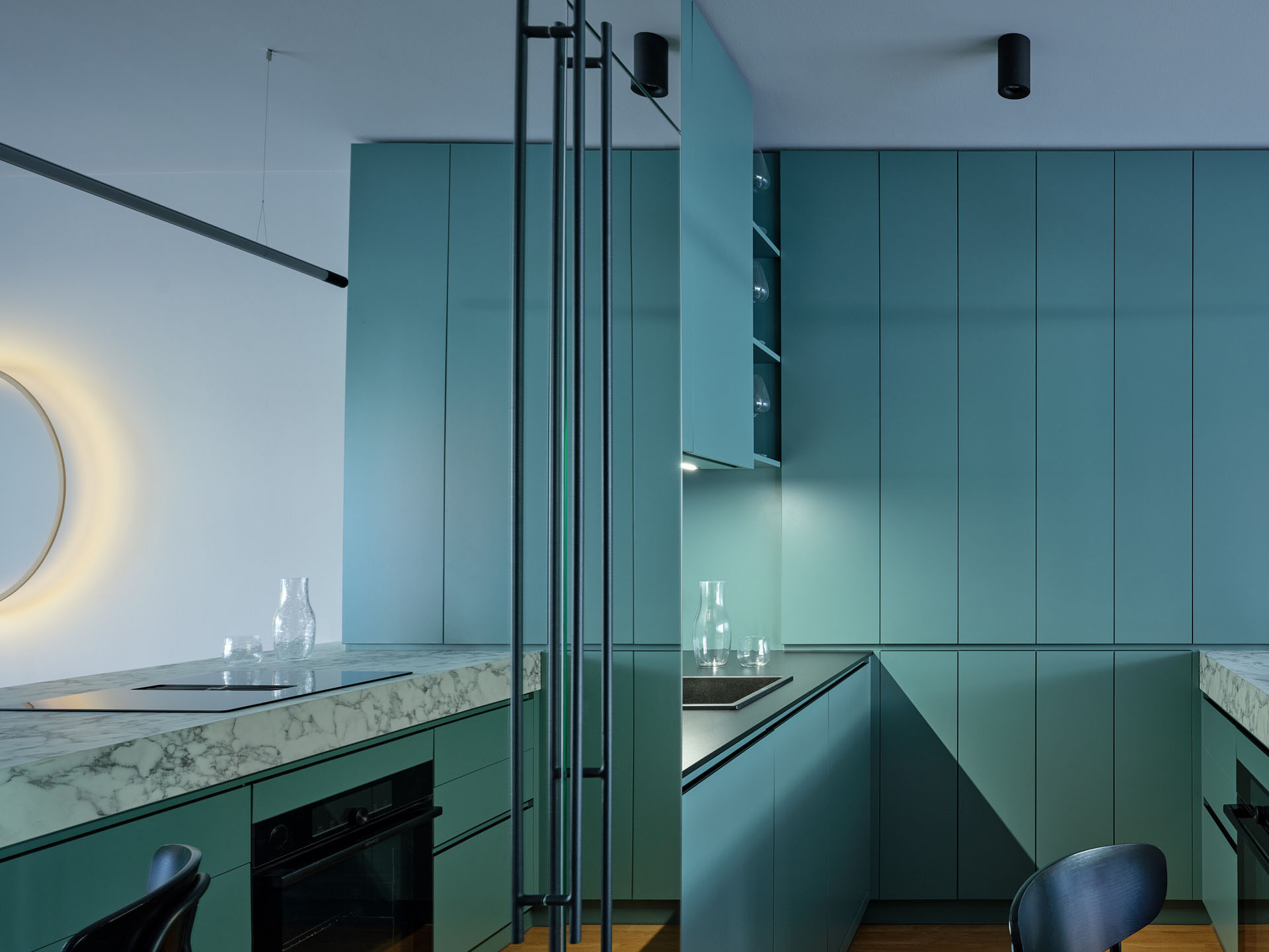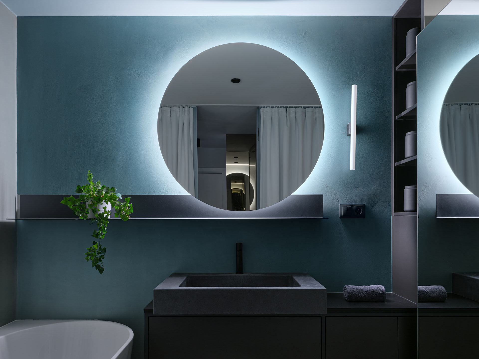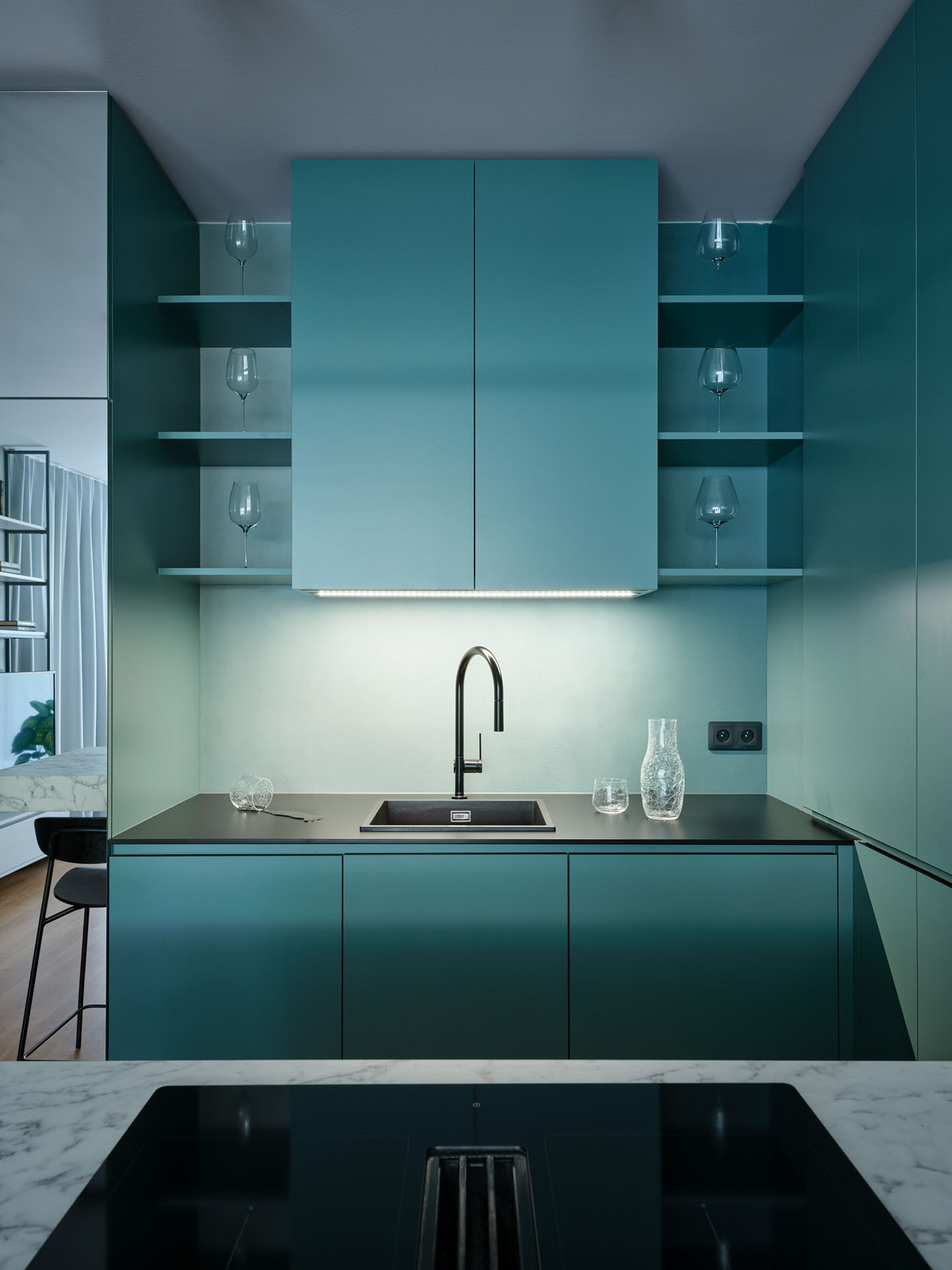 Zásadní roli v návrhu hraje práce se světlem a materiály. Zrcadlové plochy, epoxidová stěrka v odstínech šedé a petrolejové barvy a rafinovaně rozmístěné světelné zdroje přetvářejí kompaktní byt v dynamické a vizuálně poutavé prostředí.