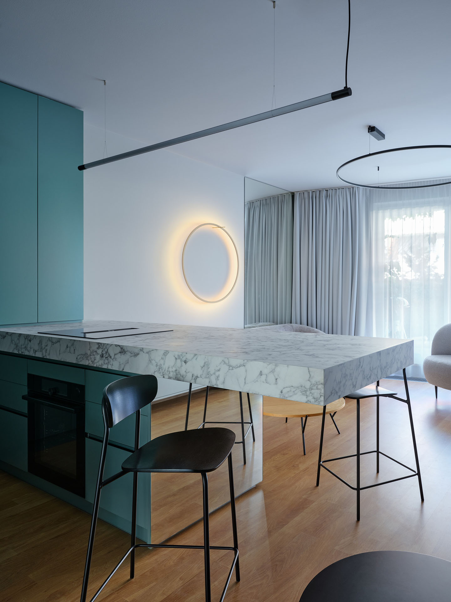 Kuchyňská linka zůstala na původním místě. Nový návrh ale přinesl větší funkčnost i estetickou hodnotu. Dominantou prostoru se stal kuchyňský ostrůvek s pracovní deskou v mramorovém dekoru, jehož zrcadlová podpůrná konstrukce opticky mizí. Barové sezení navazuje na koncept plynulého a vizuálně lehkého interiéru.