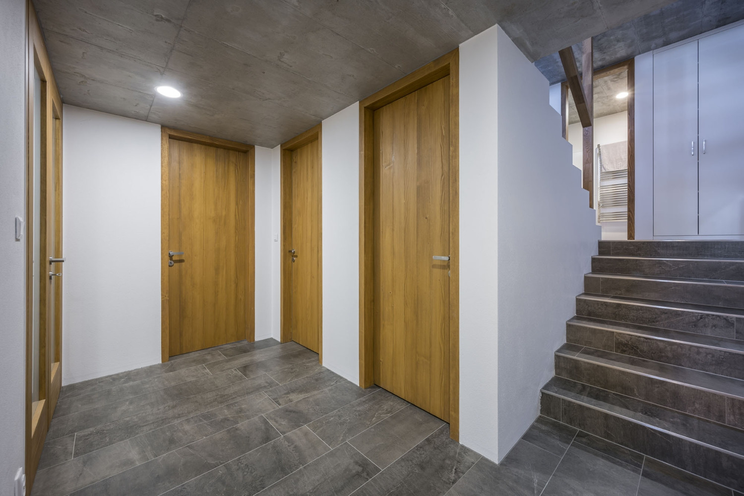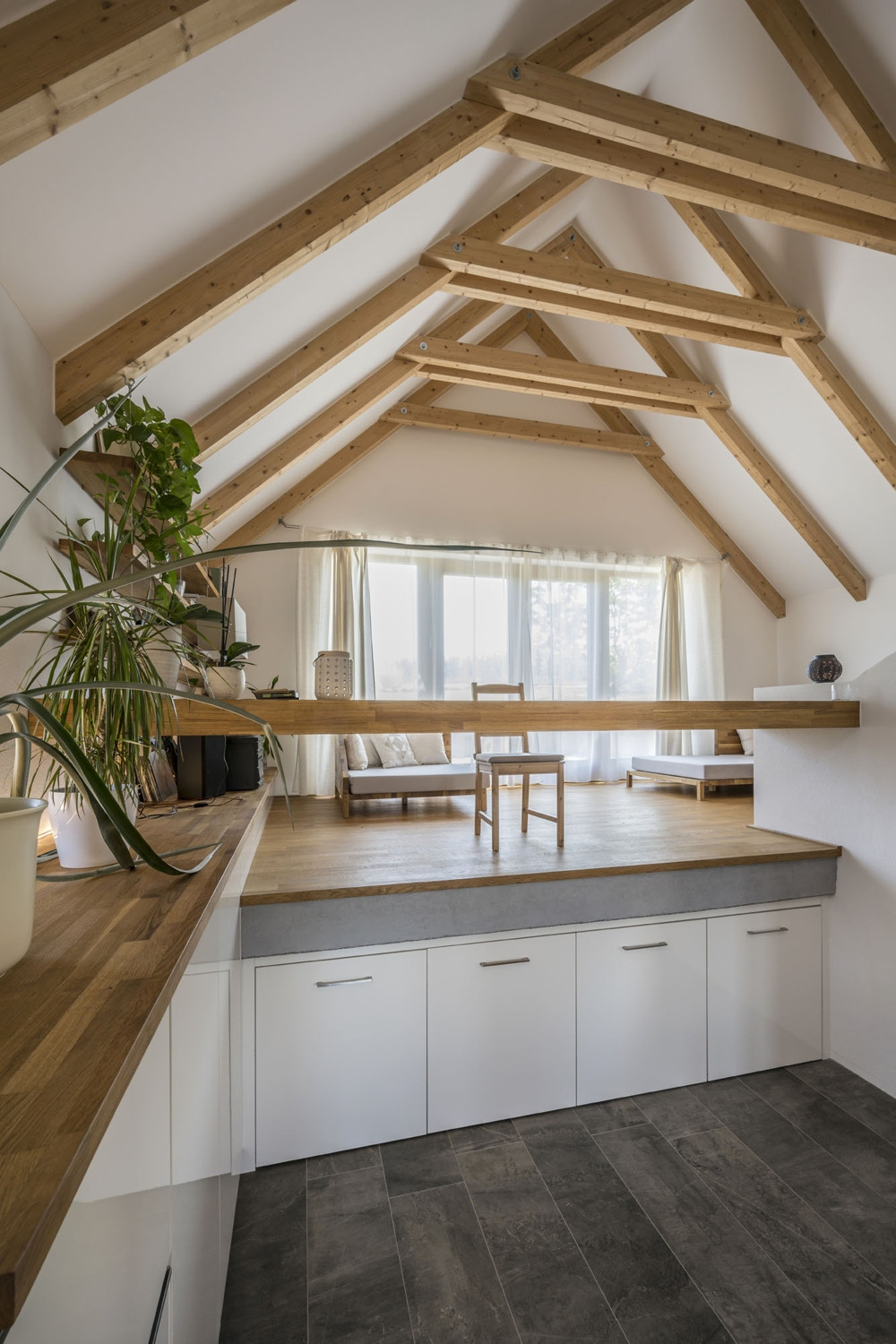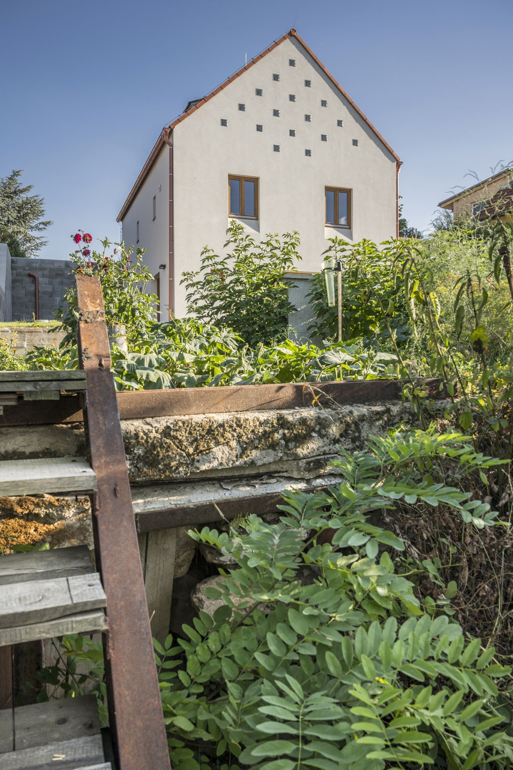 „Modré sklepy jsou památkovou zónou, proto jsme museli respektovat rozměrové a výškové omezení. Vnější stránka budovy byla rovněž daná – umístění oken, dveří, sedlová střecha. Zbořili jsme starou lisovnu a ponechali jsme zhruba stoletý sklep. Zadání od stavebníka? To bylo náročné ve více ohledech, zejména v tom, jak vměstnat na malý pozemek dvojnásob obytného prostoru. Veškeré možné stavební limity jsme museli vytěžit na maximum a plochu ještě zmenšilo to, že jsme chtěli ponechat starou meruňku. Vznikly tak dole tři „kajuty“, ložnice a zbytek je volný prostor na pěti patrech a 80 m2. Součástí zadání bylo i to, že zde nebude klasický obyvák ani televize a ve všech místnostech včetně koupelny musí být okno. „Jsou to v podstatě takové obytné schody,“ říká s nadsázkou architekt.