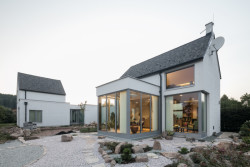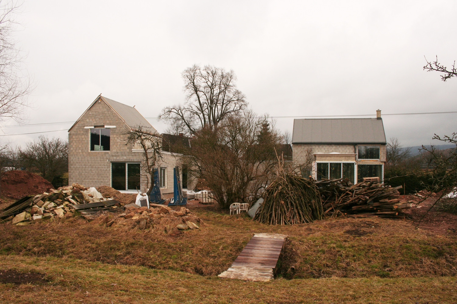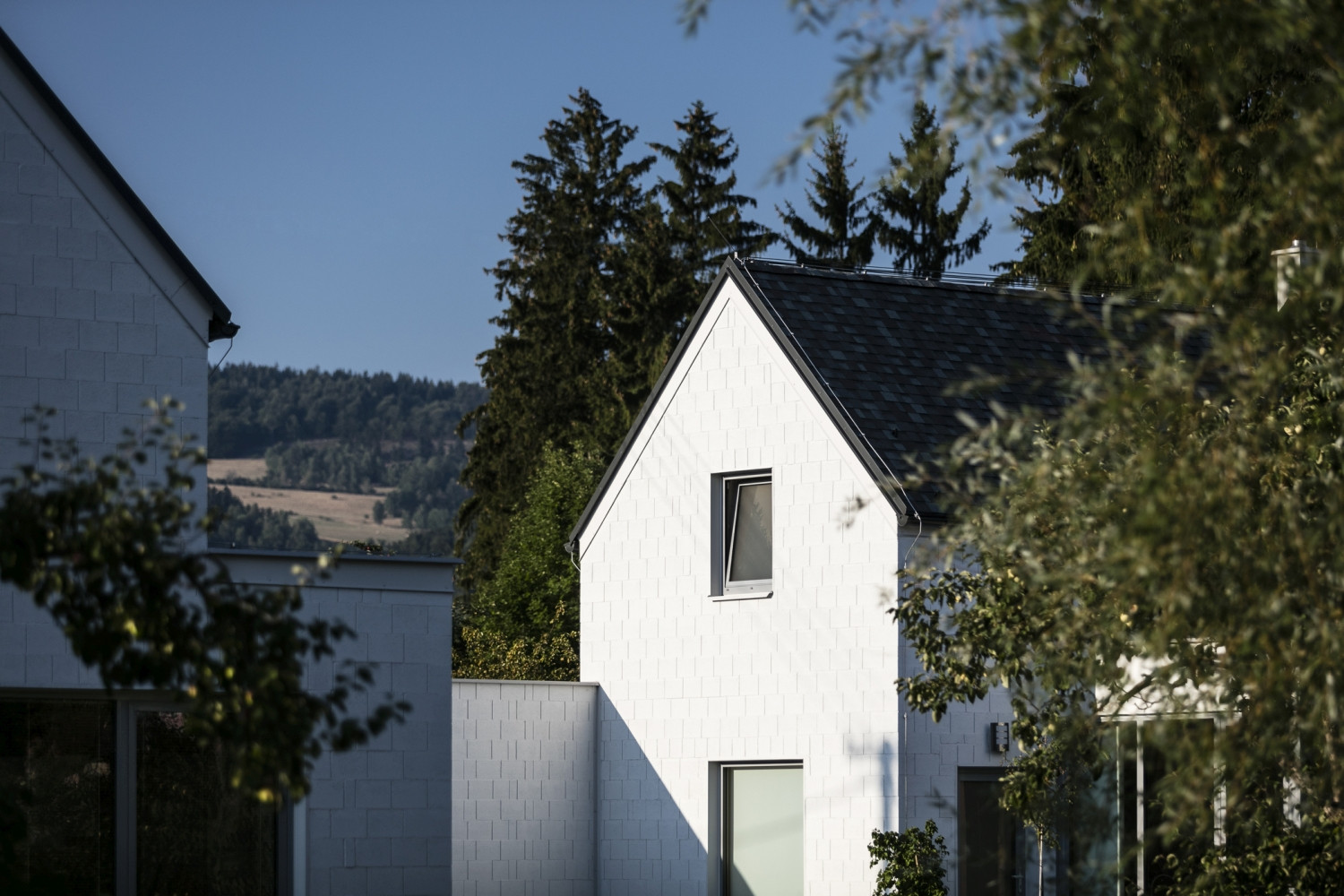 Dva dobří přátelé, dva podobné domy, velká společná zahrada zahrada, klid malého města. Před pár lety dokončilo pražské Studio Raketoplán v Rtyni v Podkrkonoší dvojici rodinných domů, které vzájemně propojuje bílá zeď zajištující stavbám soukromí a mírnící hluk z přilehlé silnice. Domy tvoří na bílo natřené betonové tvárnice. I když jsou si obě stavby na první pohled velmi podobné, každá svým majitelům nabízí jiný prostorový zážitek.