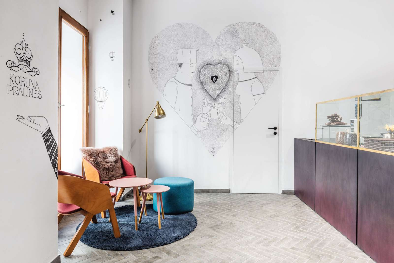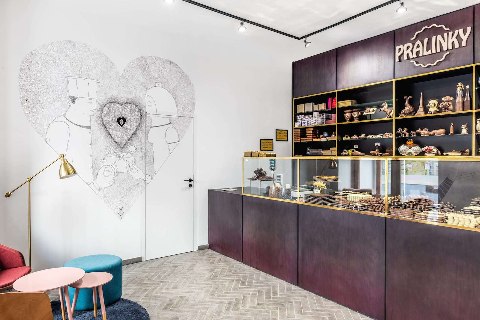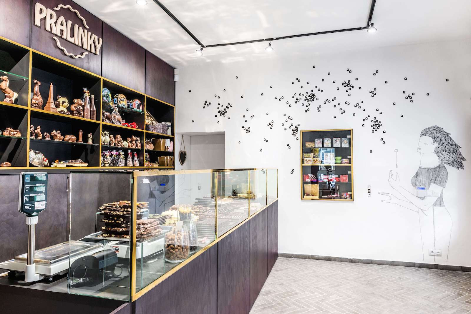 Architekt Michael Karnet vytvořil ve svém rodném městě Příbrami nový interiér prodejny čokoládových sladkostí. Dominantním prvkem prodejny je elegantní nábytek v barvě hořké čokolády s mosazným rámováním fungující jako výstavní skříň pro pralinky. Příjemnou atmosféru celého prostoru podtrhují ilustrace na stěnách od Matyáše Proška.
