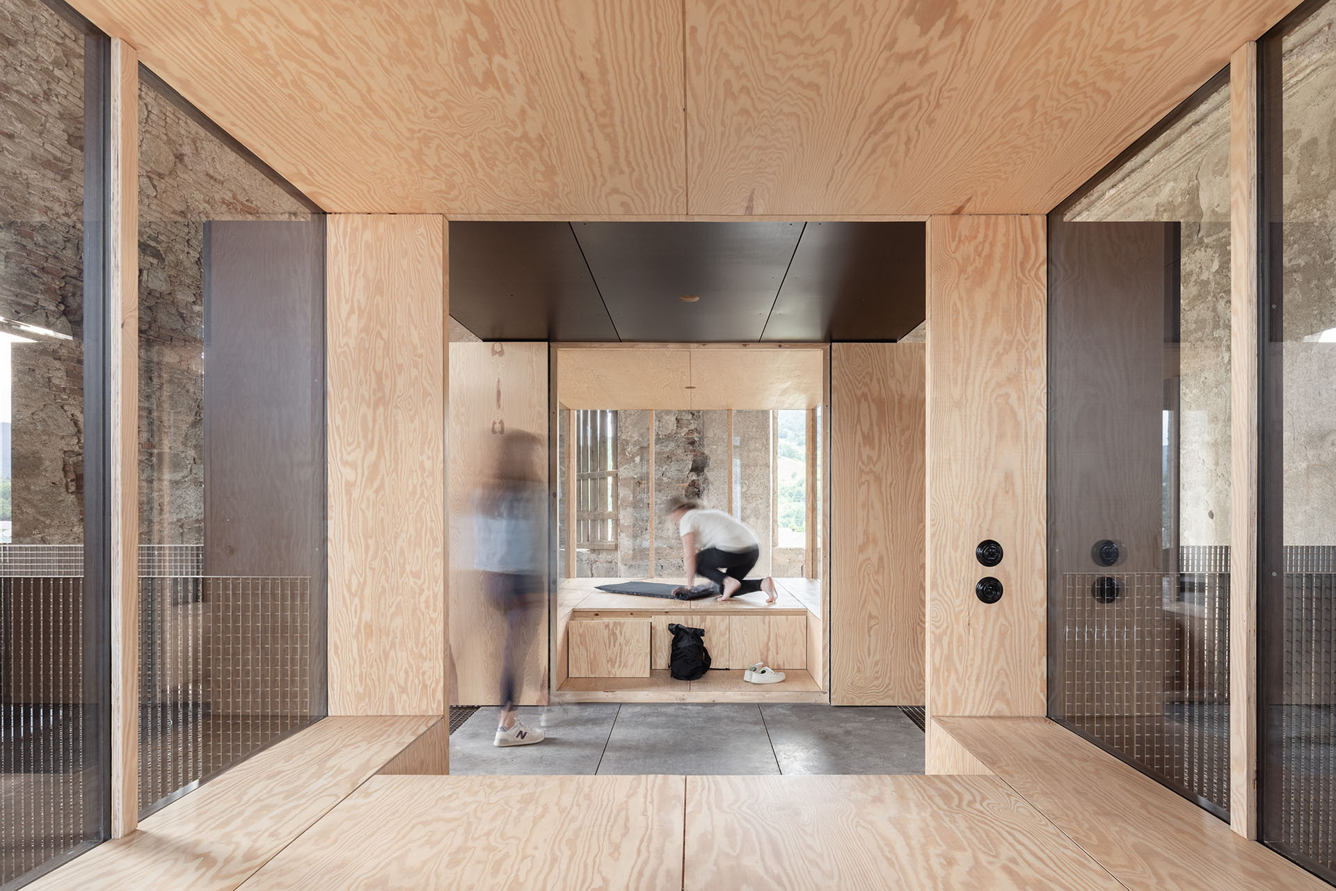 O projektu v Jelšavě jsme slýchali už od roku 2022, kdy vyhrál jednu z cen CEZAAR (Cenu Slovenskej komory architektov za architekturu). Jedná se o dvě „buňky“, útulny pro přespání, ke ketrým se přichází po můstcích z pororoštu. Sestava je překvapivá svým umístěním, nchází se na slovenském Gemeru ─ ve zchátralém kaštělu Koburků, který je už od 70. let prázdný. Pracovat se na buňkách začalo už před pěti lety, teprve teď se ale podařilo uvést je do provozu.