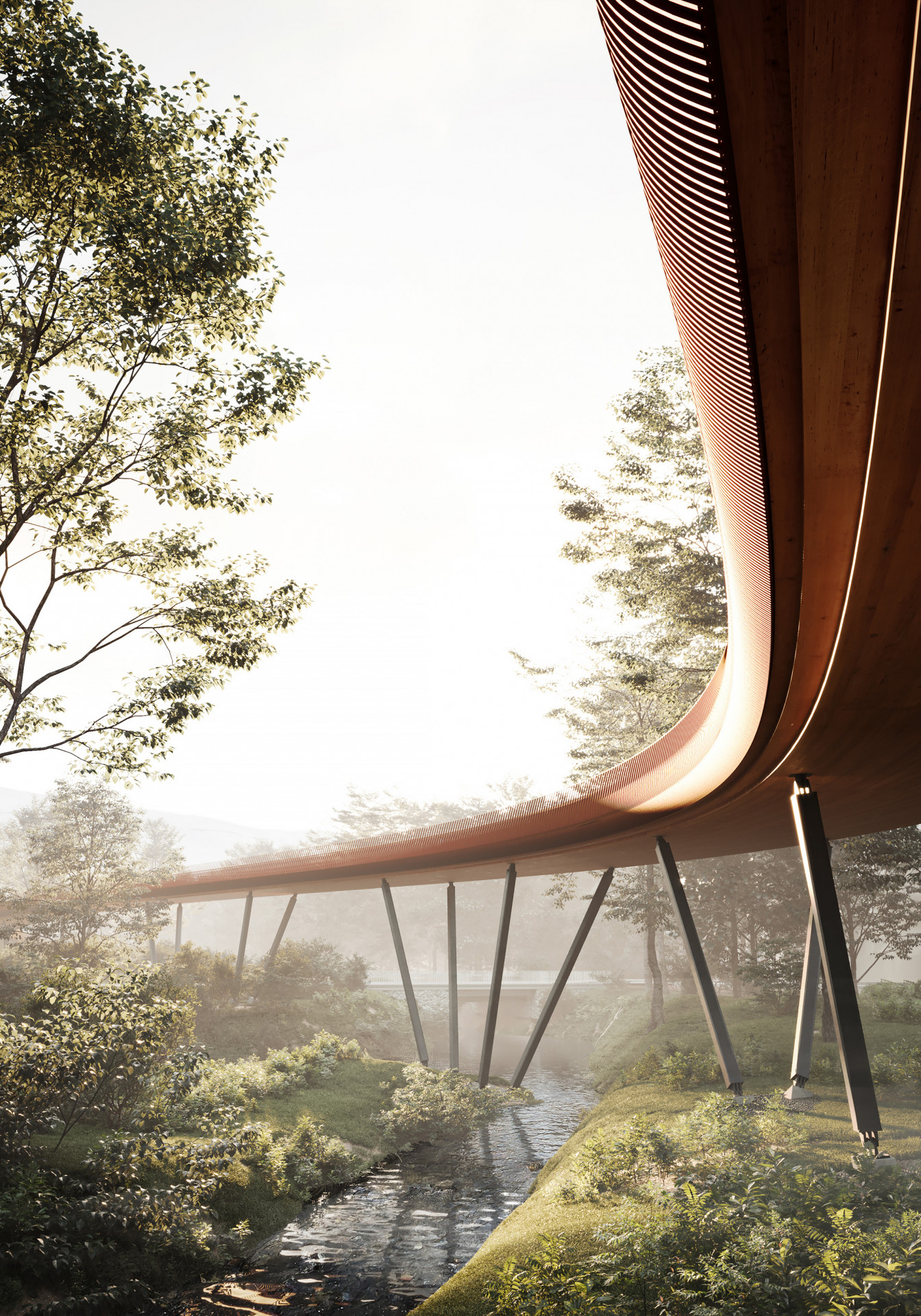 Navržený tvar lávky je inspirován svým přírodním prostředím a dále využívá šetrný přírodní konstrukční materiál (lepené lamelové dřevo). Zvolený materiál umožnuje využití lehčí mechanizace výstavby a omezuje dopad projektu na životní prostředí a jeho uhlíkovou stopu. Délka mostu je přibližně 325 metru a jeho konstrukce je navržena jako spojitý nosník s rozpětím od 13 do 15 metrů. Šířka 450 mm vysoké mostovky se pohybuje od 4,5 m do 6,5 m a je rozdělena na 20-24 m dlouhé úseky, které jsou spojeny ocelovými spoji. Mostovka z lepeného lamelového dřeva je podepřena na šikmých ocelových sloupech, jejichž sklon má minimalizovat stopu v parku a zachovat maximální rozpětí 15 metrů každé sekce. Stabilitu mostu v podélném směru zajišťují dvojice vzájemně nakloněných podpěr.