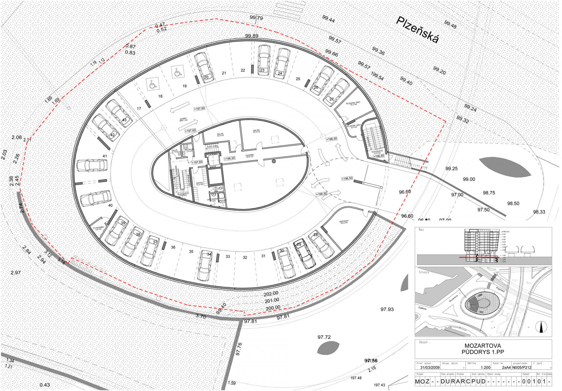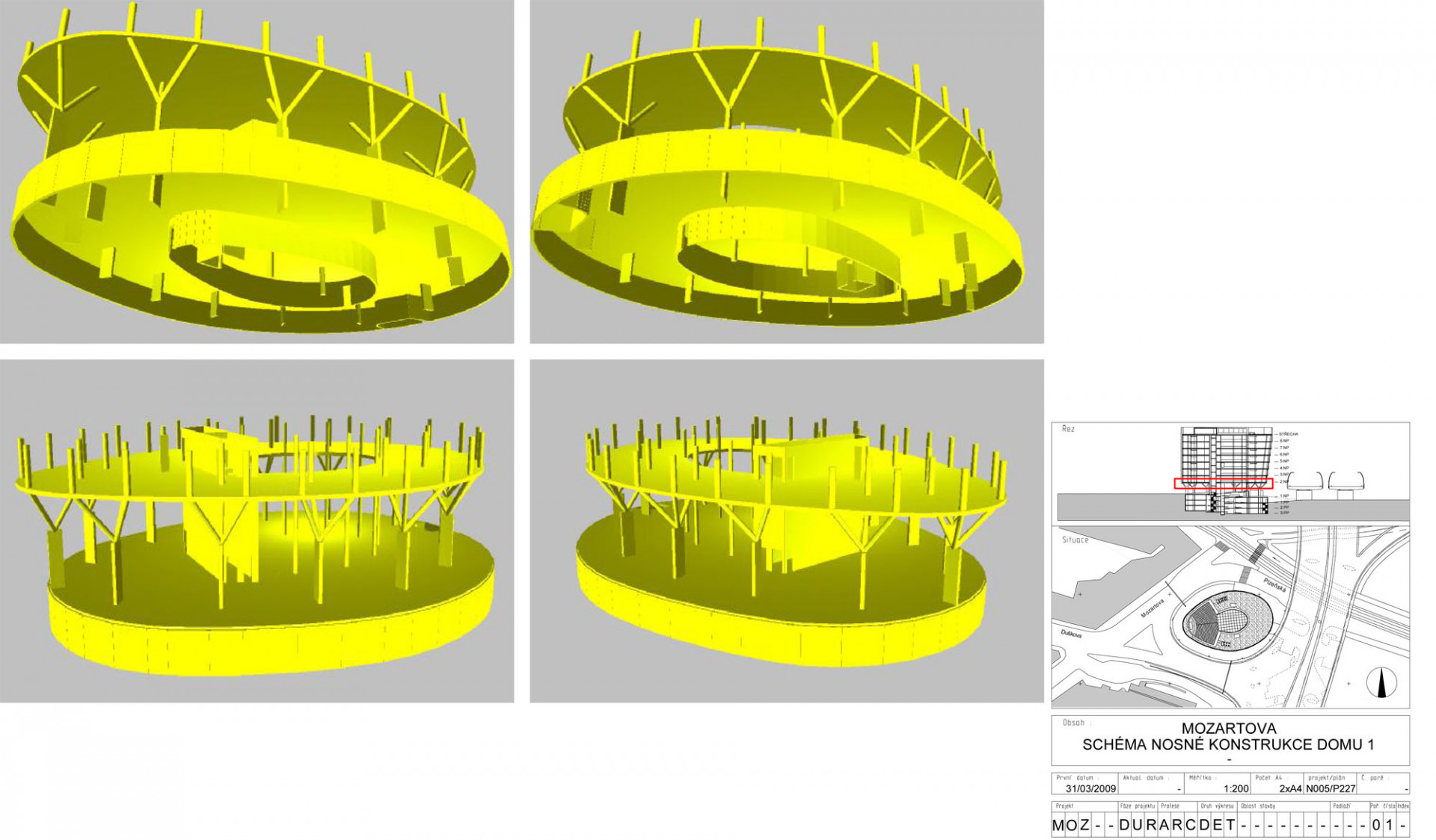 Budova oválného půdorysu o osmi nadzemních a třech podzemních podlažích nabízí přibližně 6500 m2 kancelářských ploch a tři patra podzemních garáží. Různé rozpony sloupů v garážích a kancelářích stejně jako rozdílnost tvarů obvodu garáží a nadzemních podlaží vedly k uplatnění trojklanných sloupů, které vynášejí vnější i vnitřní obvod spirály.