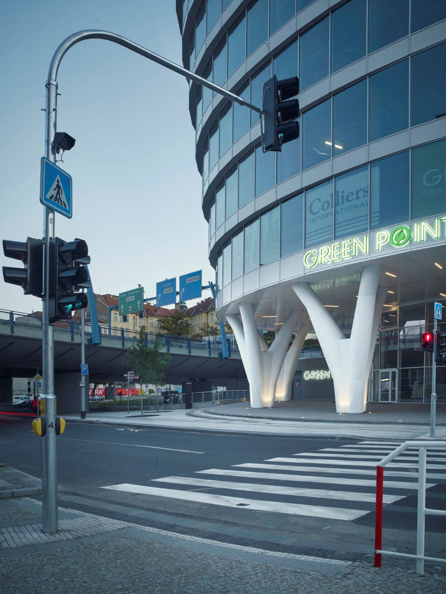 Administrativní budova Green Pointu obsadila pozemek v rámci urbanisticky mimořádně komplikované lokality pražského Smíchova. Návrh z dílny kanceláře AHK architekti charakterizuje oválná hmota s výraznými větvenými sloupy, přičemž svým vejcovitým tvarem reaguje na spirálu rampových sjezdů do Plzeňské ulice.