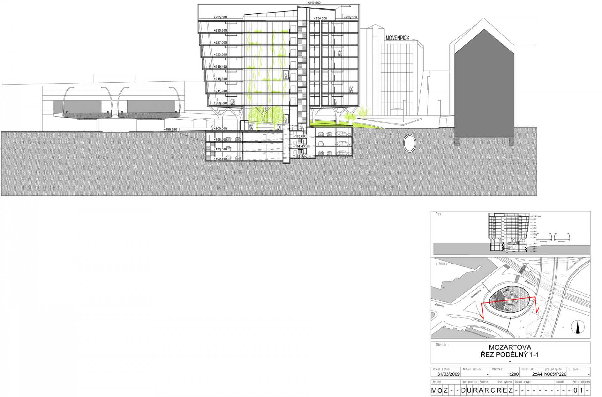 Autorský tým AHK architekti pod vedením Zdeňka Hölzela si od počátku práce na projektu dobře uvědomoval jak konstrukčně-provozní omezení, tak narušené urbanistické souvislosti tohoto místa. První projekt vejcovitého půdorysu s vnitřním atriem vznikl již v roce 2007, kdy zde měla původně vzniknout depandance tehdejšího hotelu Mövenpick. Hotelová krize ovšem donutila investora tento záměr přehodnotit, takže na tomto místě nakonec vyrostla administrativní budova.
